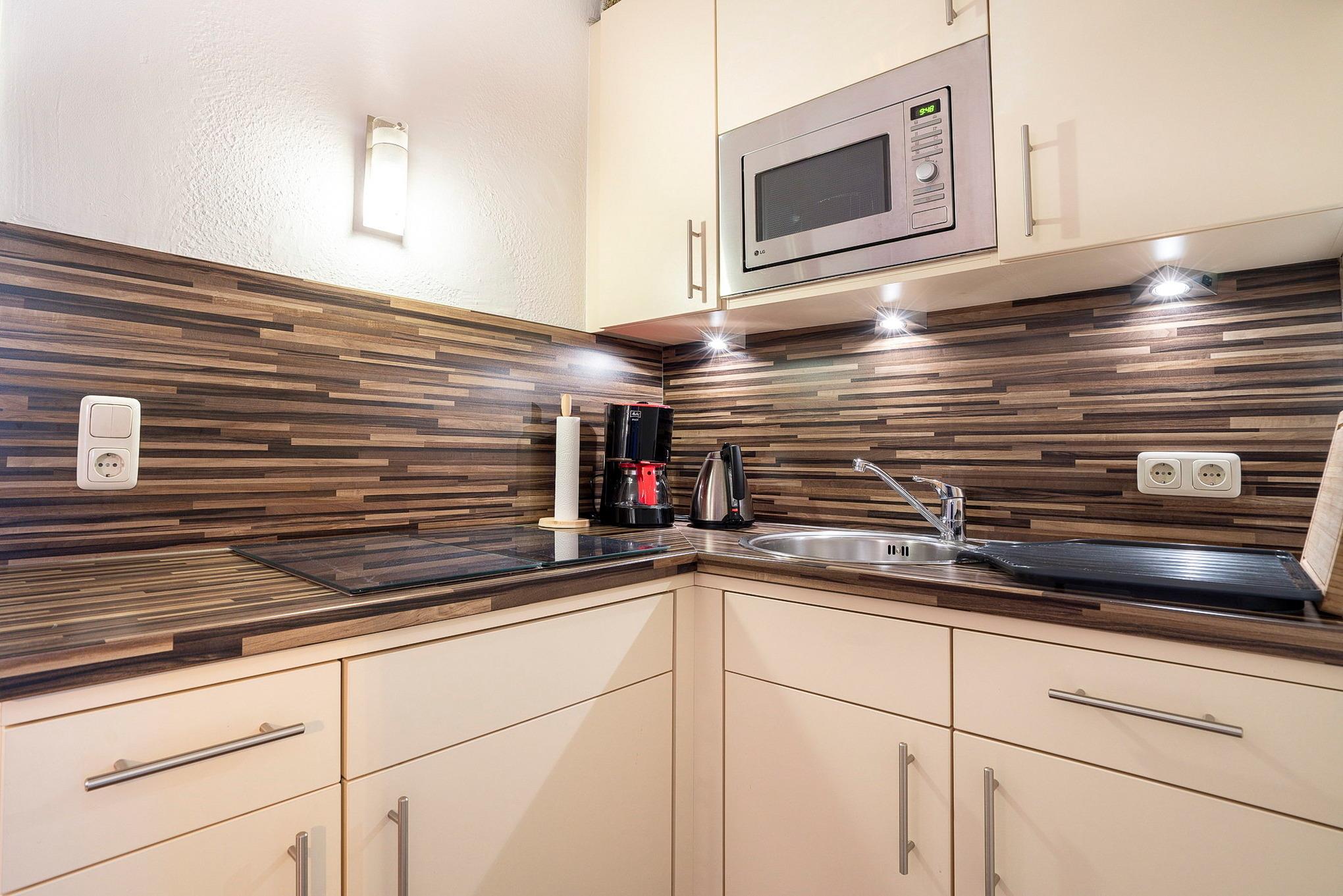 Zum Wohn- und Esszimmer offene, komplett eingerichtete Küche mit 4 Flammen Ceran-Kochfeld, Kühlschrank mit 3-Sterne Gefrierfach, Mikrowelle mit Grill-Funktion, Wasserkocher, Toaster und Kaffeemaschine.