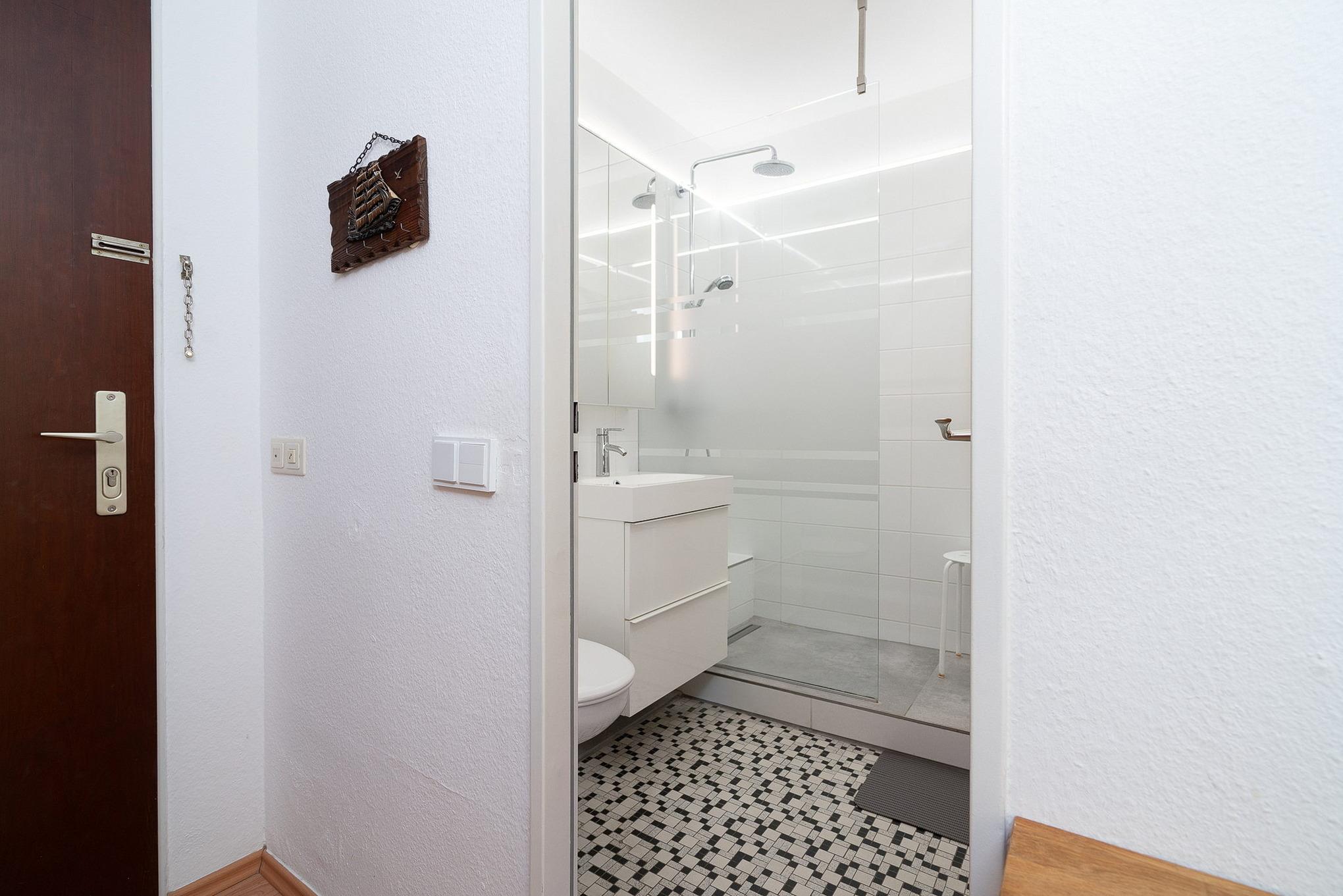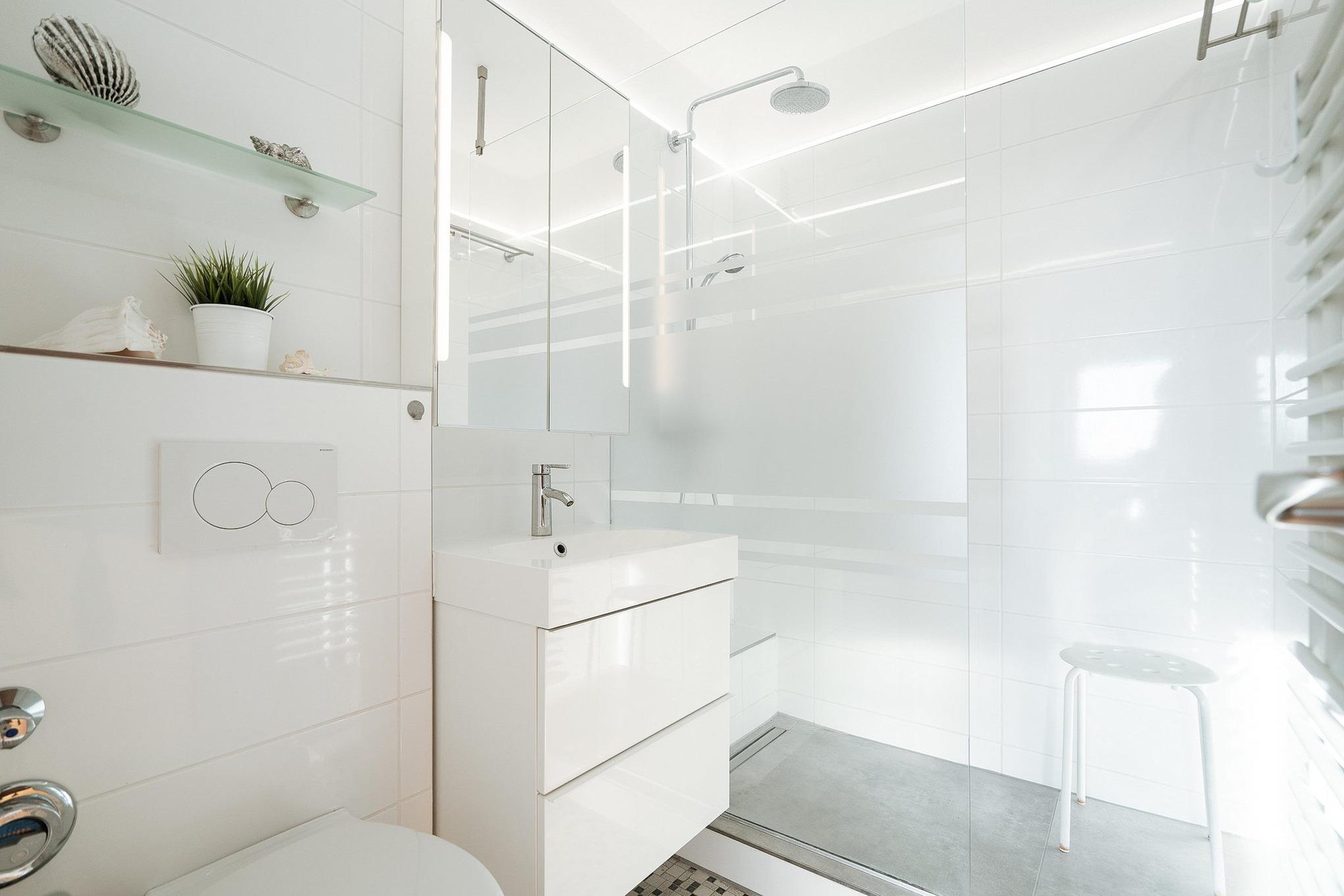Modernes, helles und freundliches Badezimmer mit einer bodentiefen Dusche, einem Waschbecken und einem WC.