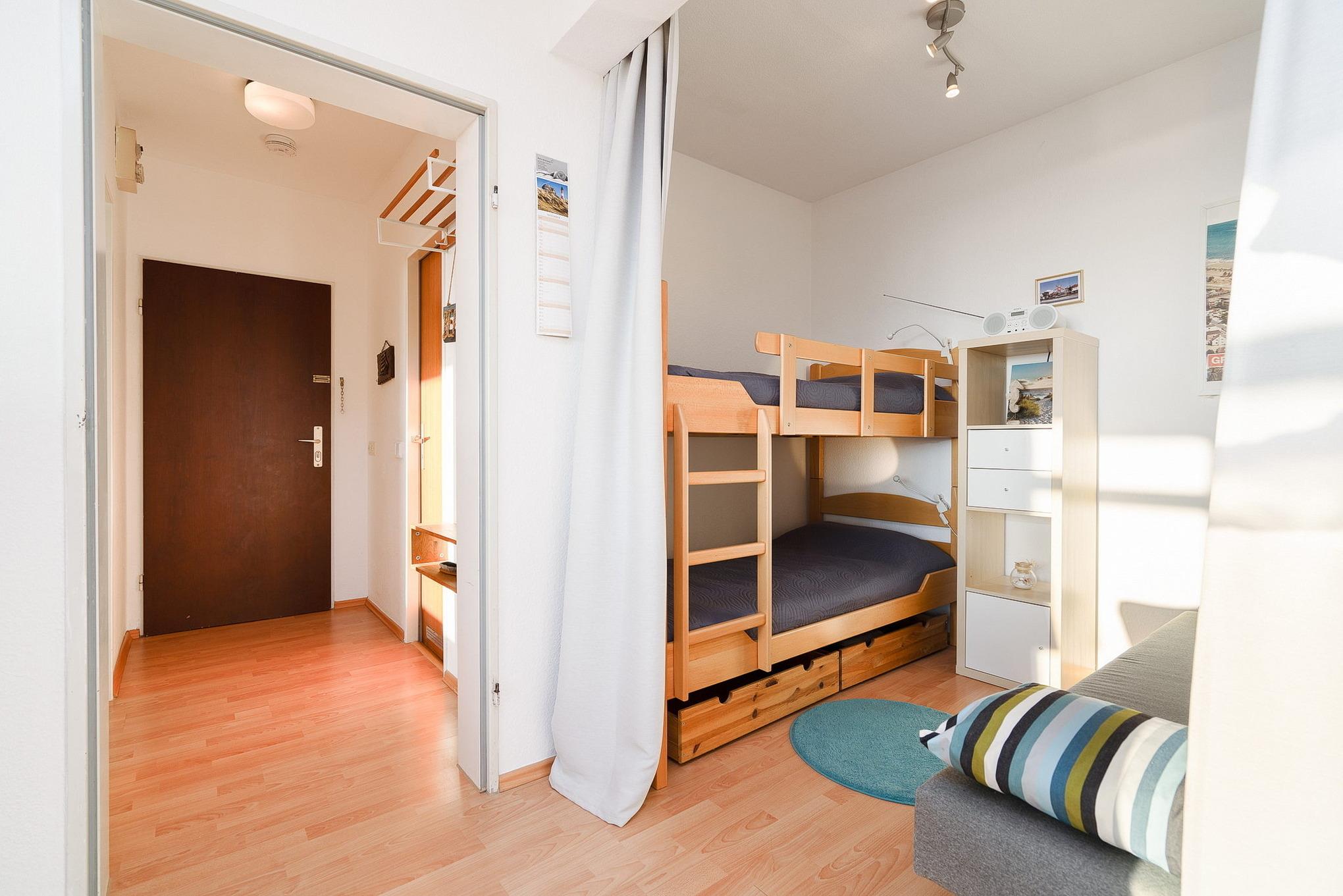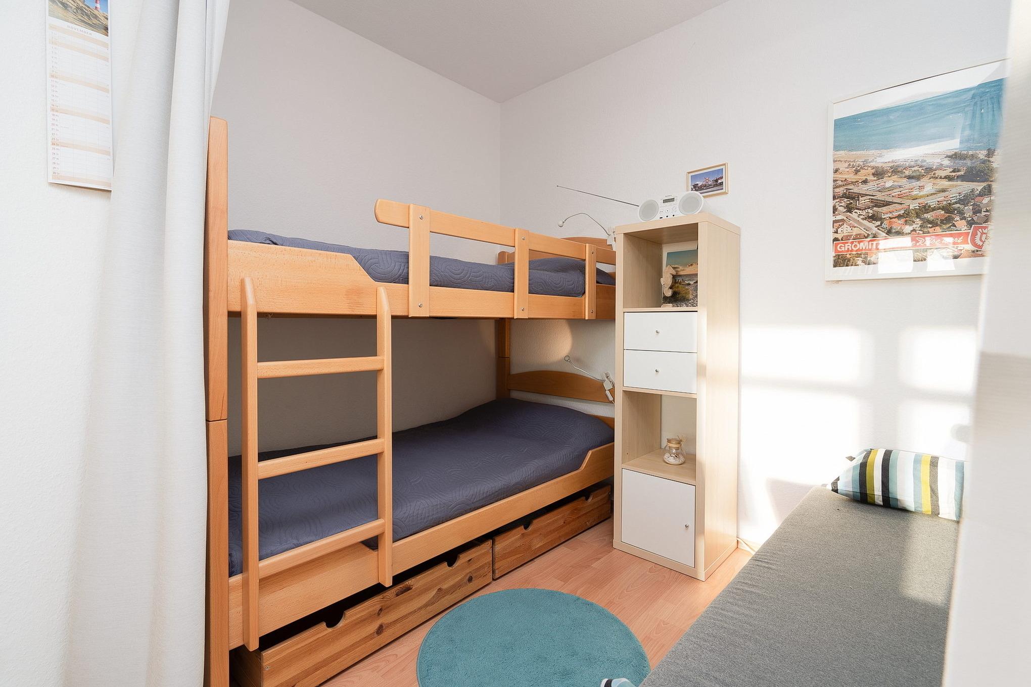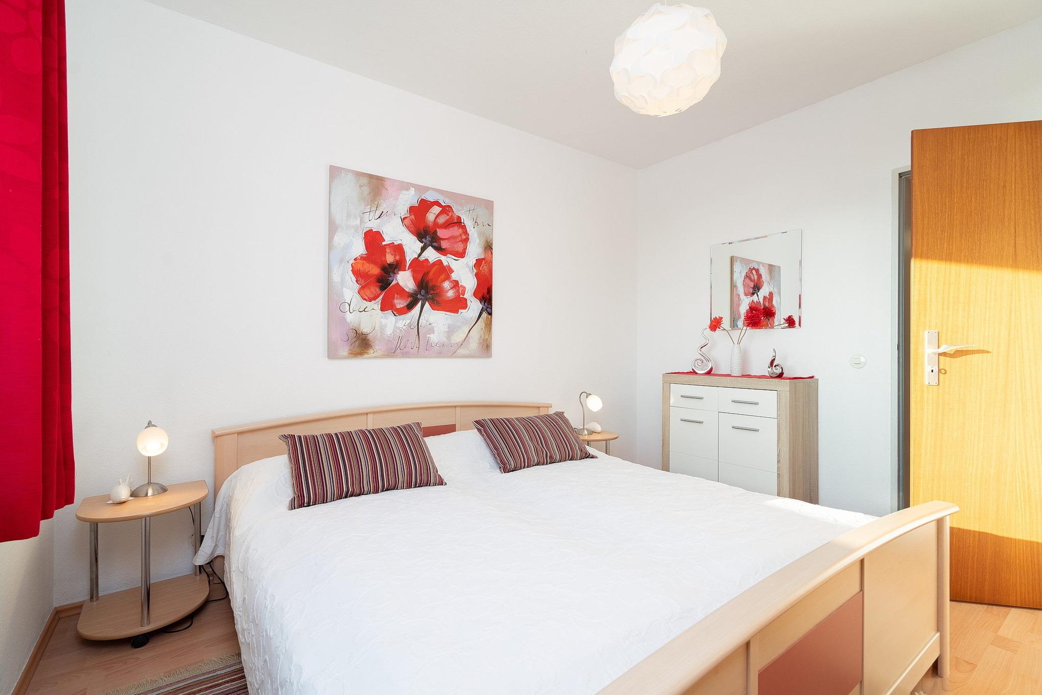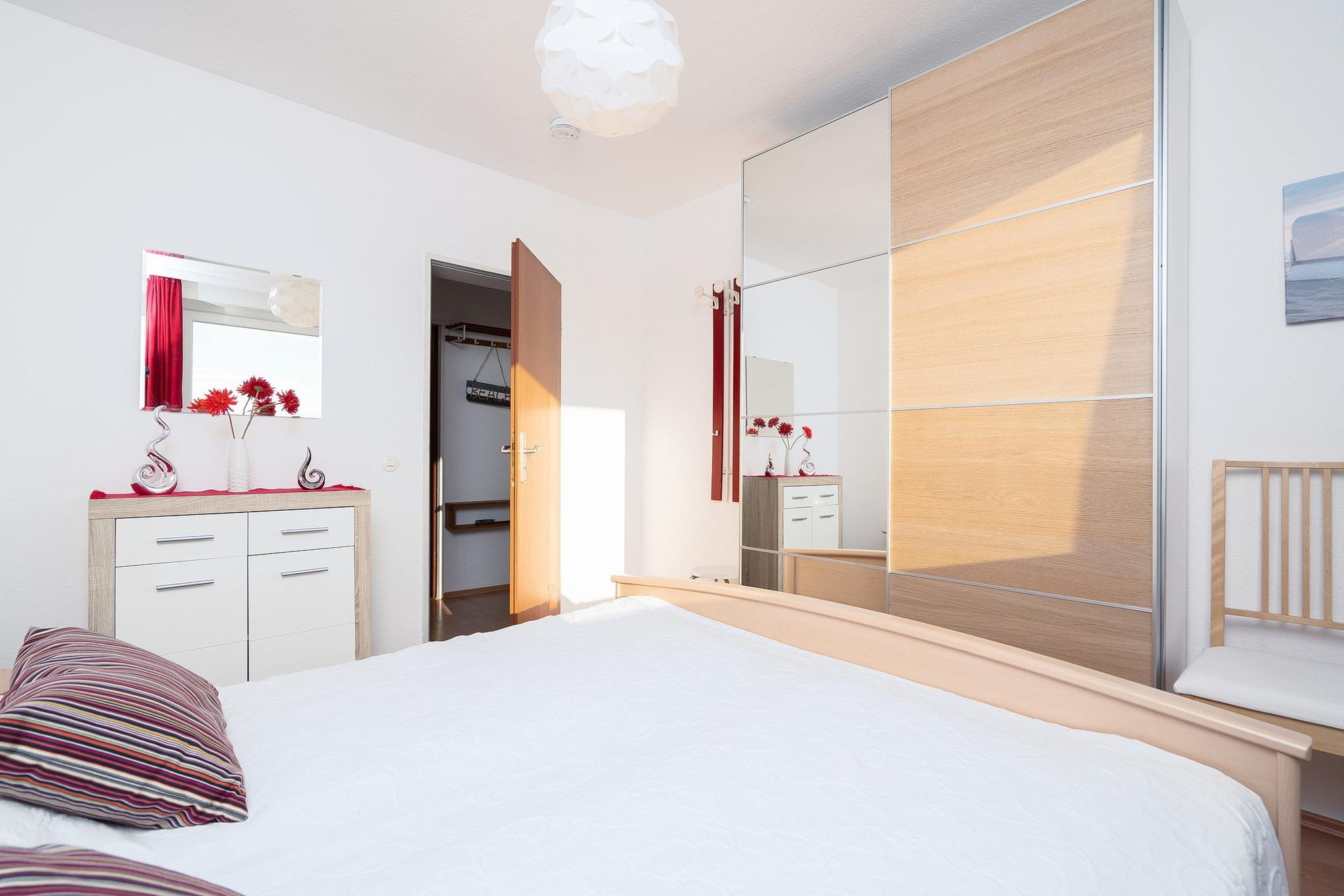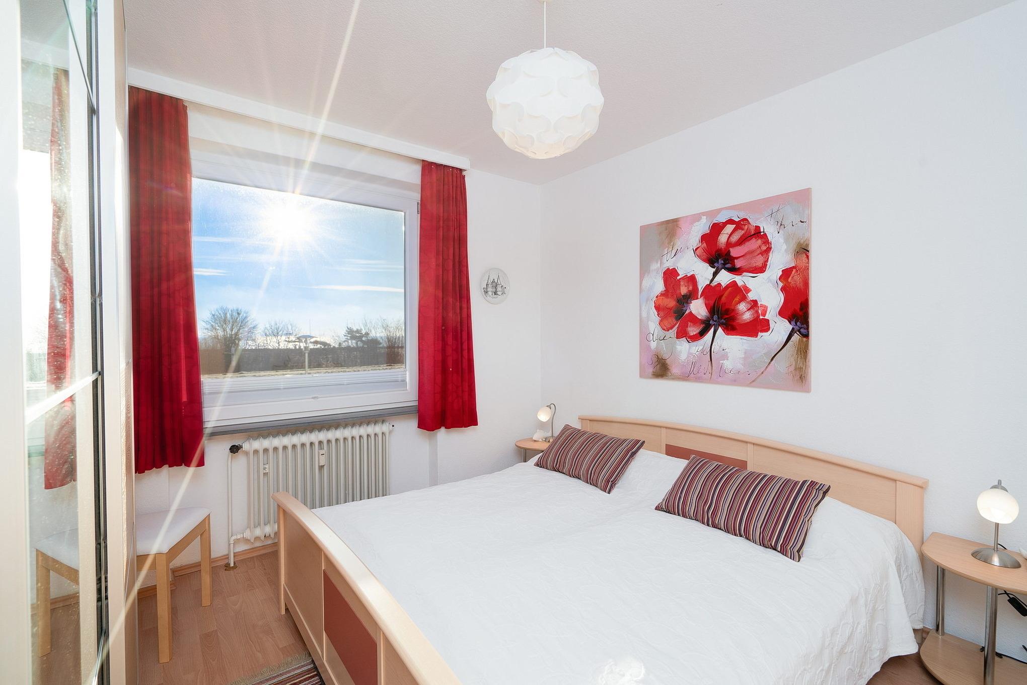 Das gemütliche Schlafzimmer ist mit einem Doppelbett (2x90x200cm) und einem Kleiderschrank ausgestattet. Das Schlafzimmer ist mit Laminatboden ausgelegt.