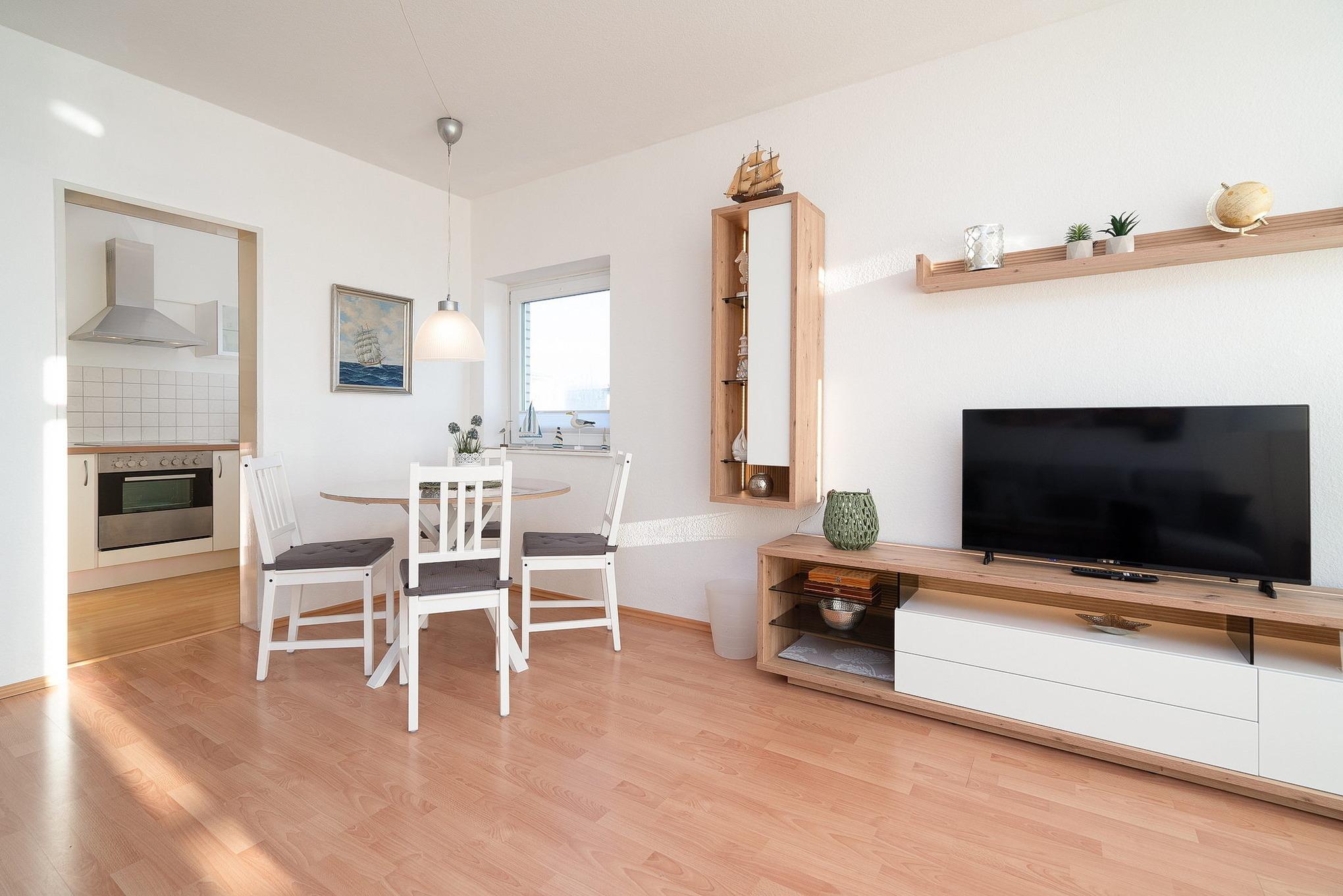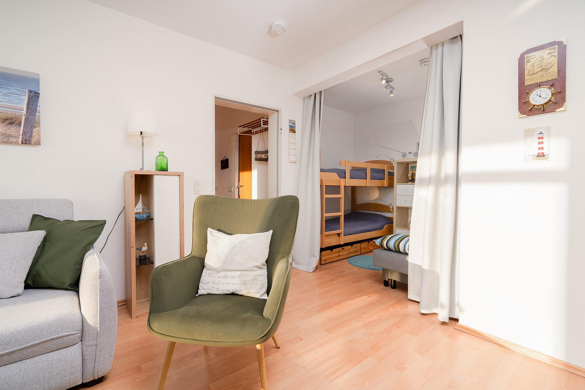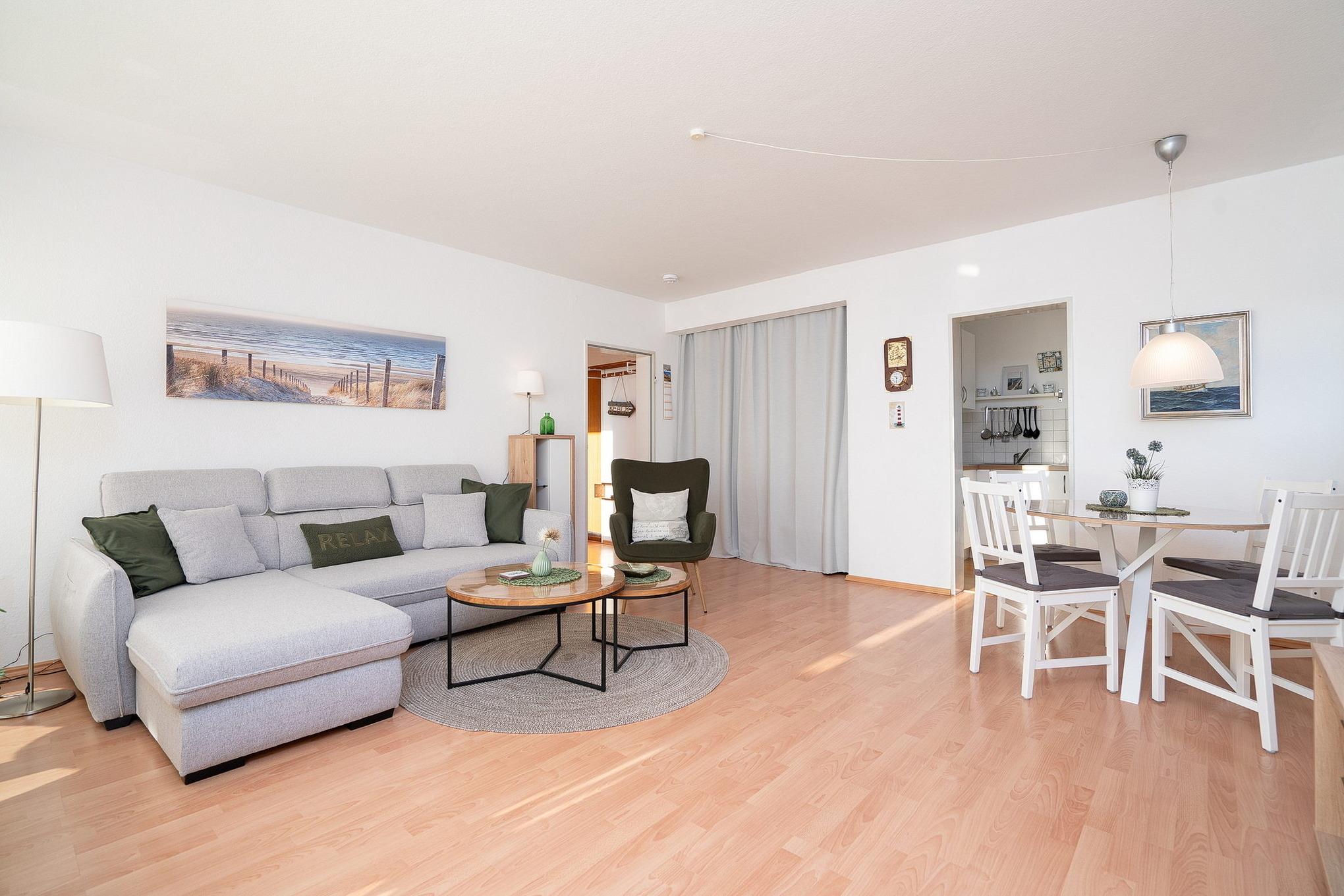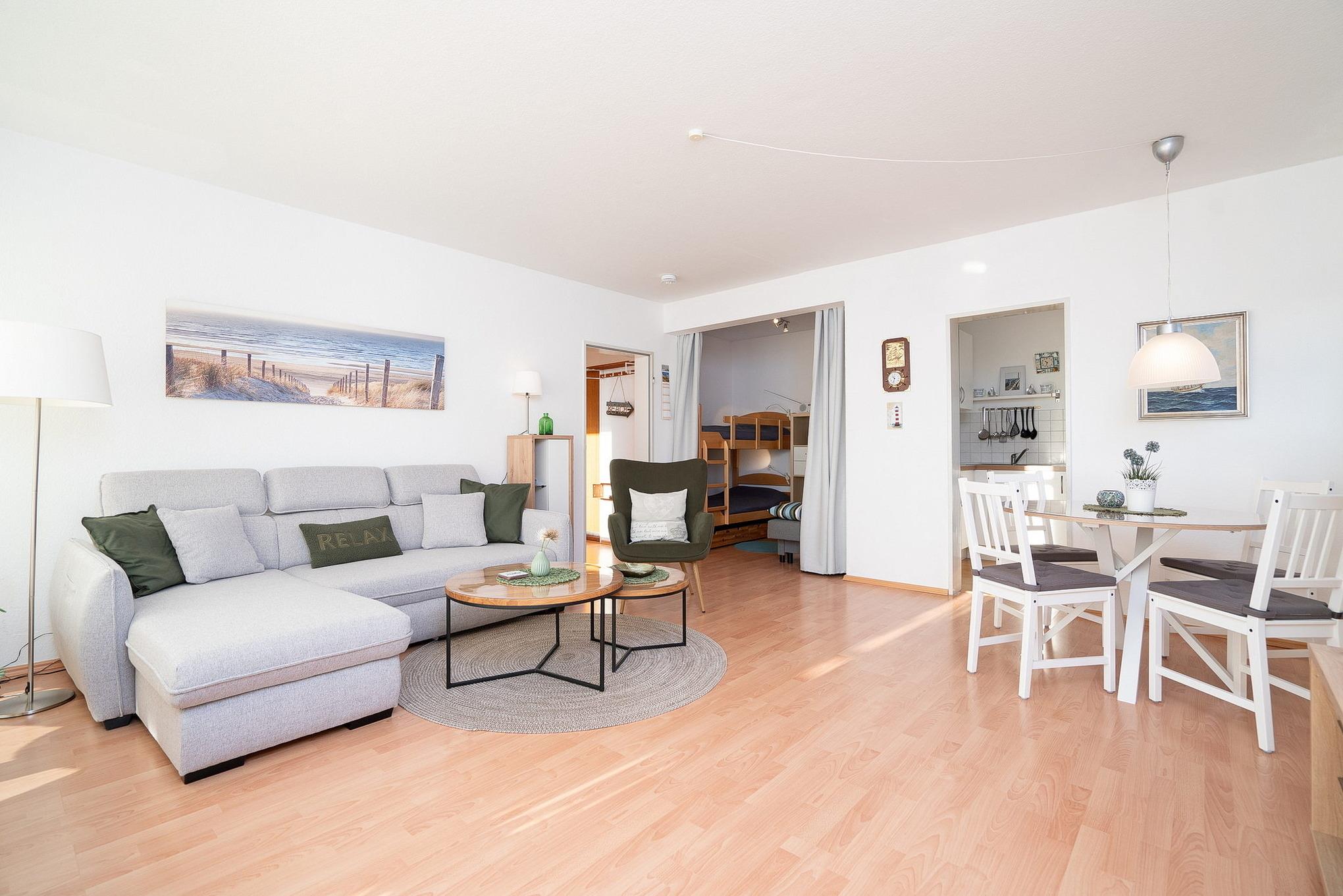 In dem hellen und gemütlichen Wohn- und Esszimmer befindet sich eine Eckcouch, ein Sessel, ein Couchtisch, ein Essplatz für 4 Personen und ein Wohnzimmerschrank. Zur Unterhaltung steht Ihnen ein Flachbildfernseher und ein Radio zur Verfügung. In einer separaten Nische, diese durch einen Vorhang abgetrennt ist, befindet sich ein Etagenbett sowie ein Schlafsofa. Das Wohn- und Esszimmer ist mit Laminatboden ausgelegt.
