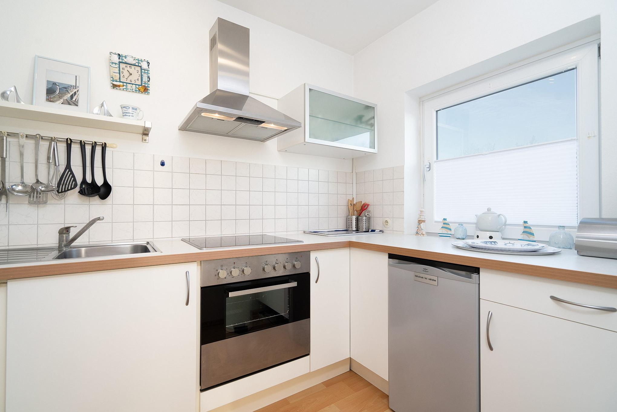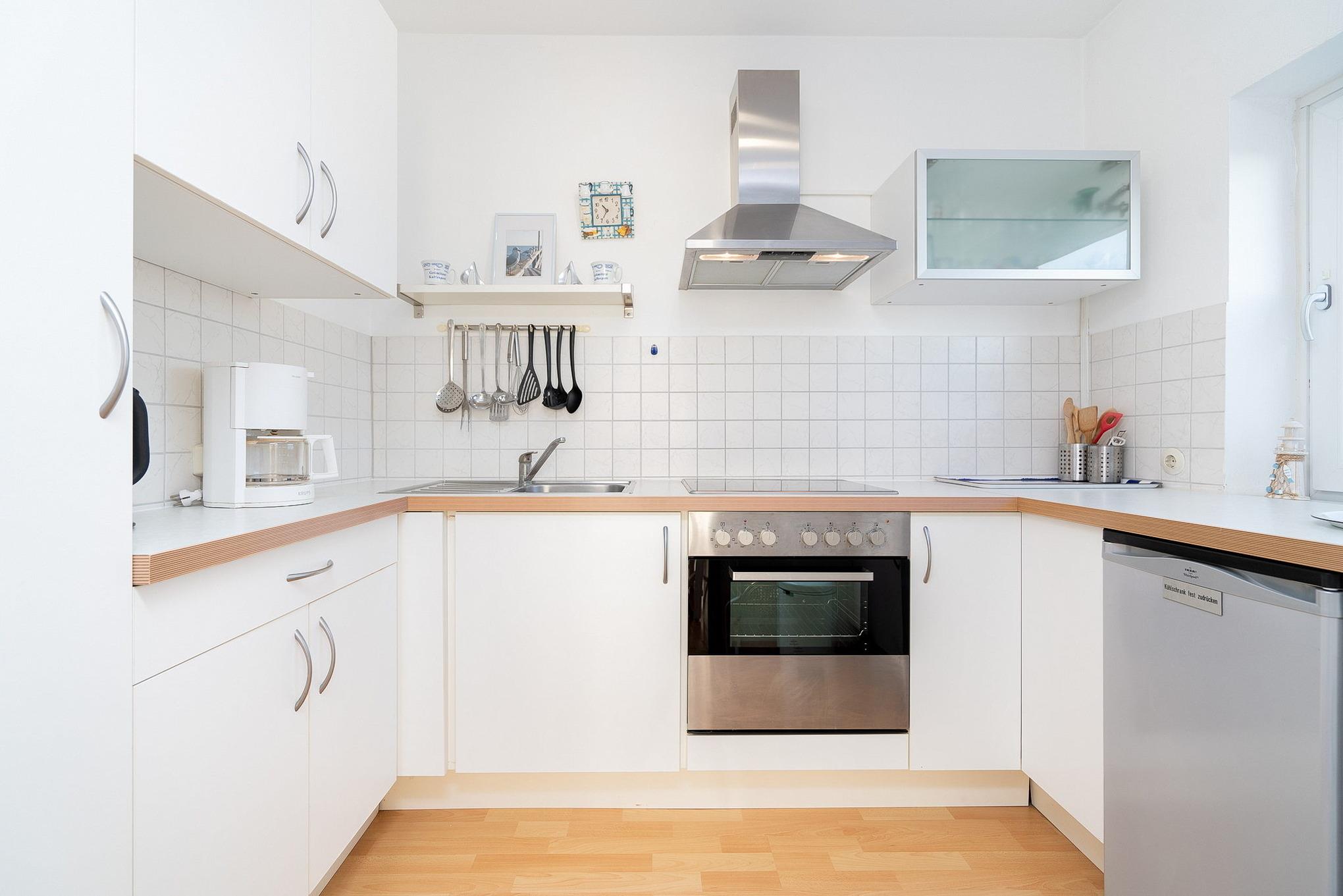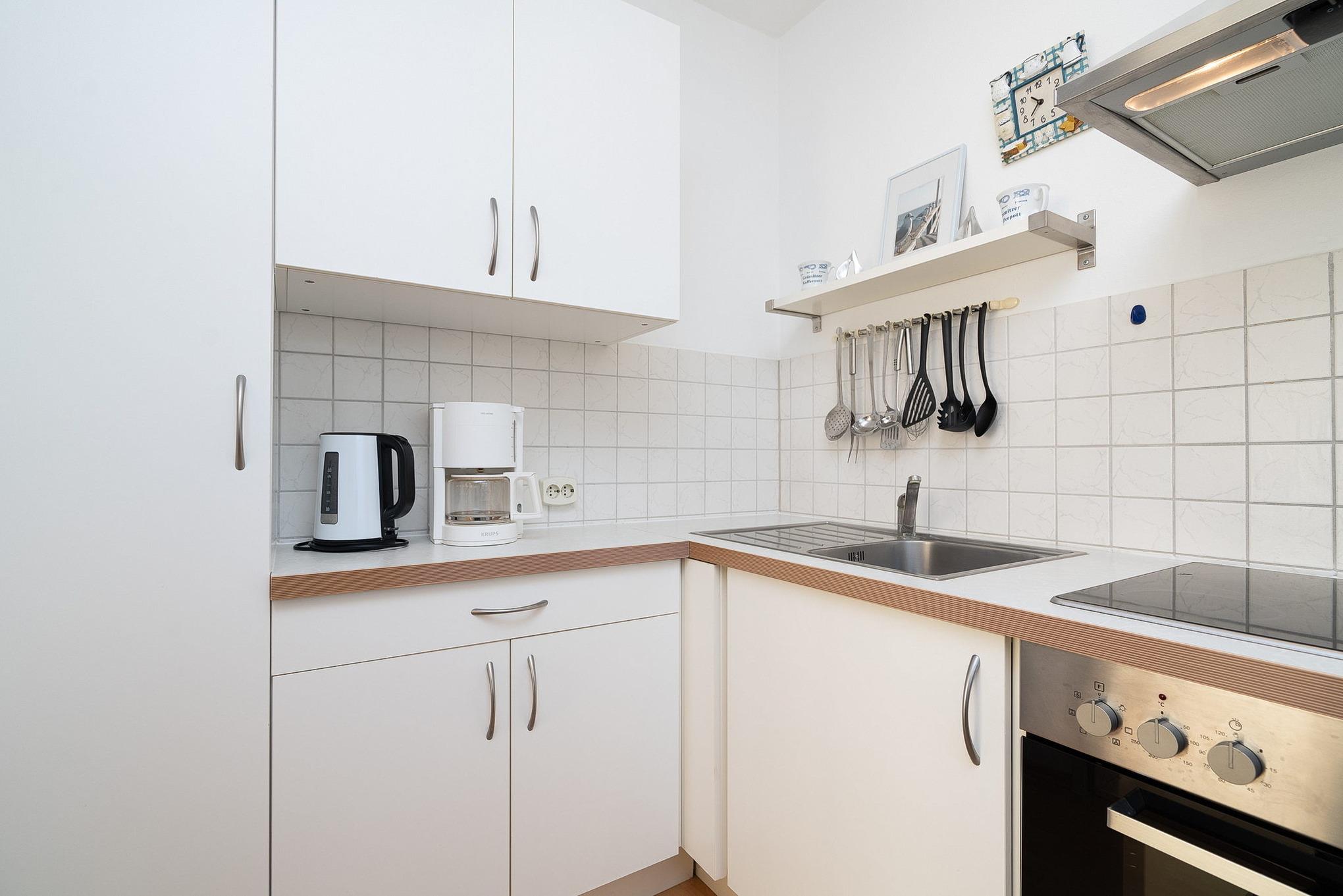 Die komplett ausgestattete, offene Küche verfügt über ein 4 Platten-Ceran-Kochfeld, einen Backofen, einen Kühlschrank mit kleinem 3-Sterne Gefrierfach sowie ein Wasserkocher, eine Kaffeemaschine und ein Toaster.