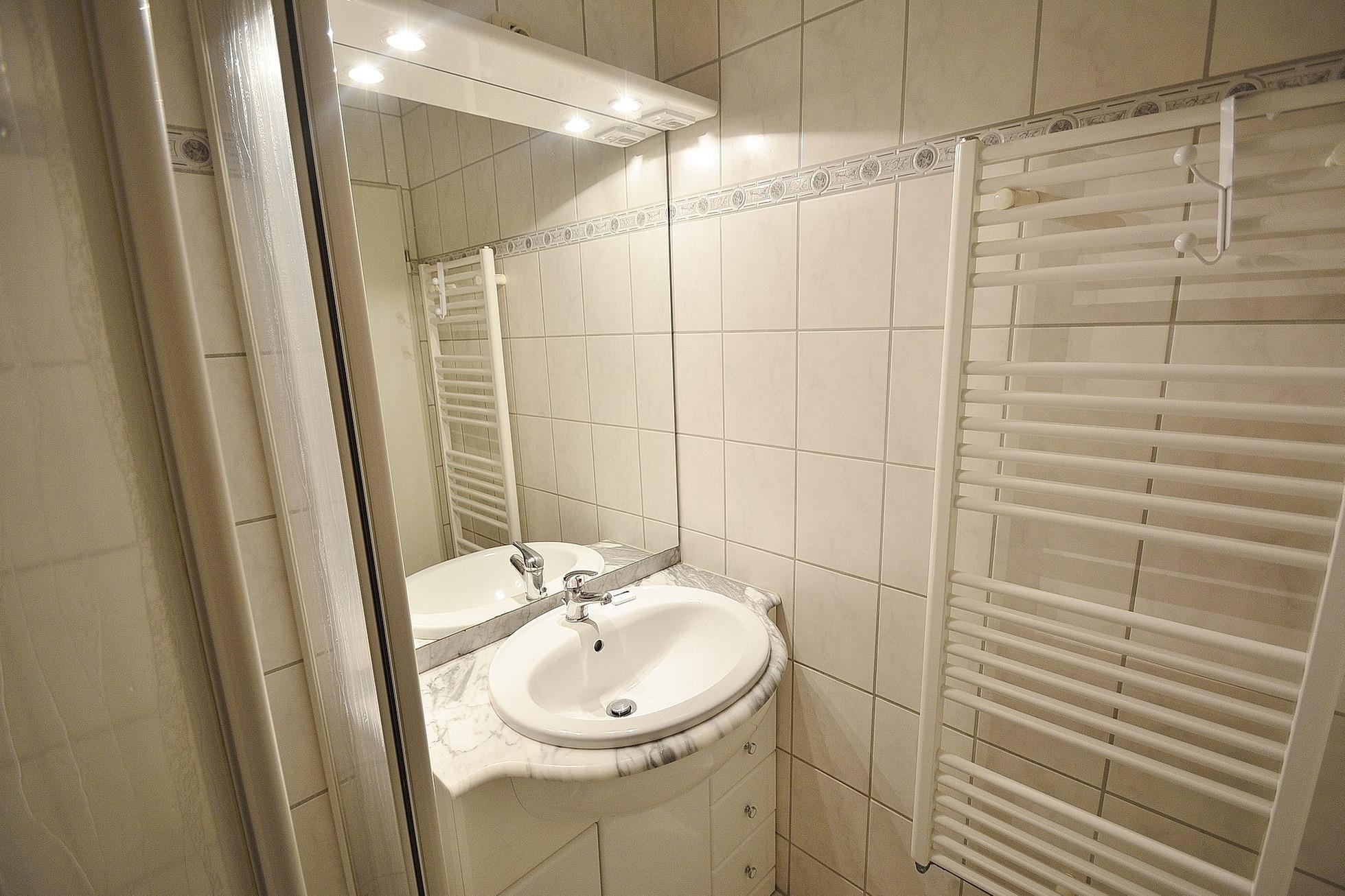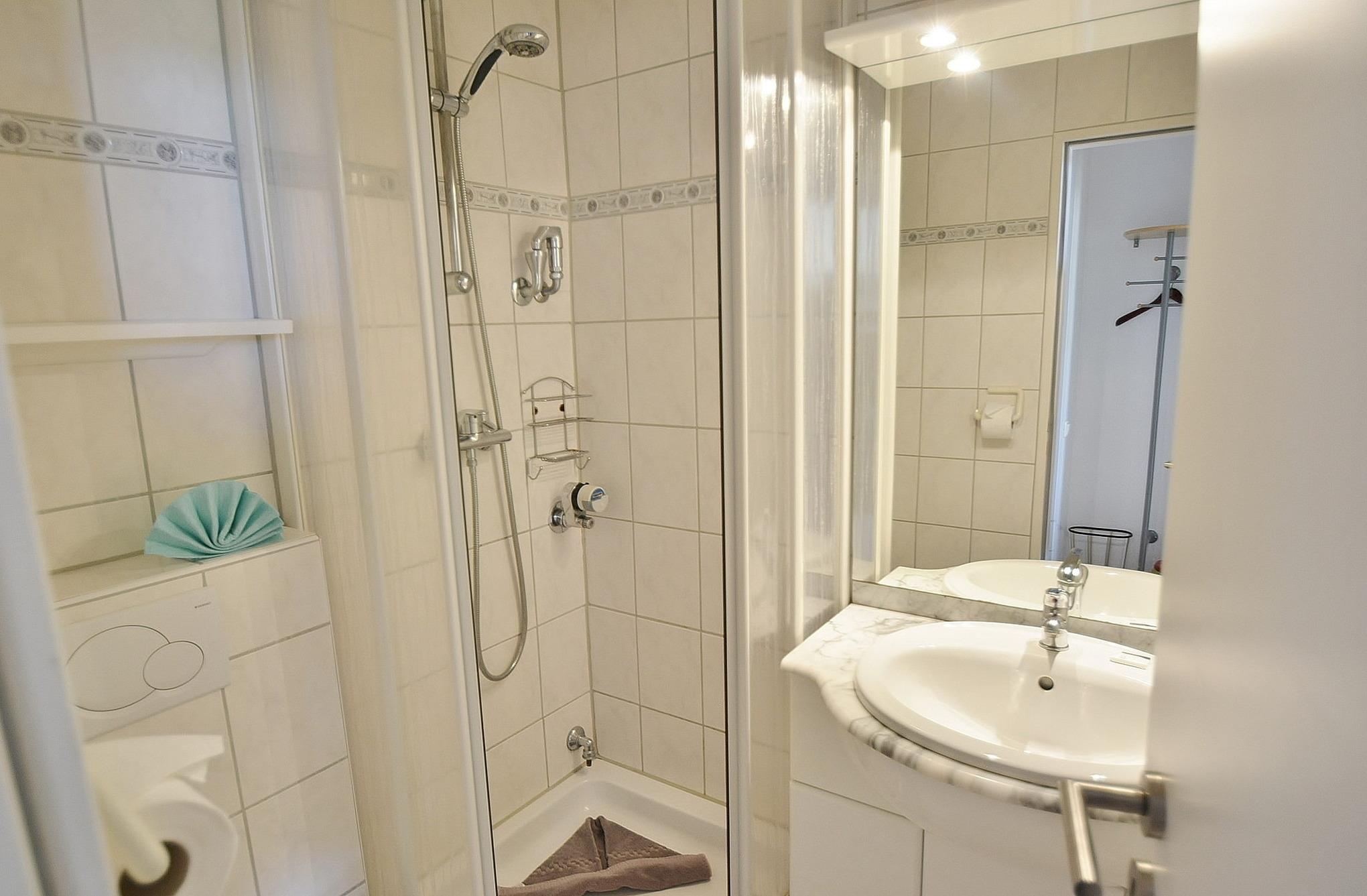 Modernes, freundliches, hell gefliestes Bad mit Dusche, WC und Waschbecken.