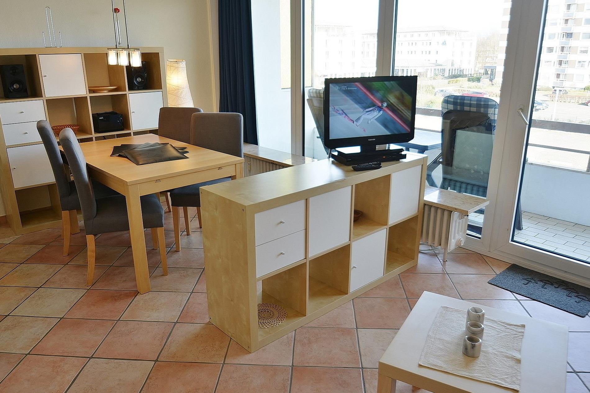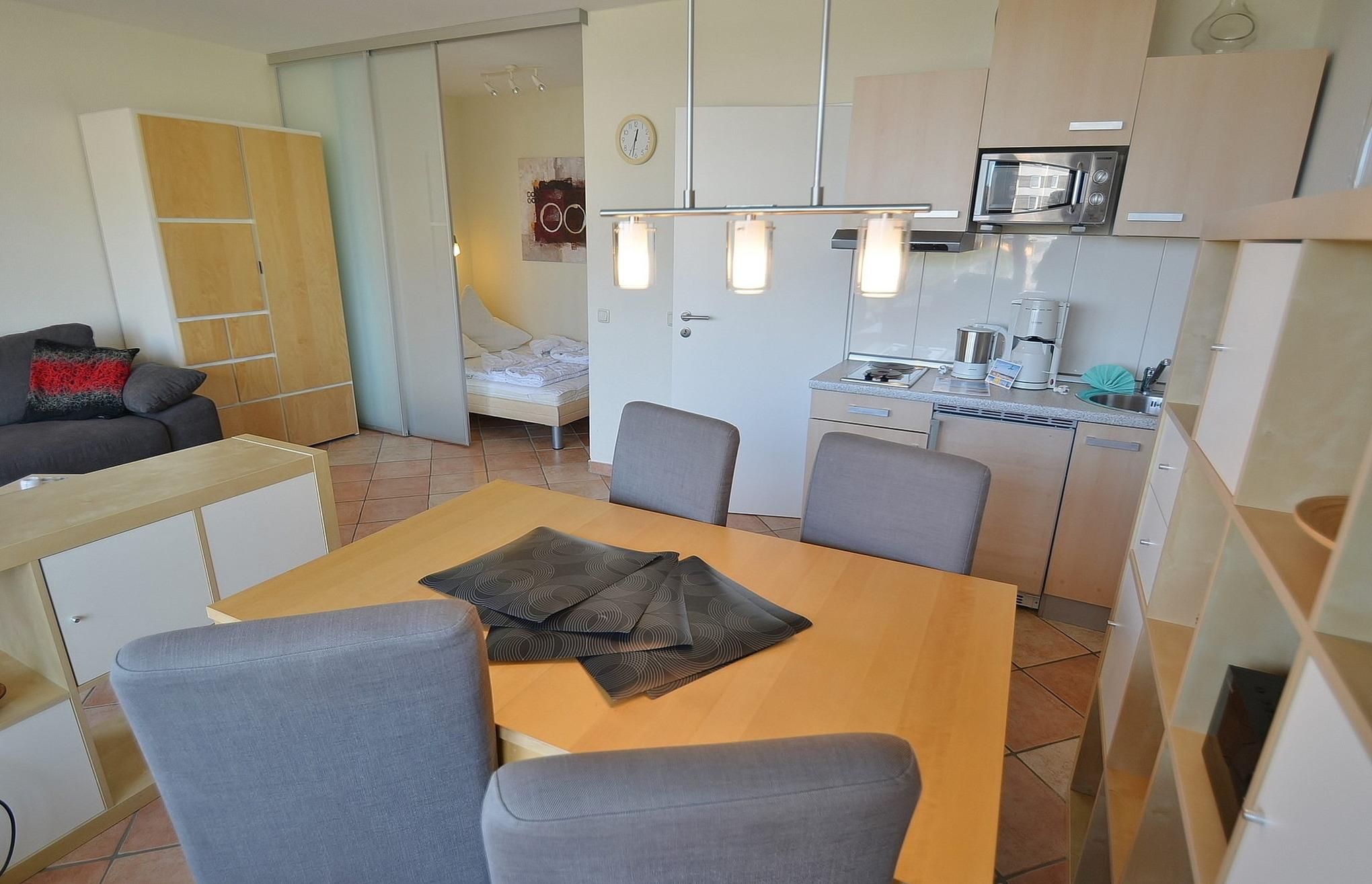 Modernes, offenes Wohn- und Esszimmer mit direktem Zugang zum Balkon. Das Wohn- und Esszimmer ist mit einer Schlafcouch, einem Couchtisch und einem Essplatz für 4 Personen ausgestattet (seit Mai 2025 neue Stühle). Zur Unterhaltung steht ein Fernseher mit DVD-Player und eine Mini-Stereoanlage mit CD-Player zur Verfügung. Das Wohn- und Esszimmer ist gefliest. Die Fenster lassen sich durch einen Vorhang stark verdunkeln. Kleine separate Nische mit einem Doppelbett (140 x 200cm), die sich durch Schiebetüren vom Wohn- und Esszimmer abtrennen lässt. Der Schlafbereich ist gefliest; ein Kleiderschrank befindet sich im Wohnbereich.