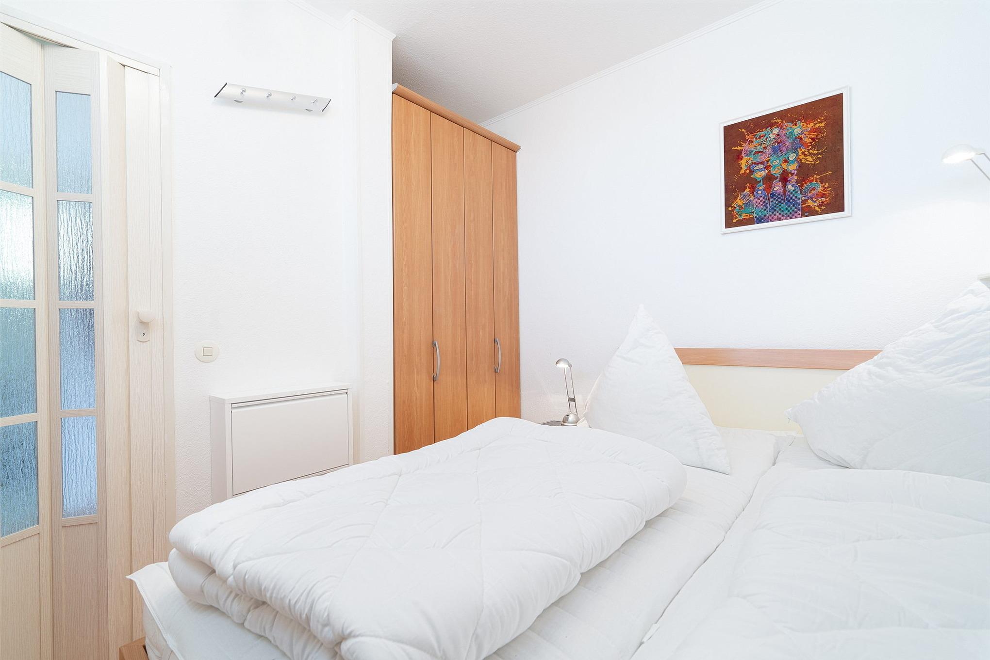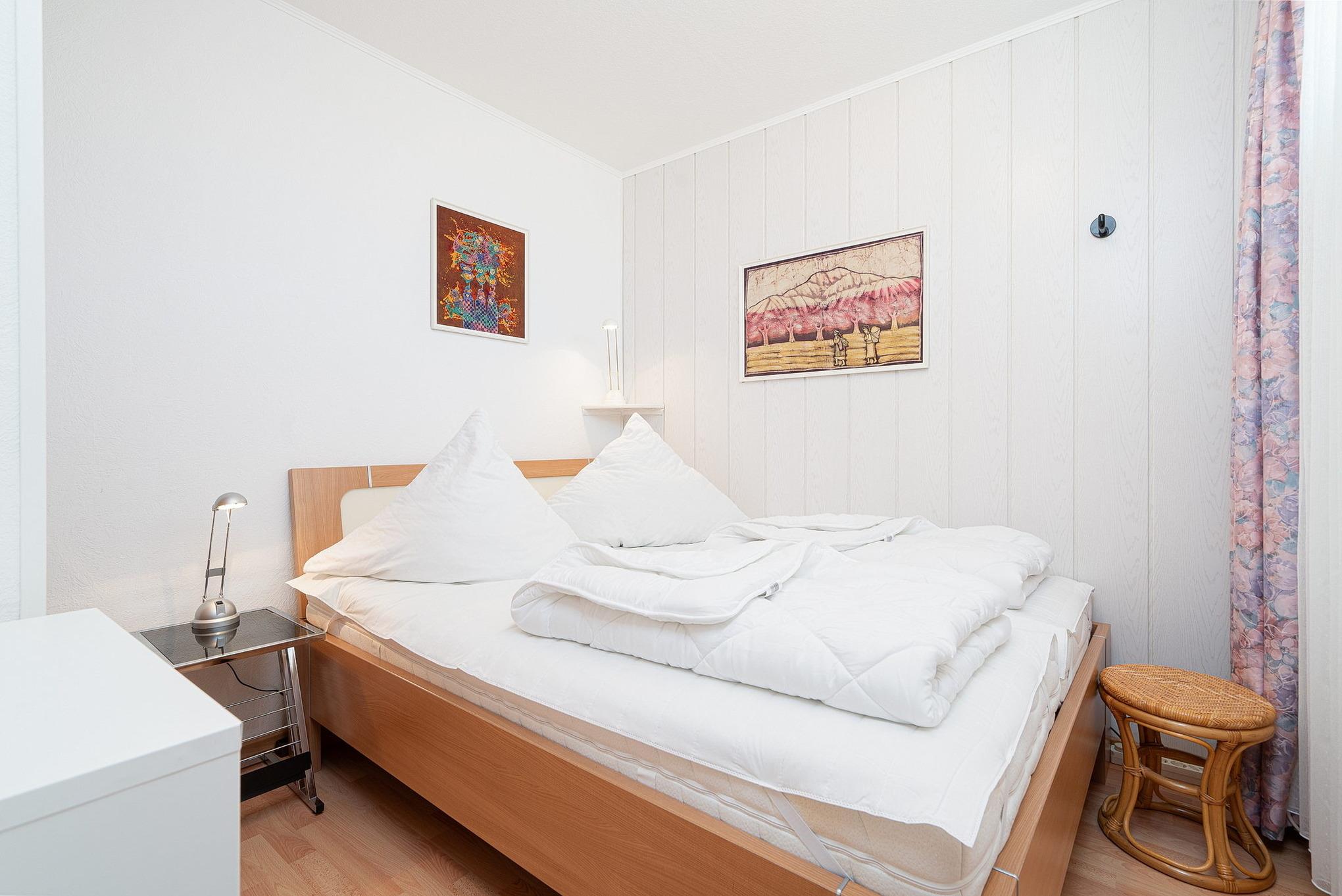 Schlafzimmer mit Doppelbett ( nur von einer Seite begehbar) und einem Kleiderschrank. Das Fenster zum Laubengang lässt sich durch einen Vorhang leicht verdunkeln.