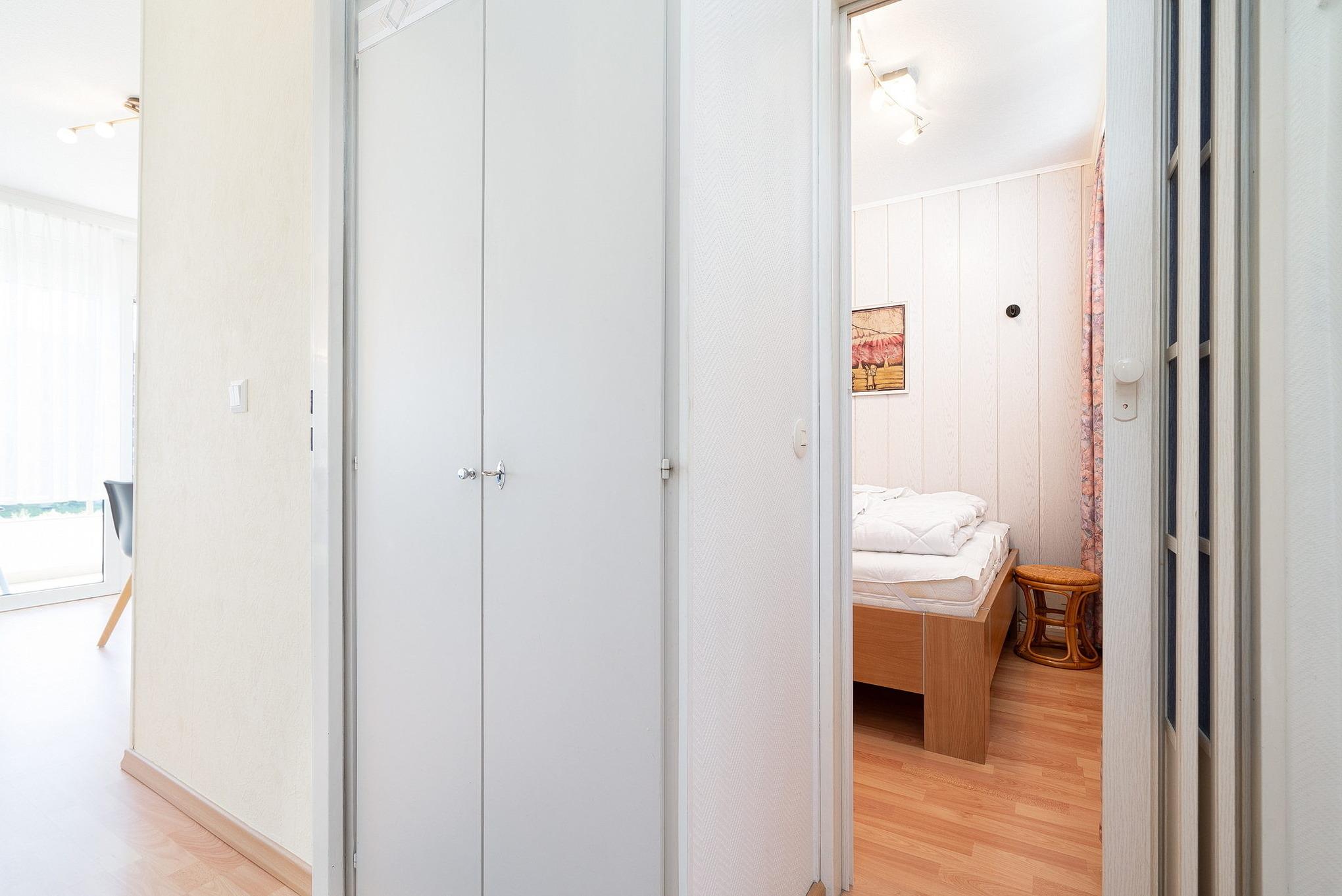 Gemütliches Wohn- und Esszimmer mit direktem Zugang zum sonnigen Balkon mit Blick auf den Deich und seitlichem Seeblick. Das Wohn- und Esszimmer ist mit einem Essplatz für 3 Personen, einem Wohnzimmerschrank, einer Schlafcouch und einem Couchtisch ausgestattet. Des Weiteren stehen ein Fernseher und eine kleine Hifi-Anlage zur Verfügung.