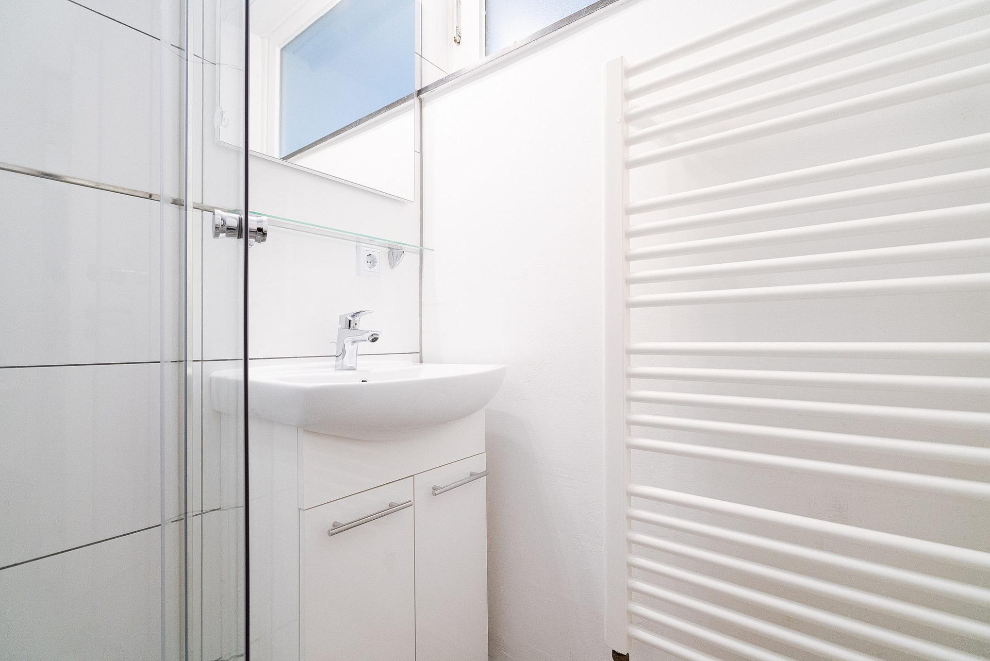 Kleines, freundliches, Tageslichtbad mit Dusche, WC und Waschbecken.