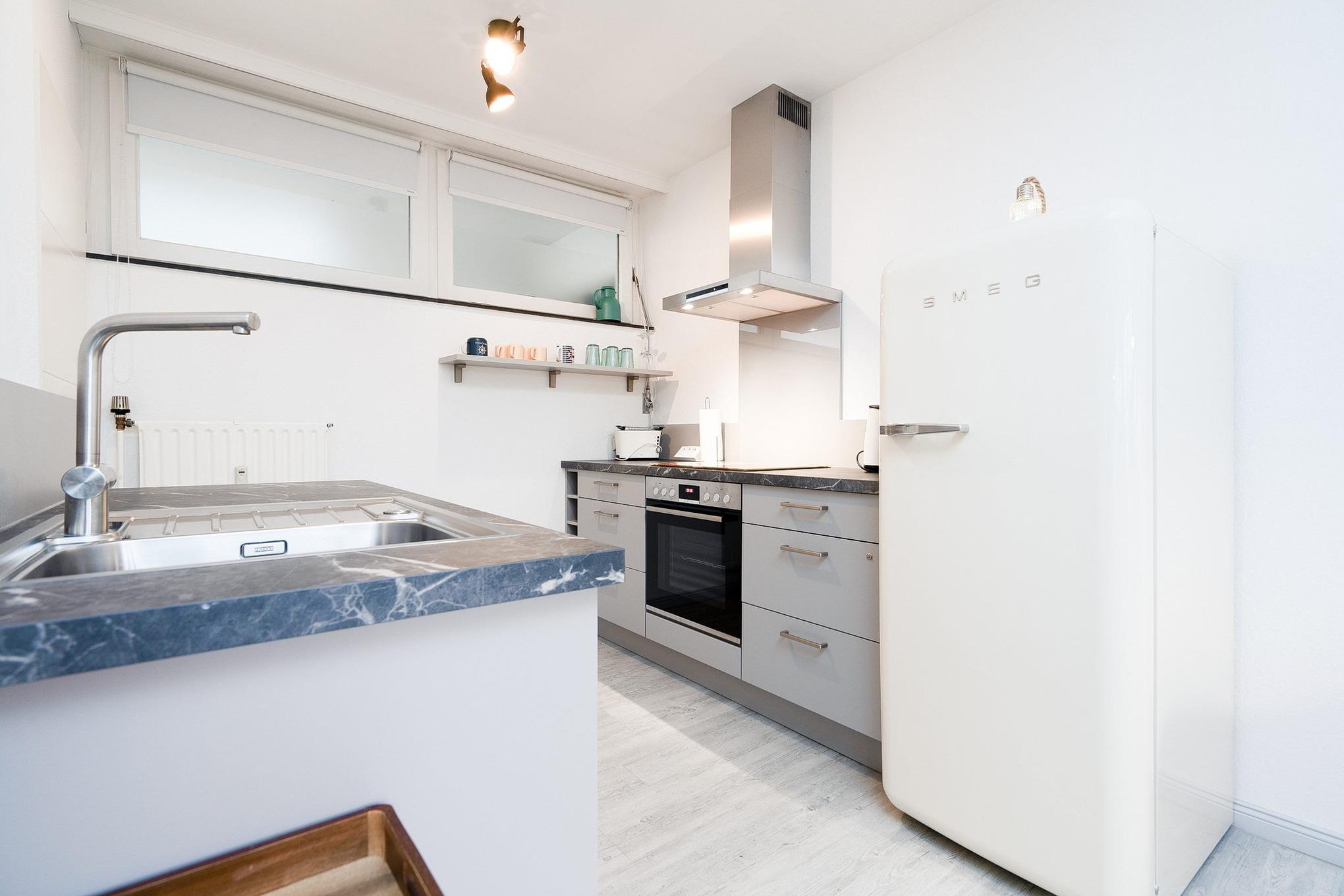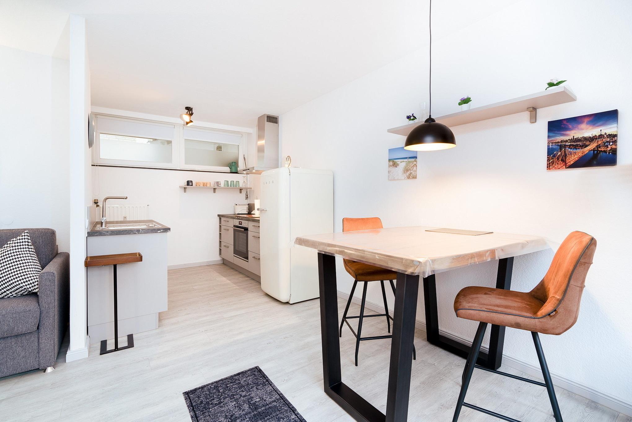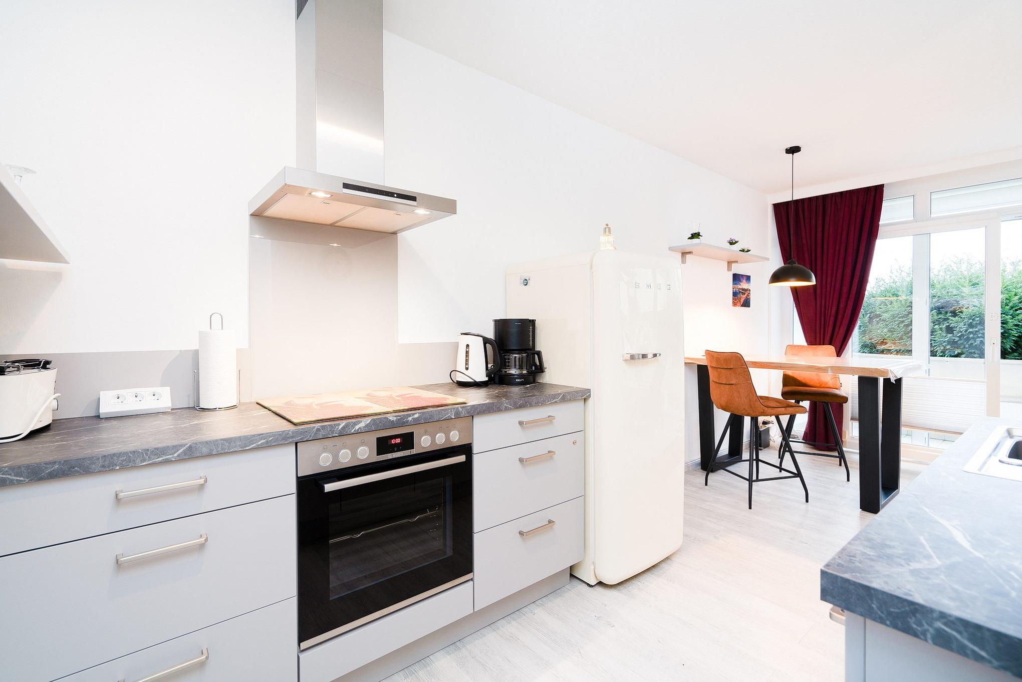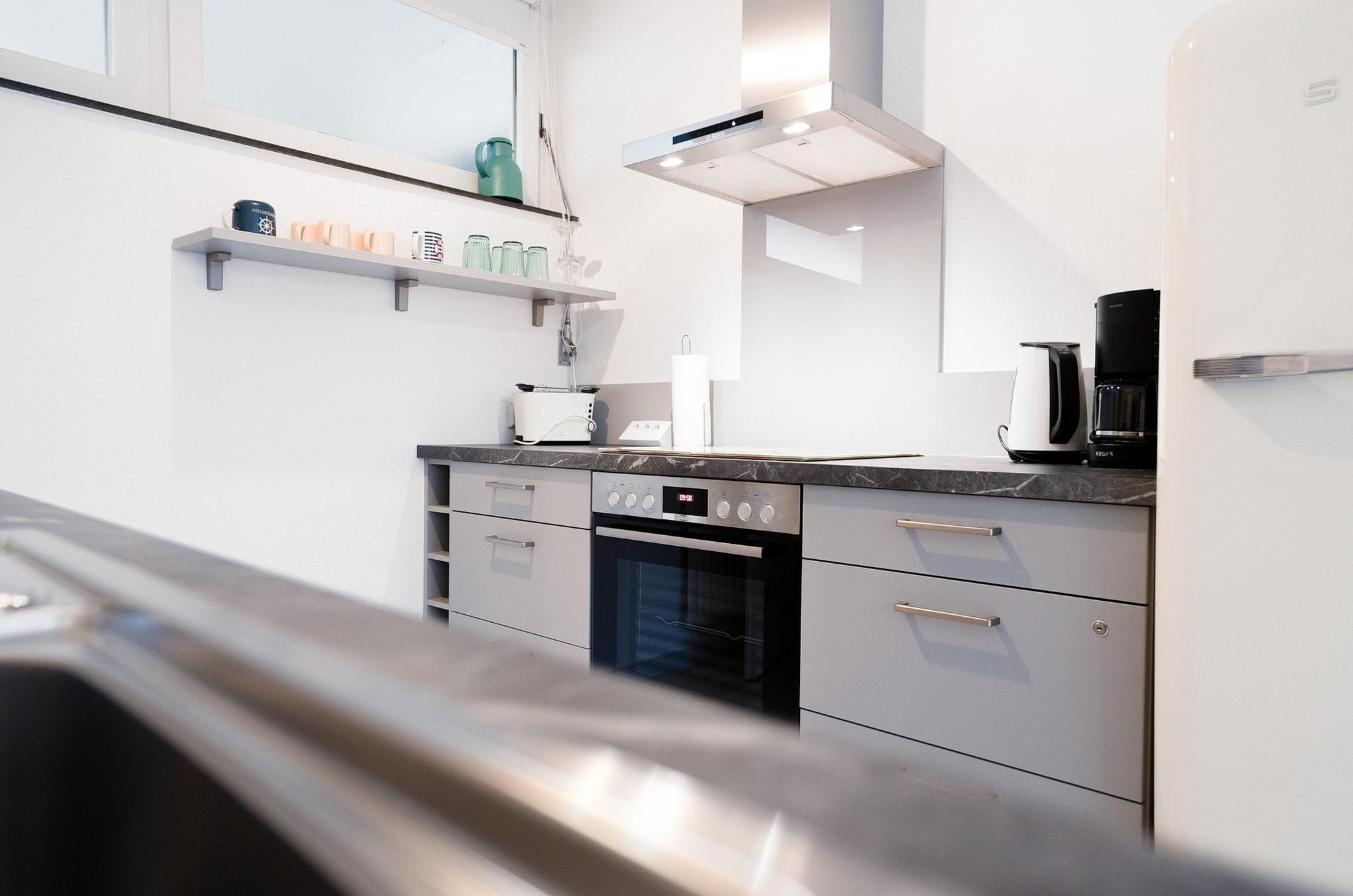 Moderne, komplett eingerichtete, zum Wohnbereich offene Küche. Die Küche ist mit einem Ceran-Kochfeld, einer Spülmaschine, einem Wasserkocher, Toaster, Kaffeemaschine und einem Kühlschrank mit kleinem Gefrierfach ausgestattet.