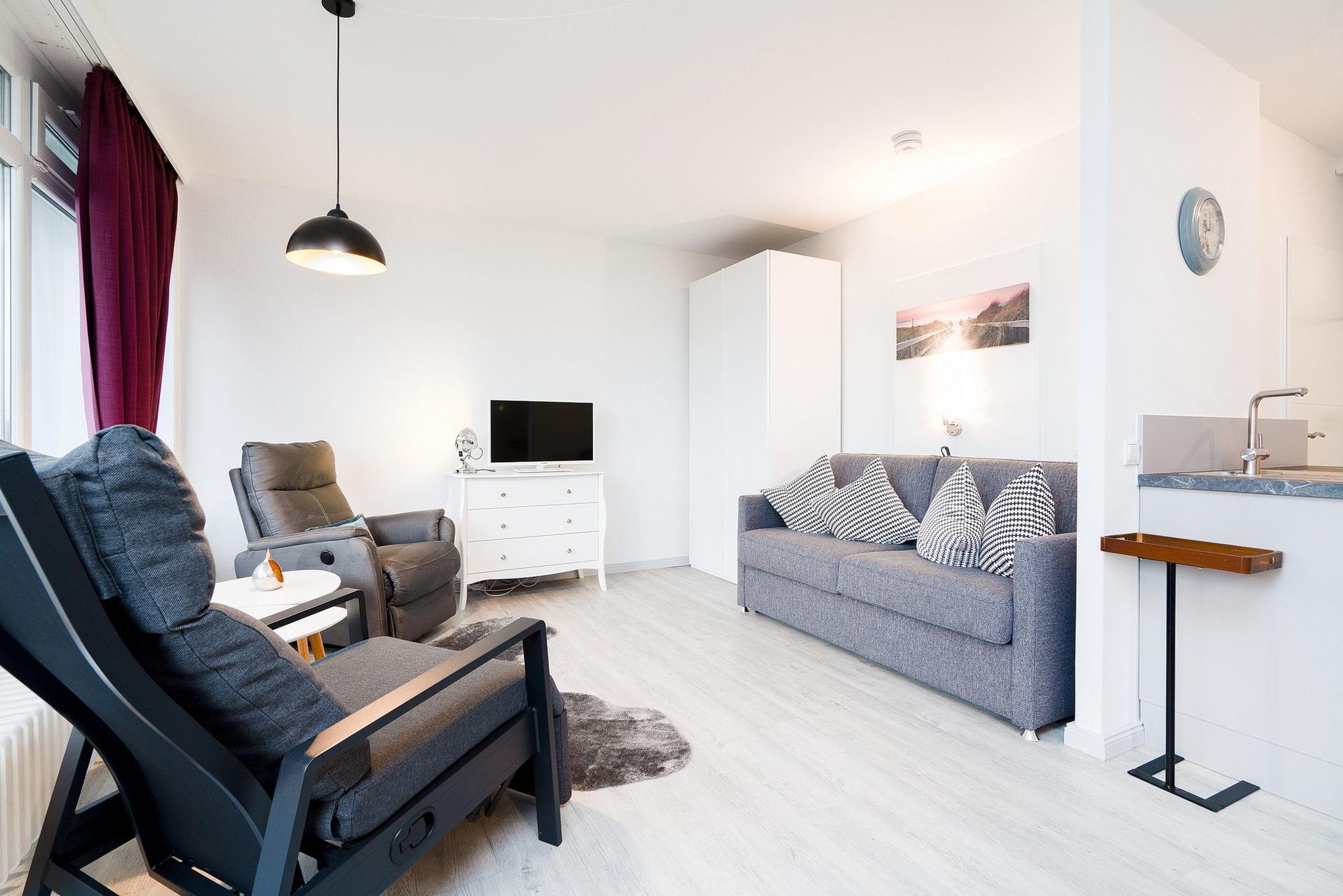 Moderner, freundlicher und heller Wohnbereich mit direktem Zugang zum Balkon. Der Wohnbereich ist mit einem Schlafsofa (150mx200m), 2 Sesseln, einem Couchtisch, einem Essbereich für 2 Personen und einem Kleiderschrank ausgestattet. Zur Unterhaltung steht ein Flachbildschirm zur Verfügung. Die Fenster können verdunkelt werden.