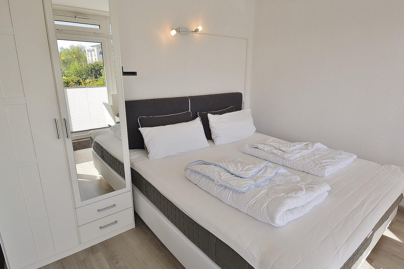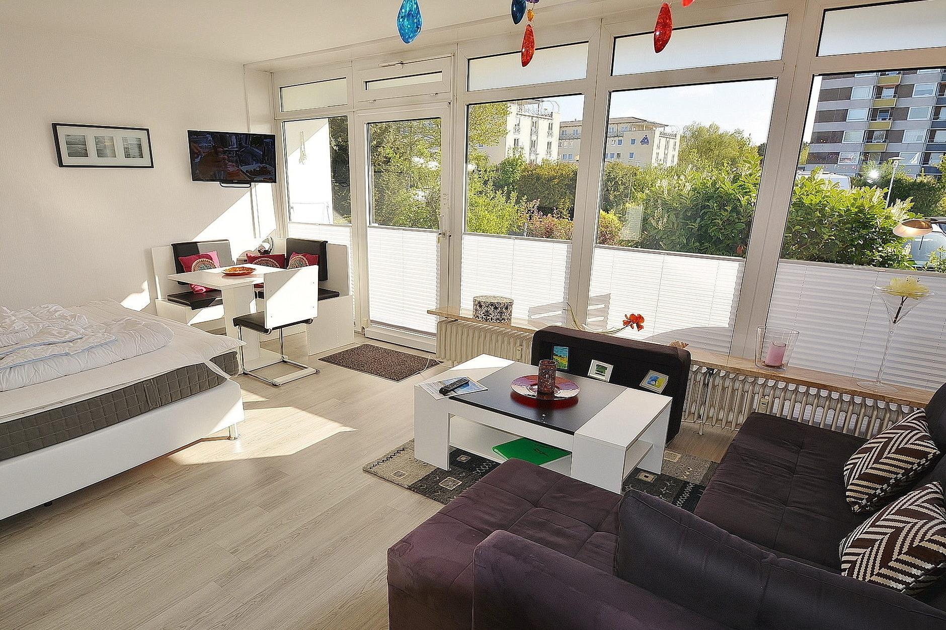 Modern ausgestattetes Wohn-/Schlafzimmer mit direktem Zugang zum Balkon in östliche Richtung. Das Wohn-/ Schlafzimmer ist mit einem Boxspringbett (180 x 200 cm), einem 2-türigen Kleiderschrank, einer kleinen Eck-Couch, einem Couchtisch, einem Essplatz für 4 Personen und einer Kommode ausgestattet. Zur Unterhaltung stehen ein Flachbildschirm (Kabel-TV) und eine Mini-Stereoanlage mit CD-Player zur Verfügung. Das Zimmer ist mit Laminat-Fußboden ausgelegt. Die Wohnung verfügt über Innenjalousien für Sicht- und Sonnenschutz. Eine komplette Abdunklung des Raumes wird dadurch nicht erzielt.