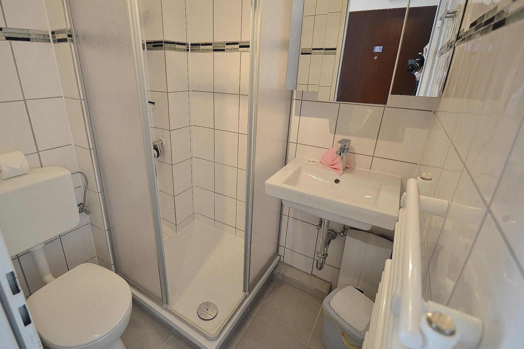 Hell gefliestes, grundsaniertes Bad mit Dusche, WC und Waschbecken.