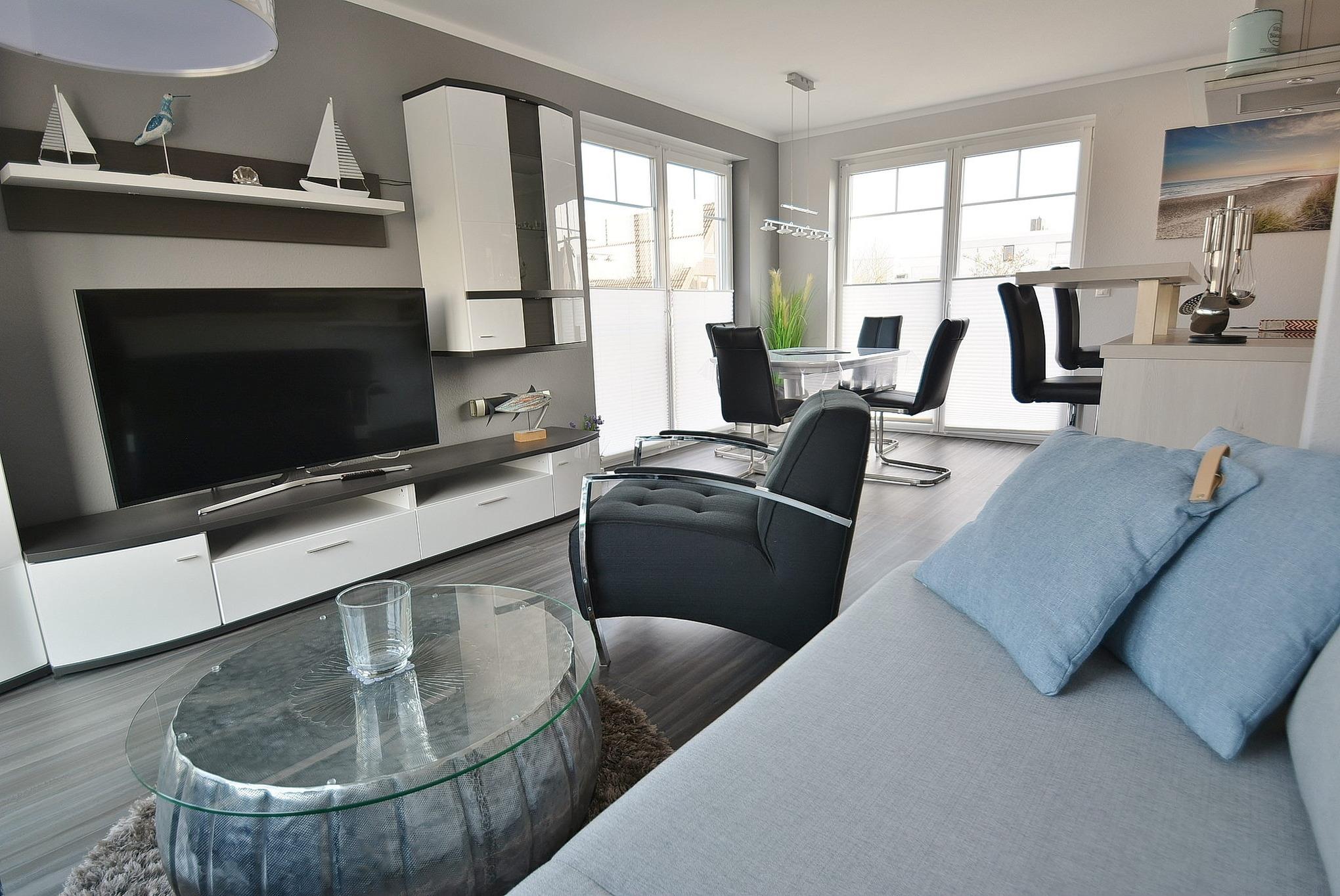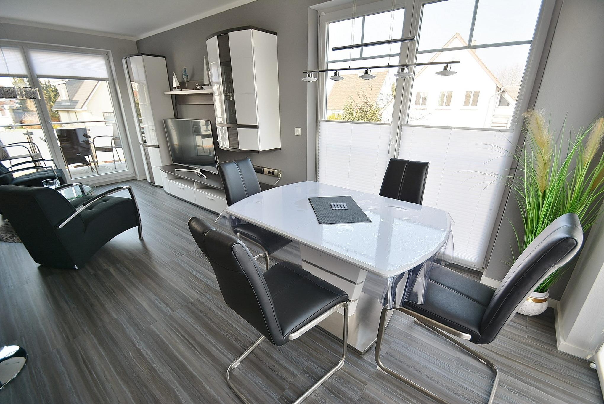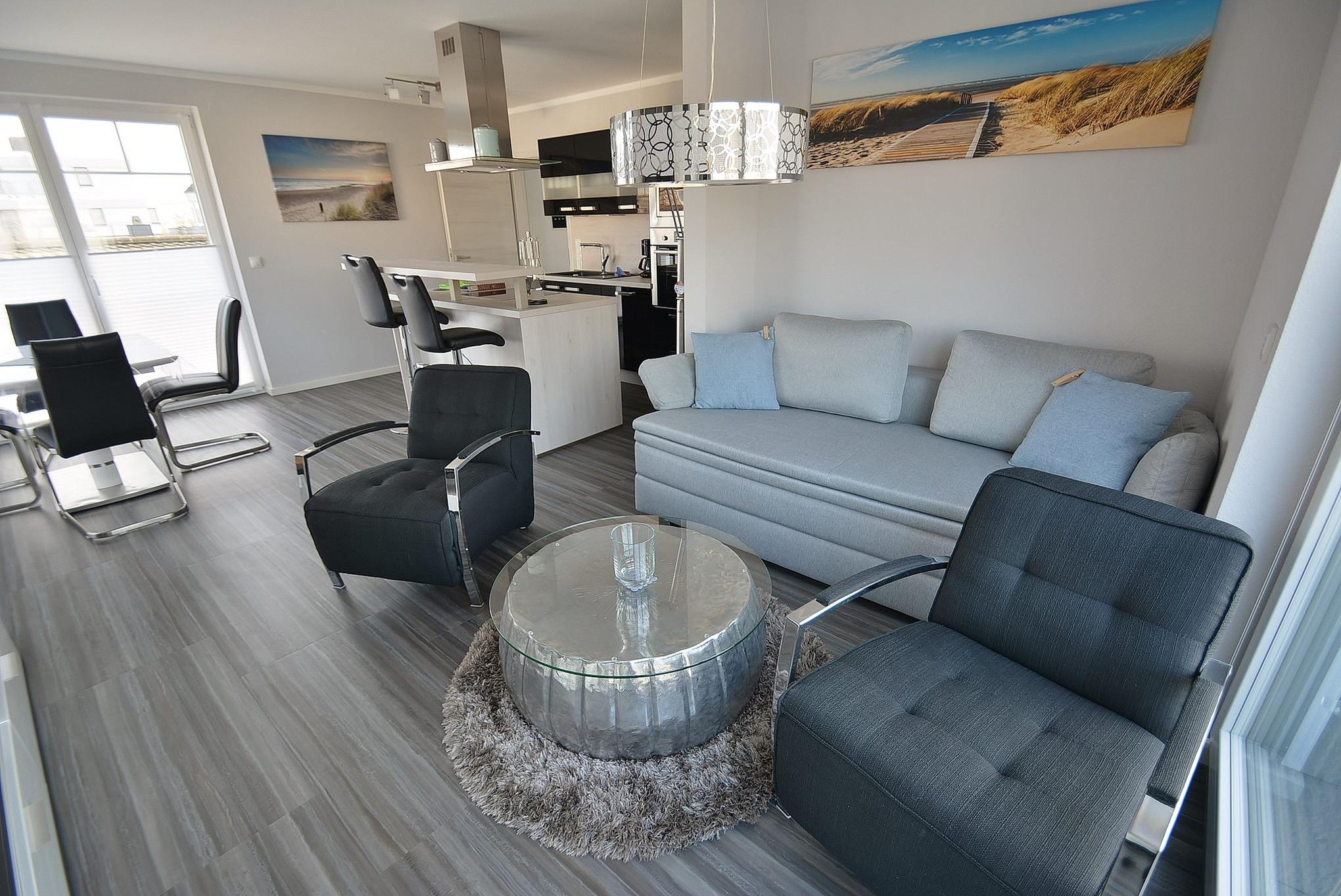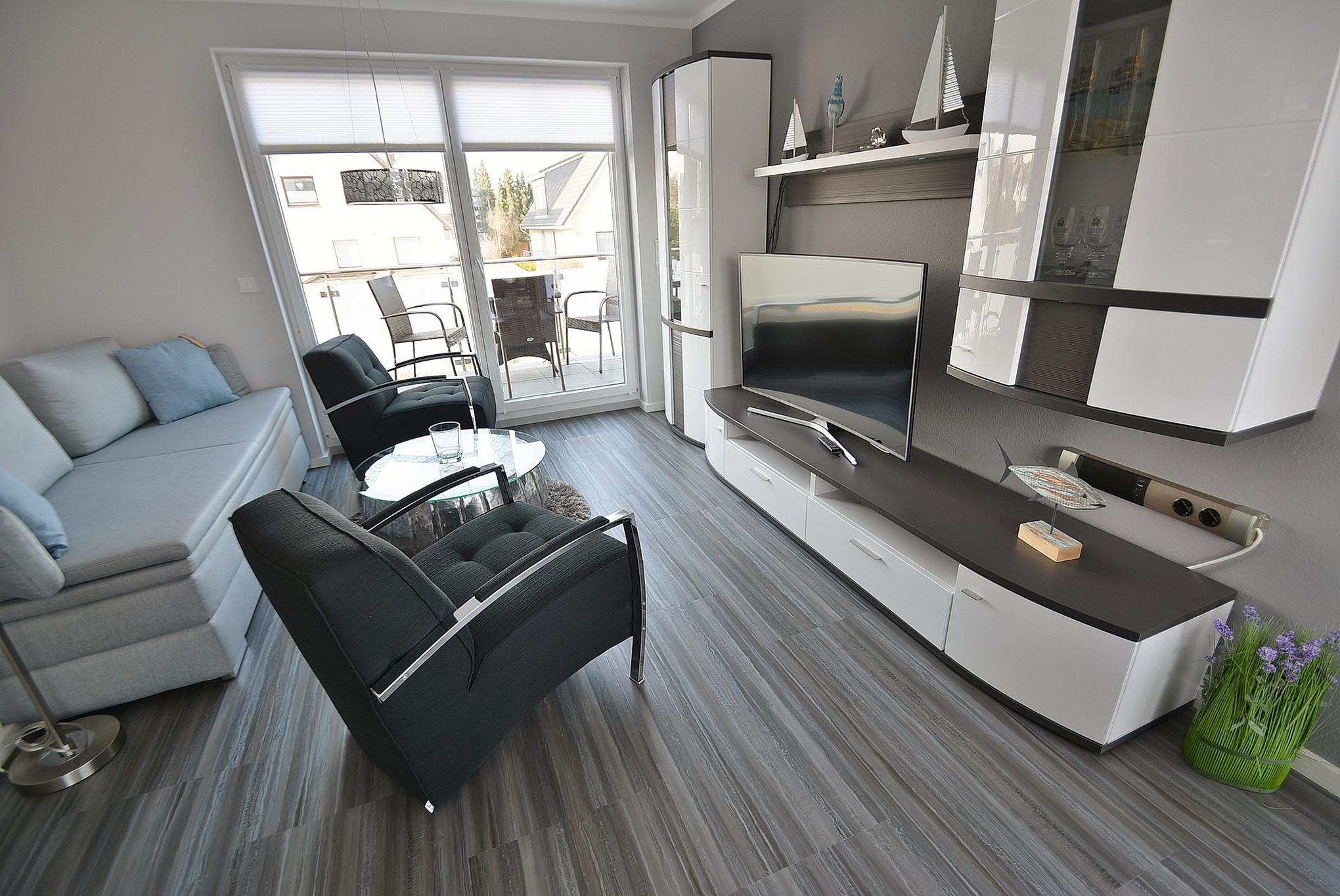 Das helle freundliche Wohnzimmer verfügt über eine Couch mit Schlaffunktion sowie 2 gemütliche Sessel und einen Esstisch für 4 Personen. Der Raum ist mit Designer-Planken ausgelegt und lässt sich durch elektrische Außenrollos verdunkeln. Vom Wohnzimmer gelangt man direkt auf den Balkon, der über eine elektrische Markise verfügt.