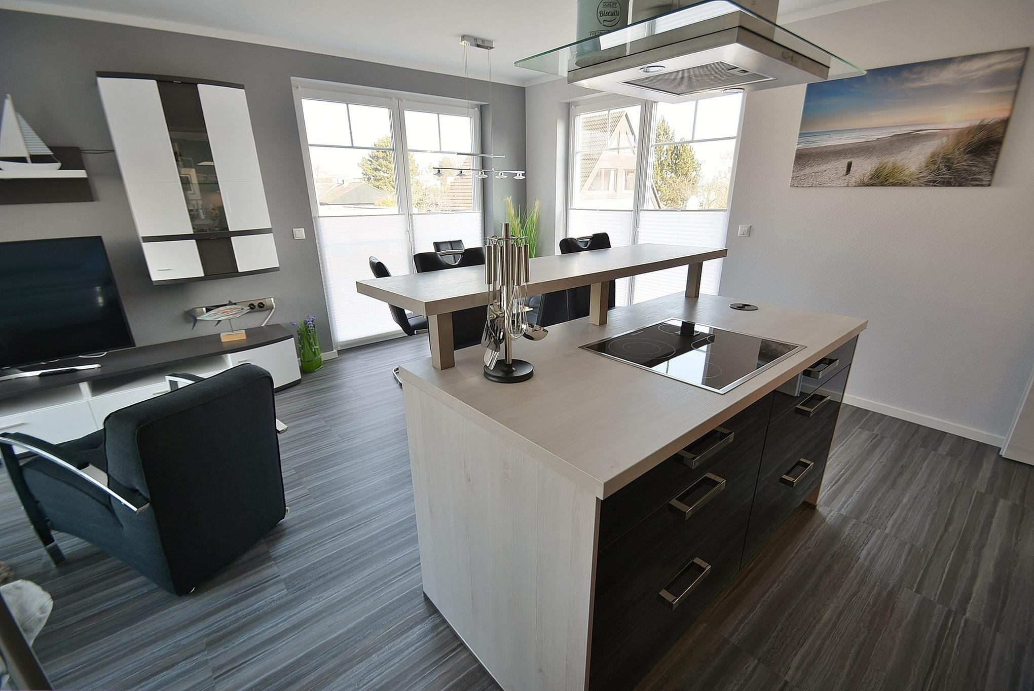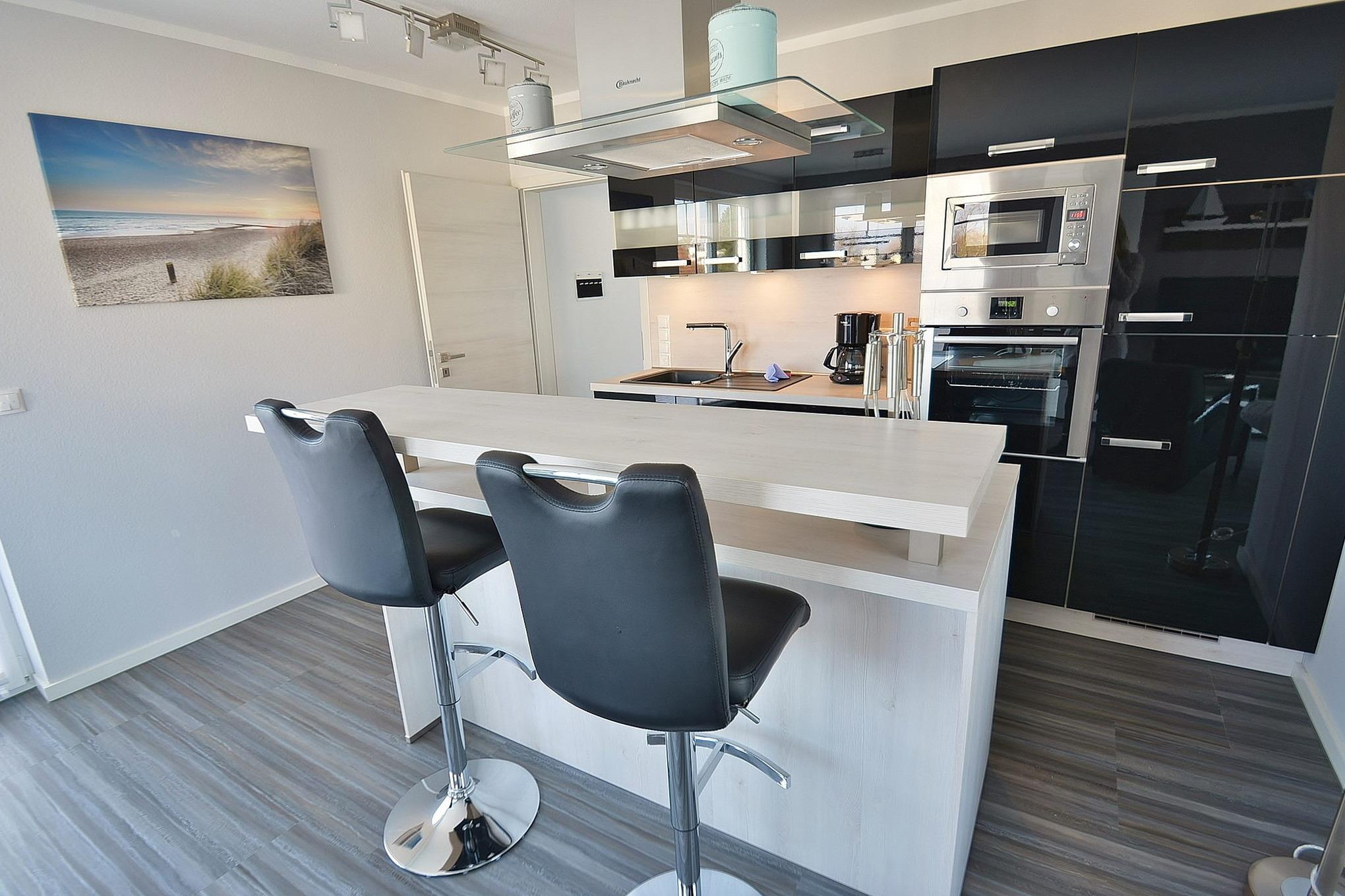 Die moderne hochwertige Küche ist im Wohnbereich integriert. Sie ist ausgestattet mit einem Kühlschrank mit Gefrierfach, einer Spülmaschine, einem Backofen und einer Mikrowelle. Des Weiteren stehen eine Kaffeemaschine, ein Toaster, ein Wasserkocher zur Verfügung.