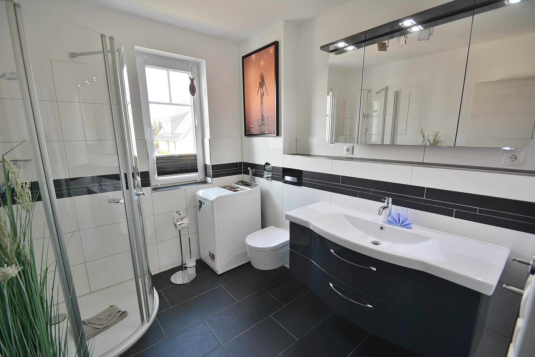 Modernes Tageslichtbad mit Dusche, Waschbecken und WC. Außerdem steht eine kleine Waschmaschine zur Verfügung.