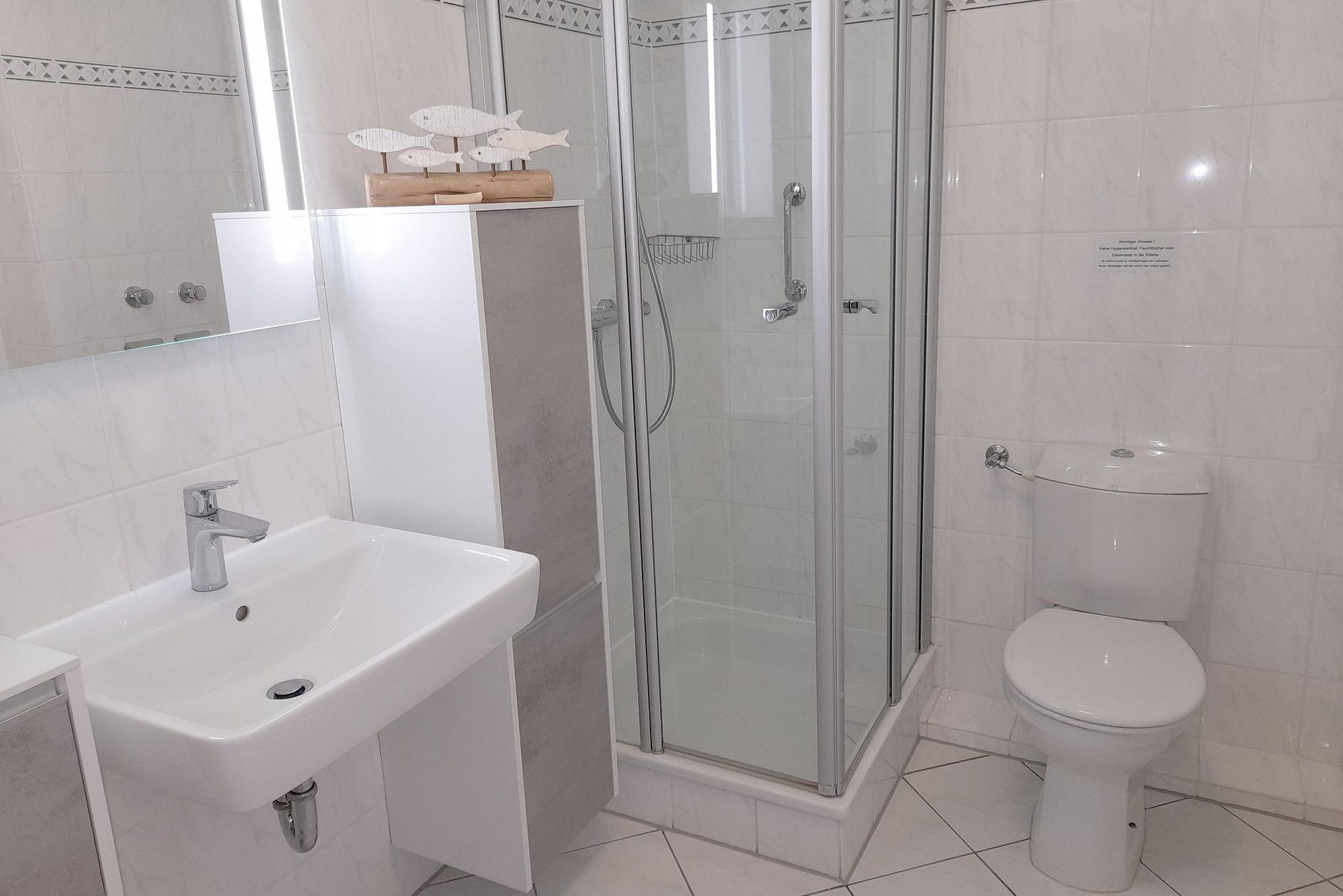 Modernes, hell gefliestes Bad mit Dusche, WC und Waschbecken.