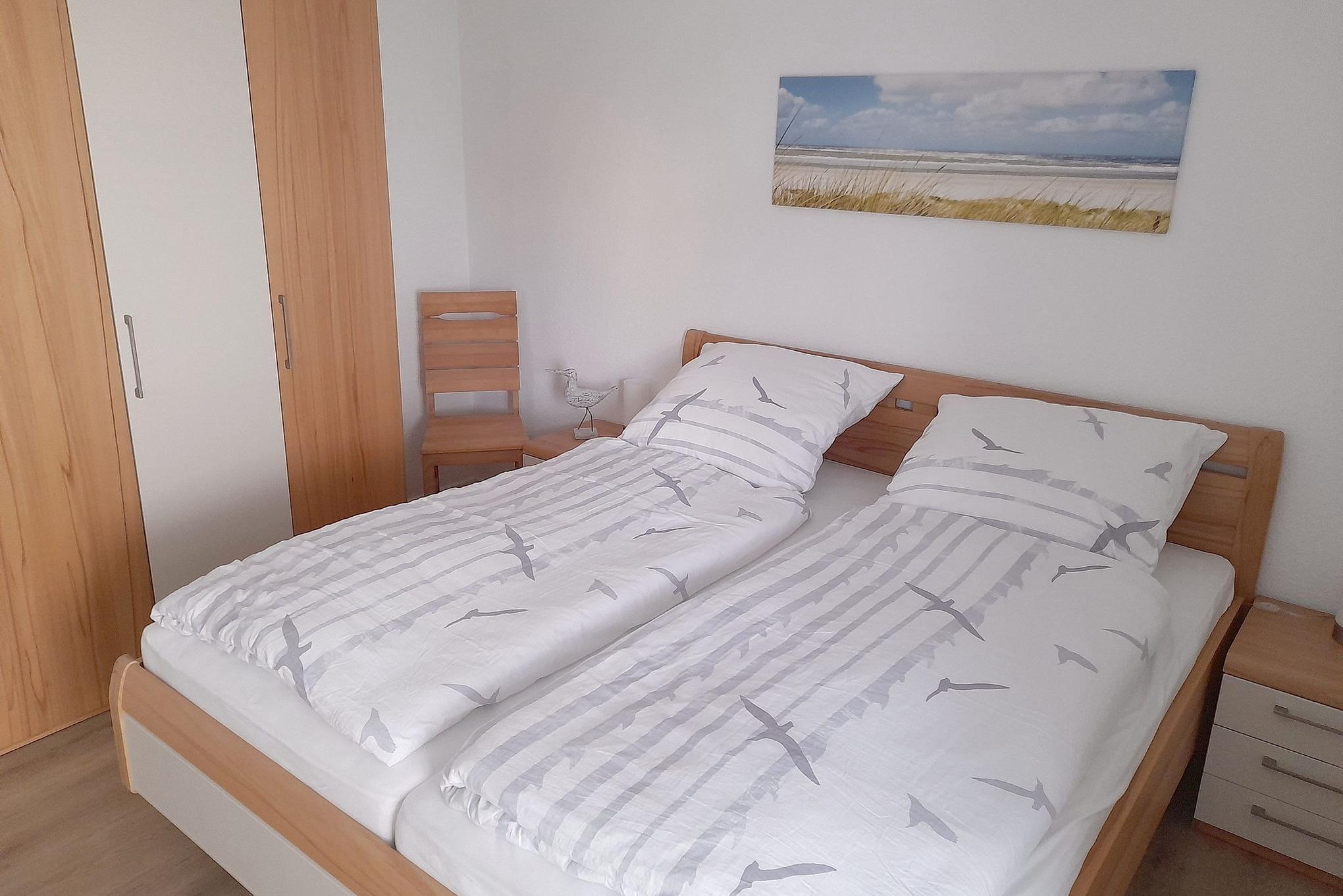Modernes, freundliches Schlafzimmer mit Vinyl-Parkettboden. Das Schlafzimmer ist mit einem Doppelbett (2x90x200cm), einem großen Kleiderschrank und einem TV-Flachbildschirm ausgestattet. Durch die Terrassentür gelangen Sie direkt auf die Terrasse. Ein Aussenrolladen dunkelt das Zimmer ab.