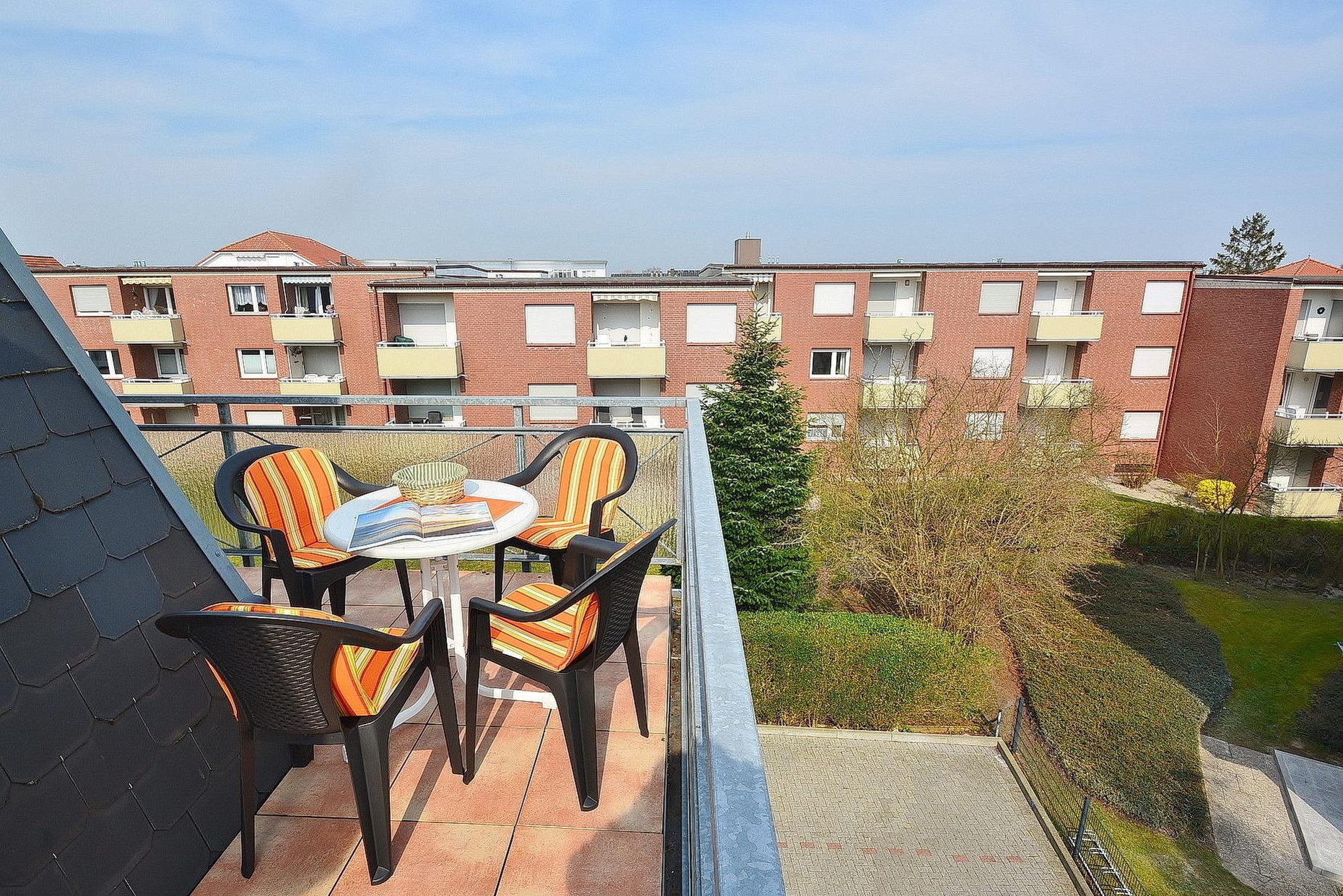 Vom langen Eckbalkon (süd-östliche Richtung) geringer Blick zum Meer. Pkw-Stellplatz am Gebäude. Kinderbett und Hochstuhl kostenlos zur Verfügung.