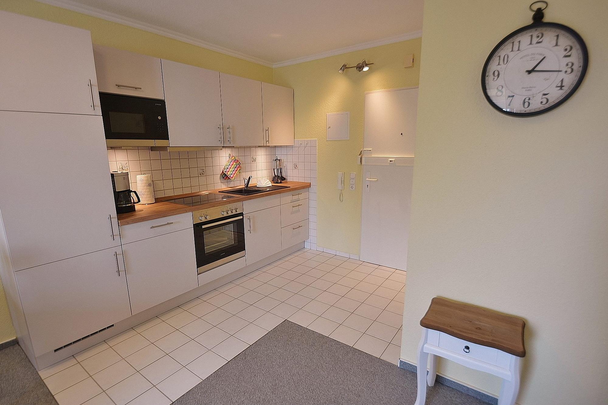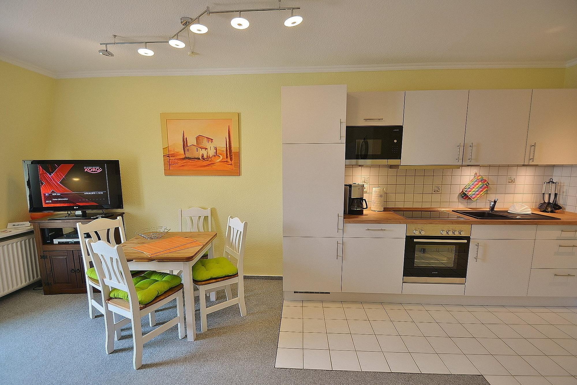 Zum Wohn- und Esszimmer offene, komplett ausgestattete Küche mit 4 Platten Ceran Kochfeld mit Backofen, Kühlschrank mit kleinem 3-Sterne Gefrierfach, Mikrowelle, Toaster, Wasserkocher und Kaffeemaschine.