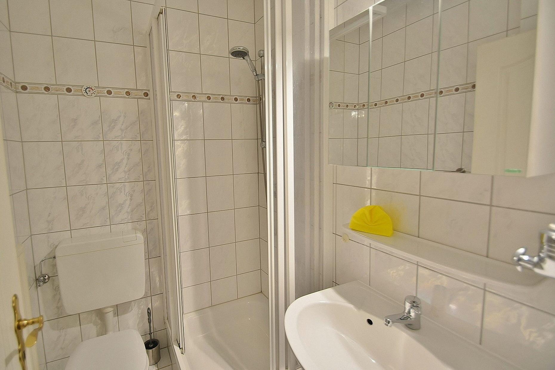 Modernes, hell gefliestes Bad mit Dusche, WC und Waschbecken.