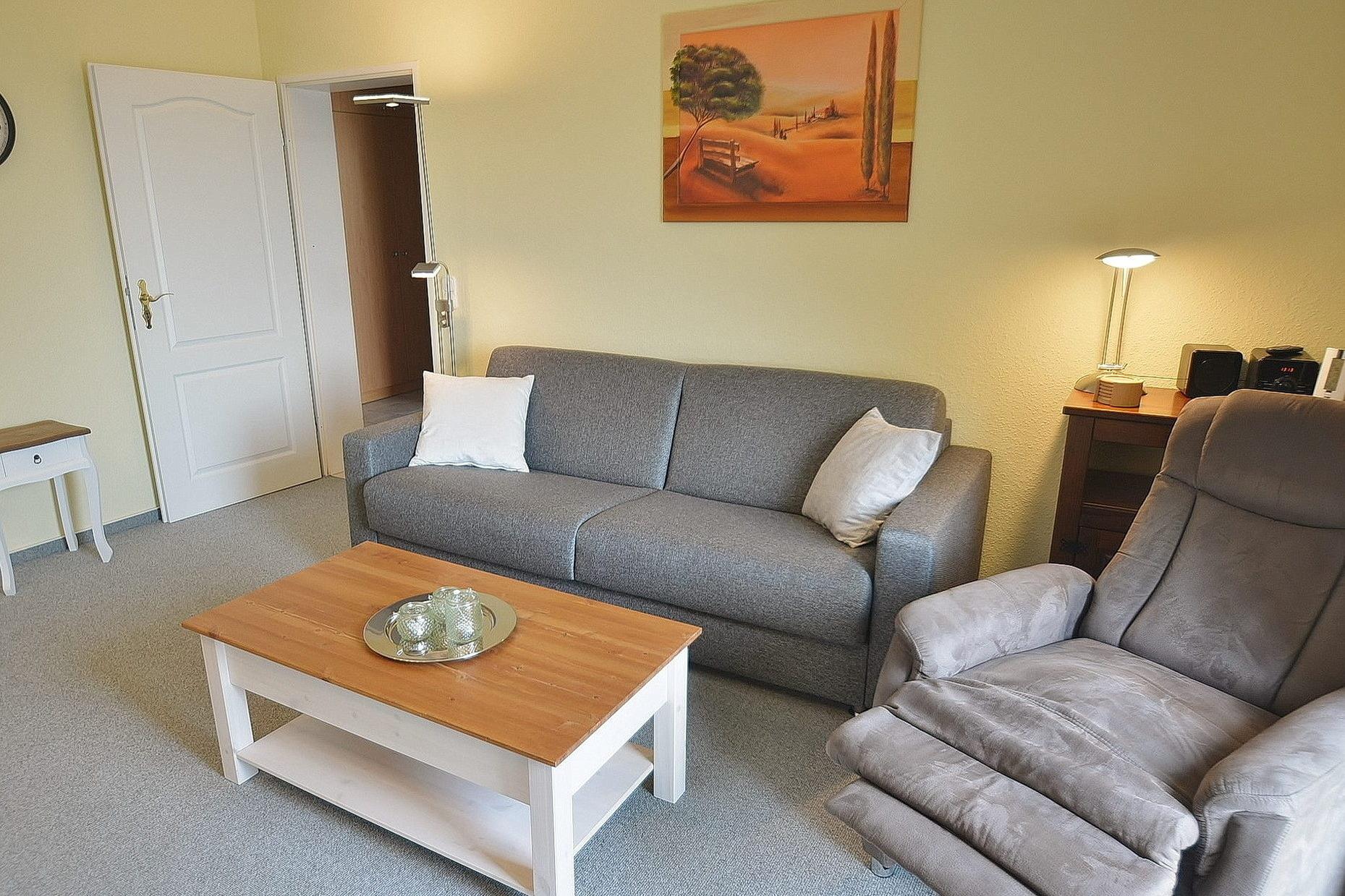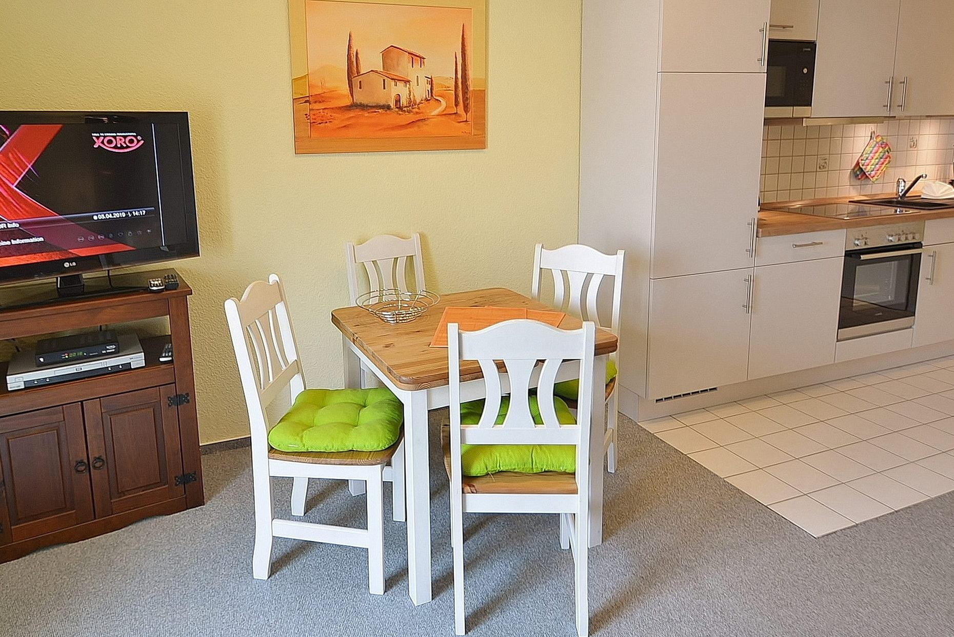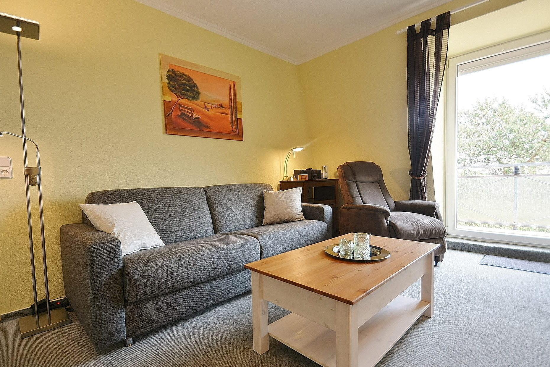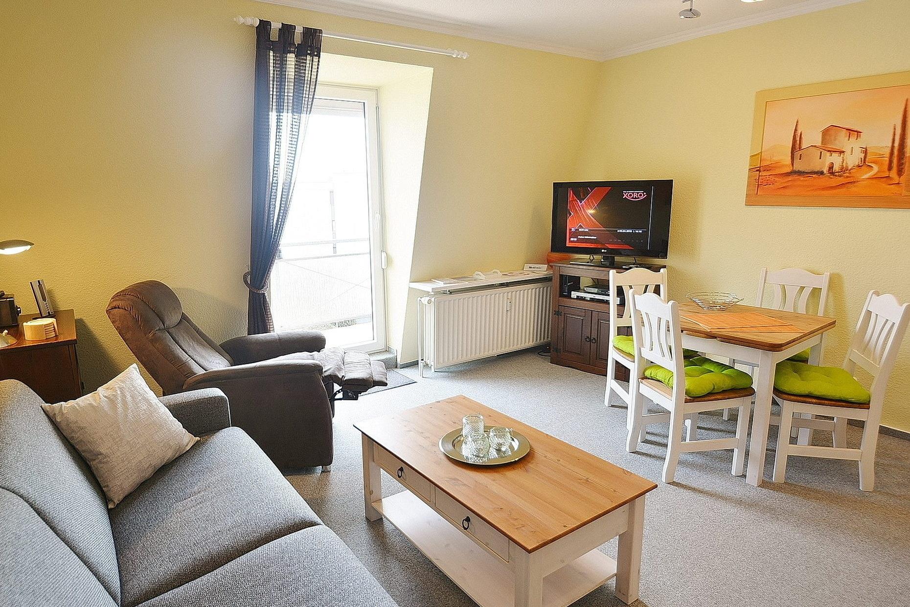 Modern eingerichtetes Wohn- und Esszimmer mit direktem Zugang zum Balkon. Das Wohn- und Esszimmer ist mit einer bequemen Schlafcouch (160x200cm), einem Sessel, einem Couchtisch und einem Essplatz für 4 Personen ausgestattet. Zur Unterhaltung stehen ein Flachbildschirm, ein Bluray-Player und eine Mini-Stereoanlage zur Verfügung. Der Wohn- und Essbereich ist mit Teppichboden ausgelegt. Das Fenster lässt sich durch ein Außenrollo vollständig verdunkeln.