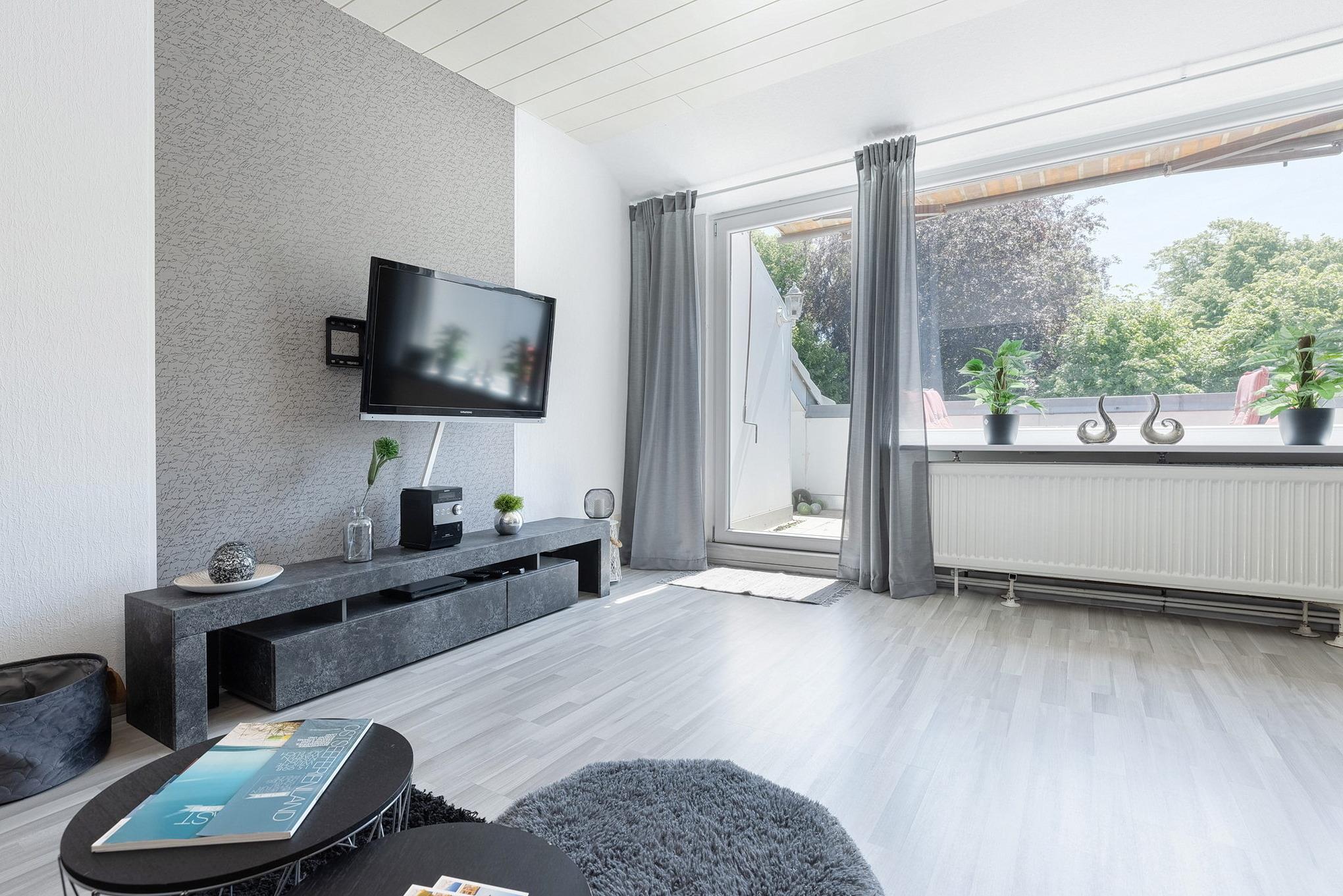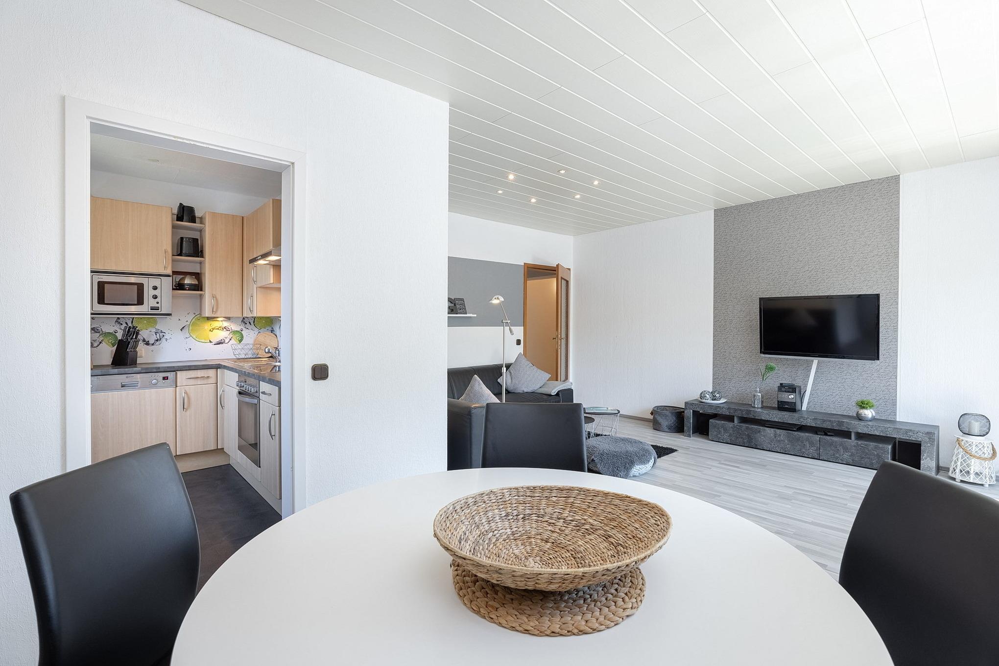 Helles, freundliches modern eingerichtetes Wohn- und Esszimmer mit direktem Zugang zum Balkon. Das Wohn- und Esszimmer ist mit einem Essplatz für 4 Personen, einer Eckcouch, einem Couchtisch, Ministereoanlage mit CD-Player, Flachbild-Fernseher und DVD-Player ausgestattet. Das Wohn- und Esszimmer ist mit Laminatboden ausgelegt.