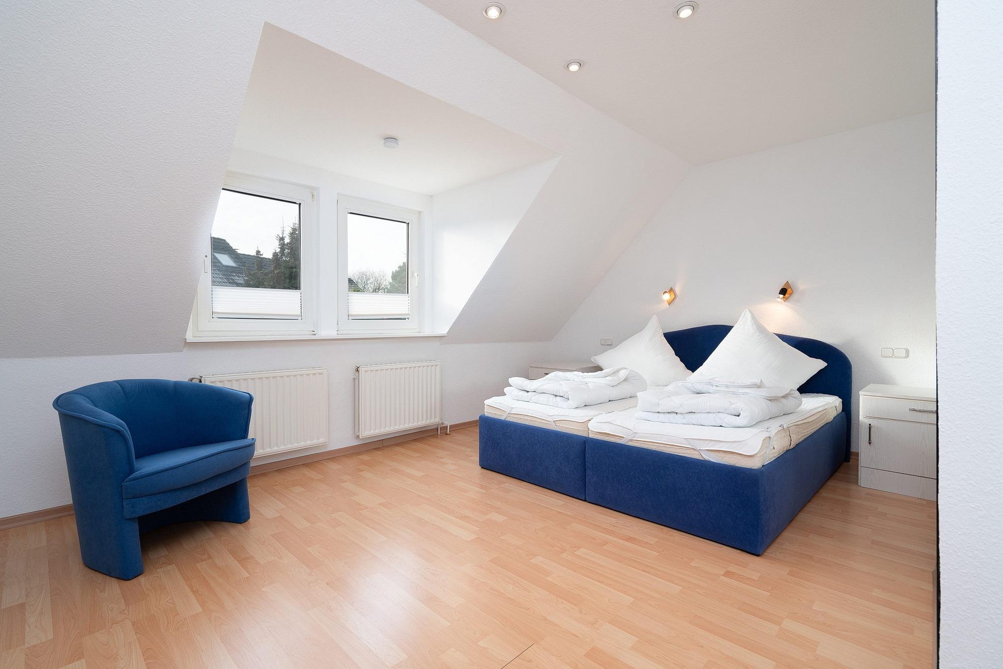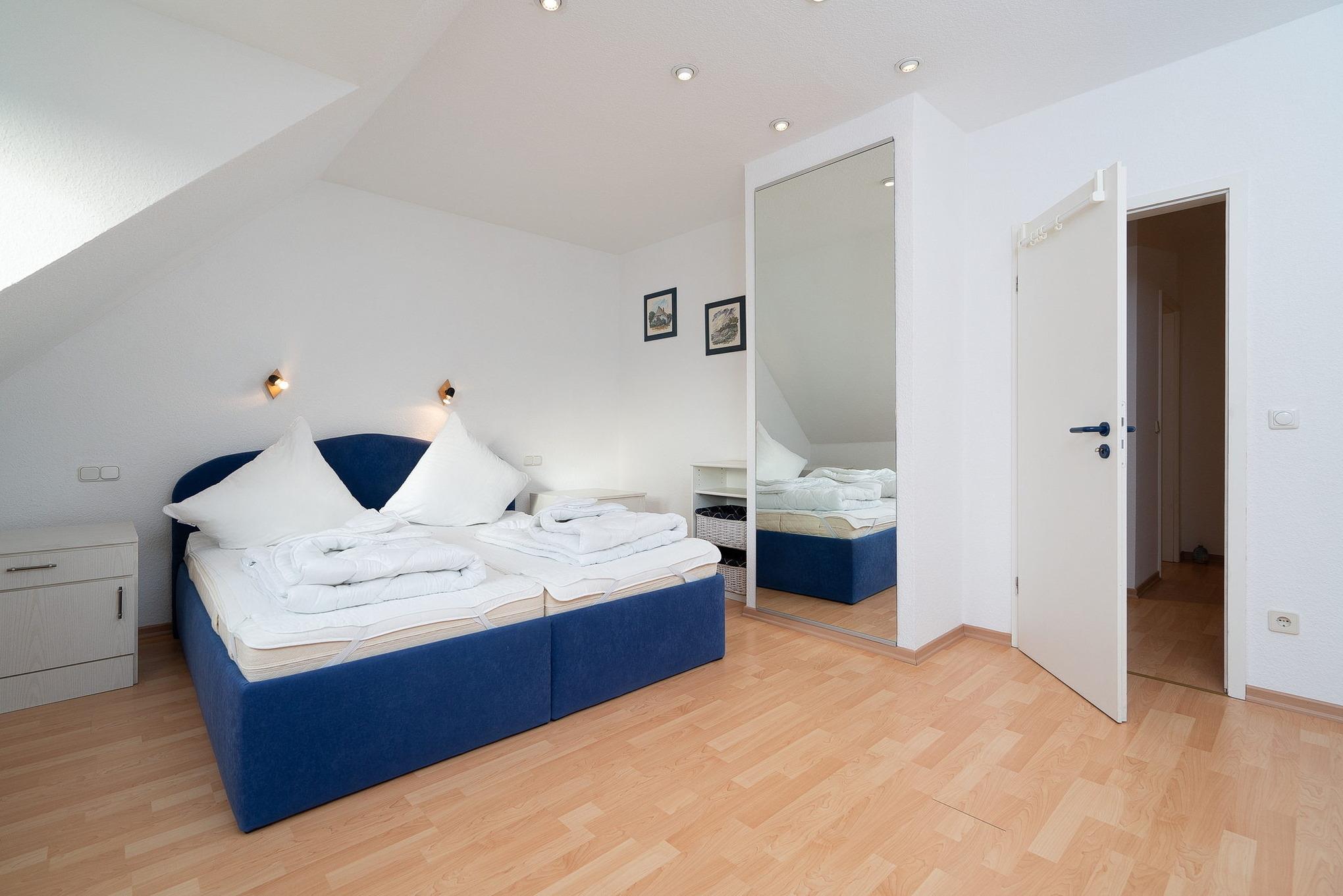 Das Schlafzimmer befindet sich im Obergeschoss und ist mit einem Doppelbett (Größe: 2x90x200cm) und einem Kleiderschrank ausgestattet. Die Fenster lassen sich mit Plissees verdunkeln.