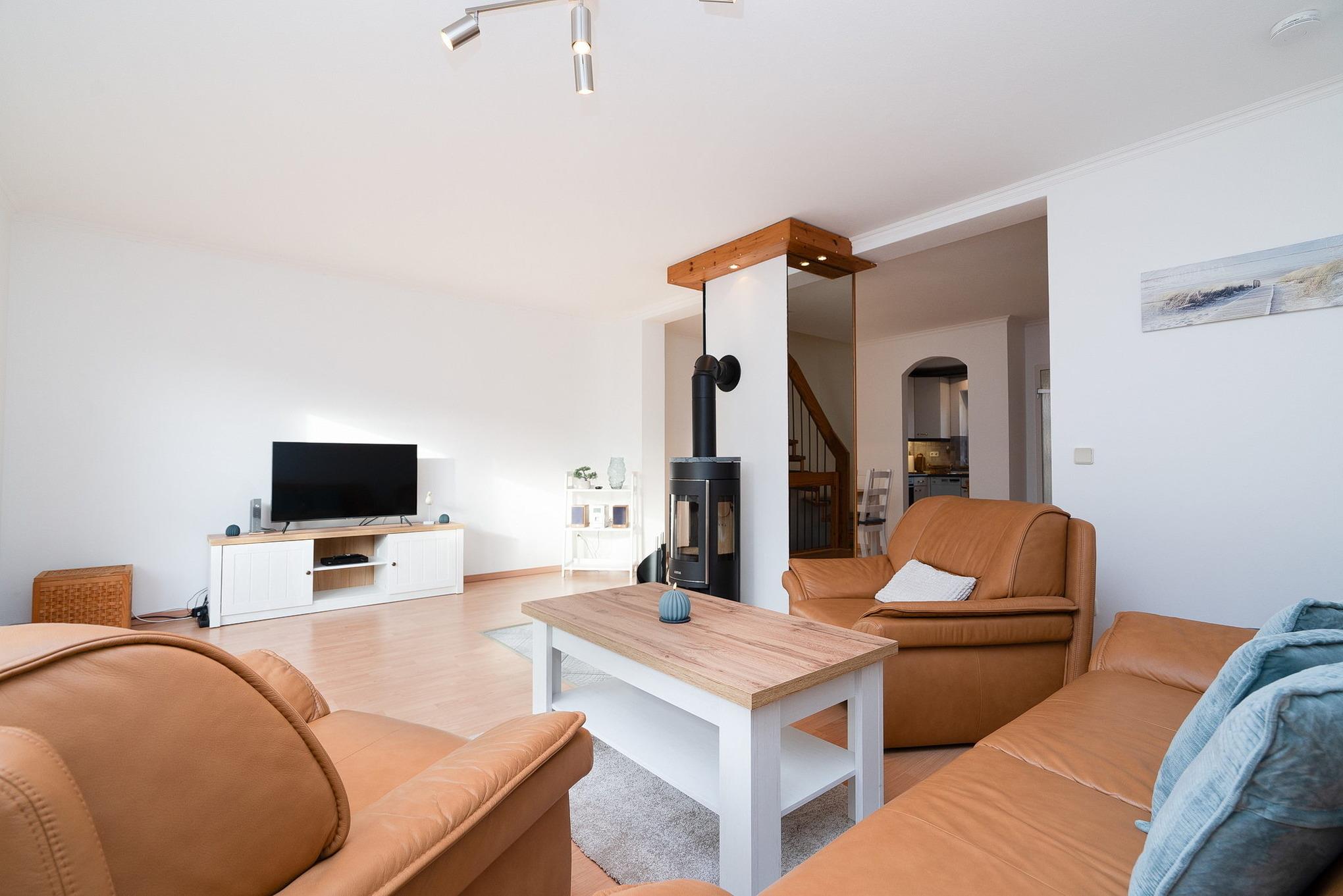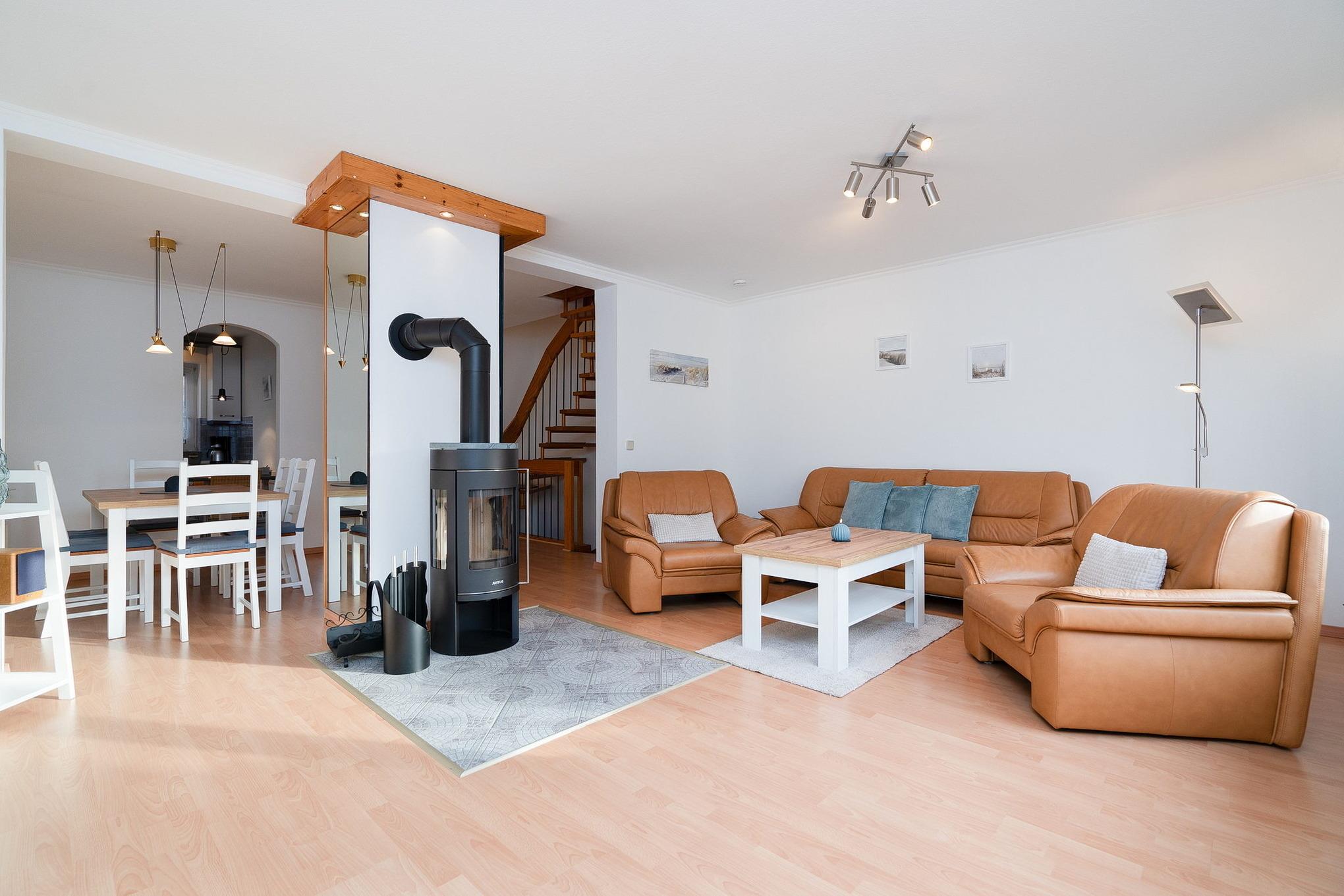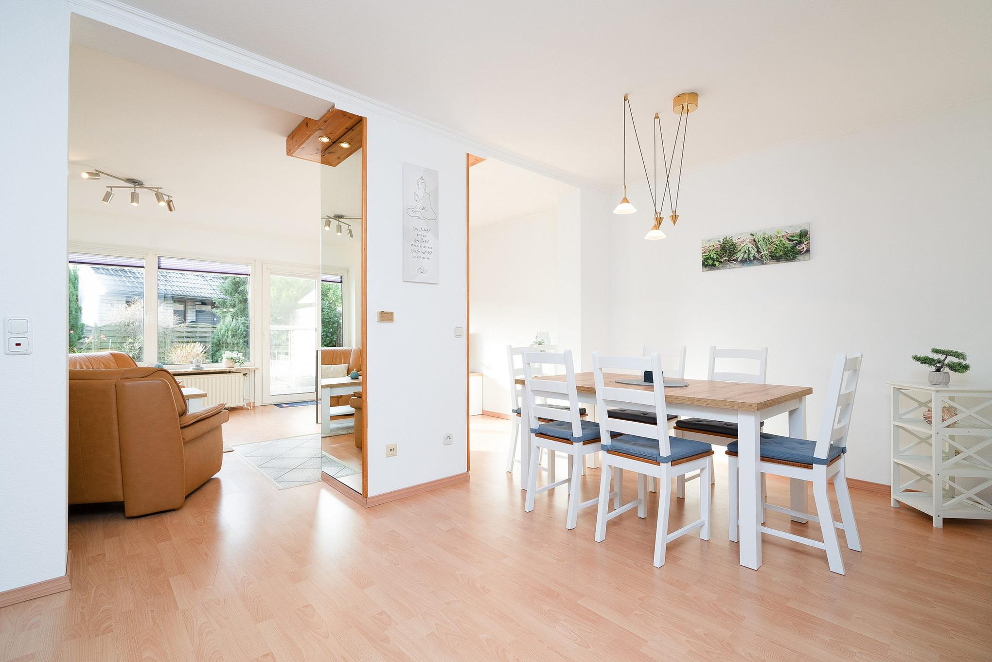 Das große Wohnzimmer (Laminatboden) ist mit Sat-TV ausgestattet. Es verfügt über 2 Sessel und eine Couch, sowie einen Esstisch mit 6 Stühlen. Es befindet sich im Erdgeschoss.