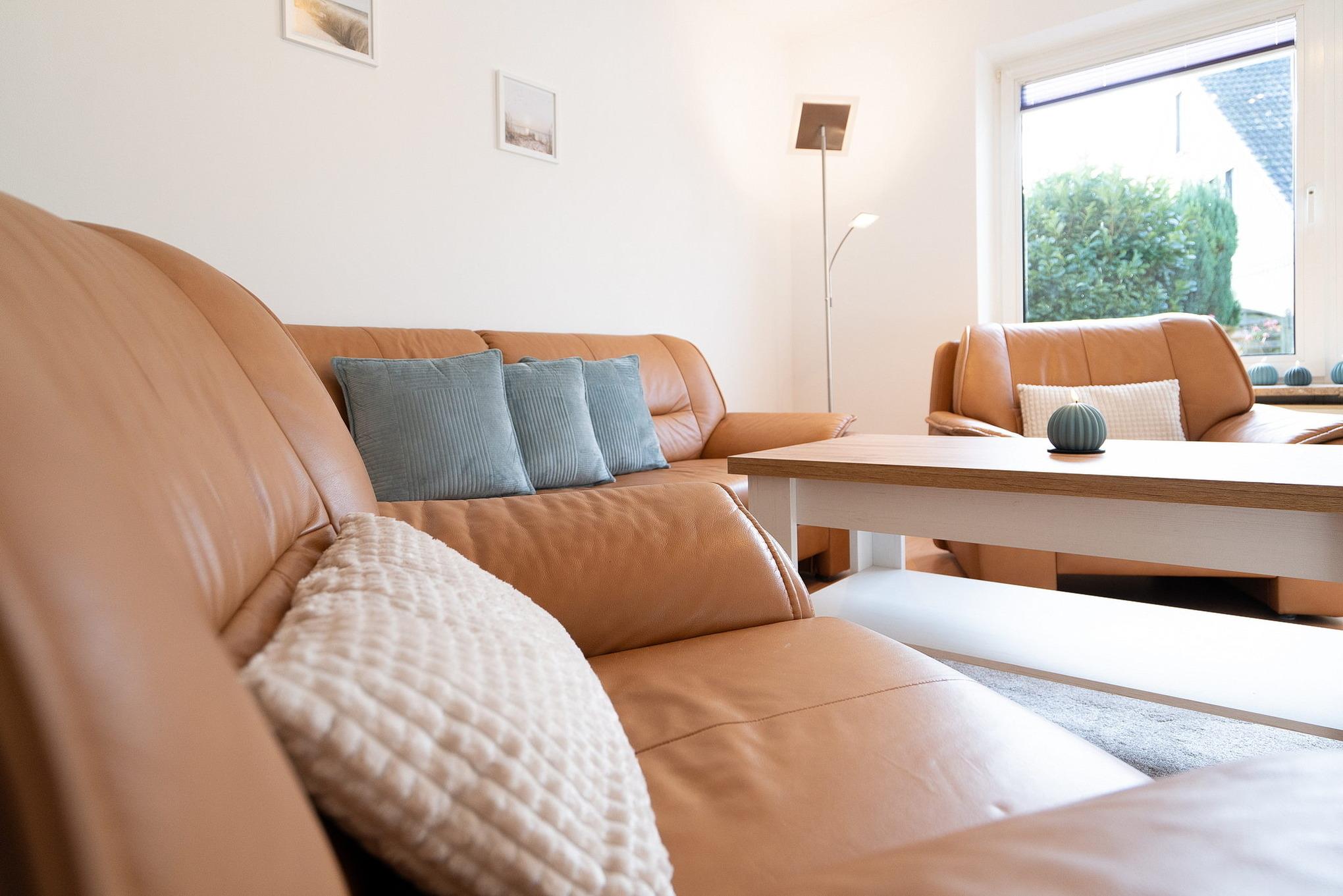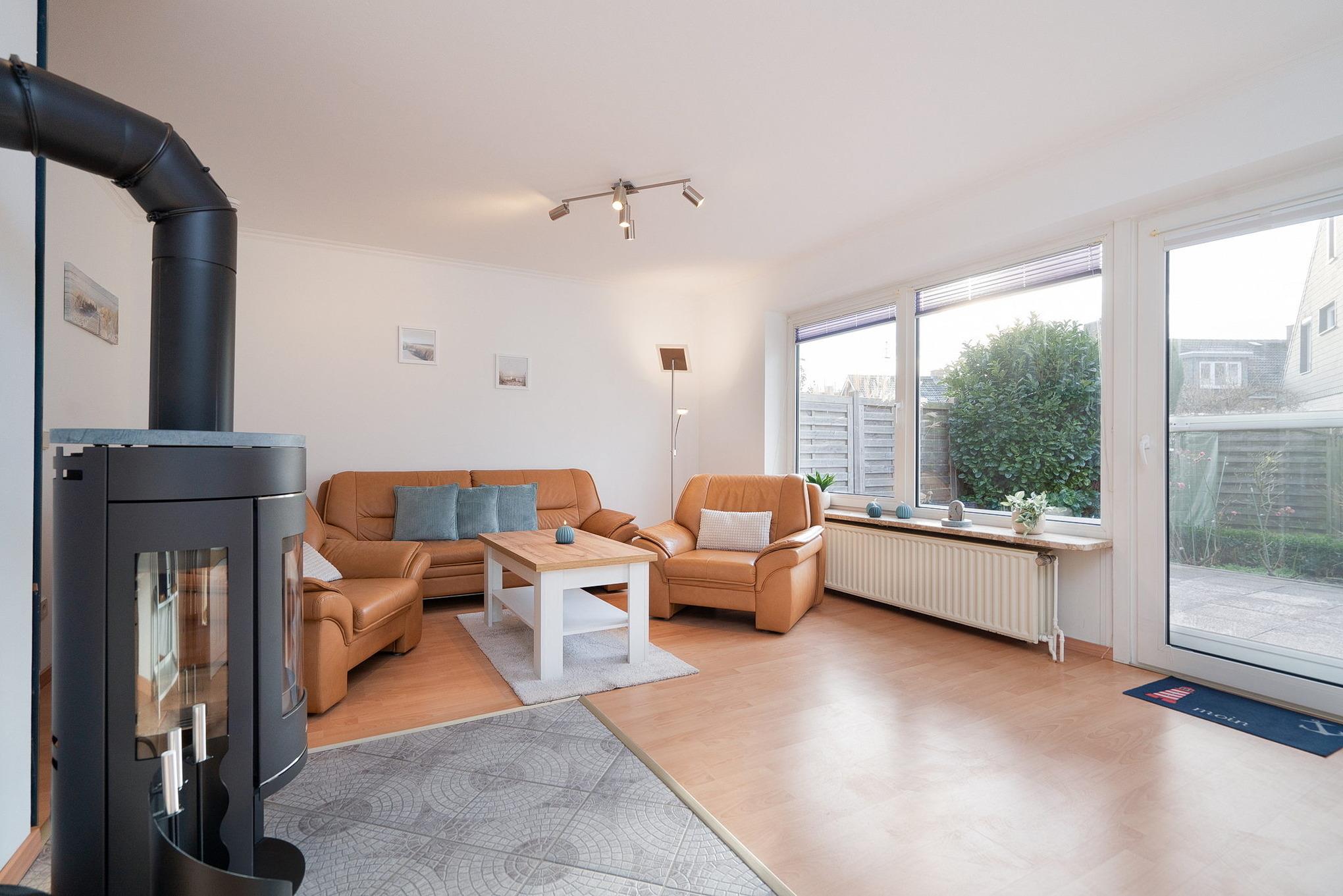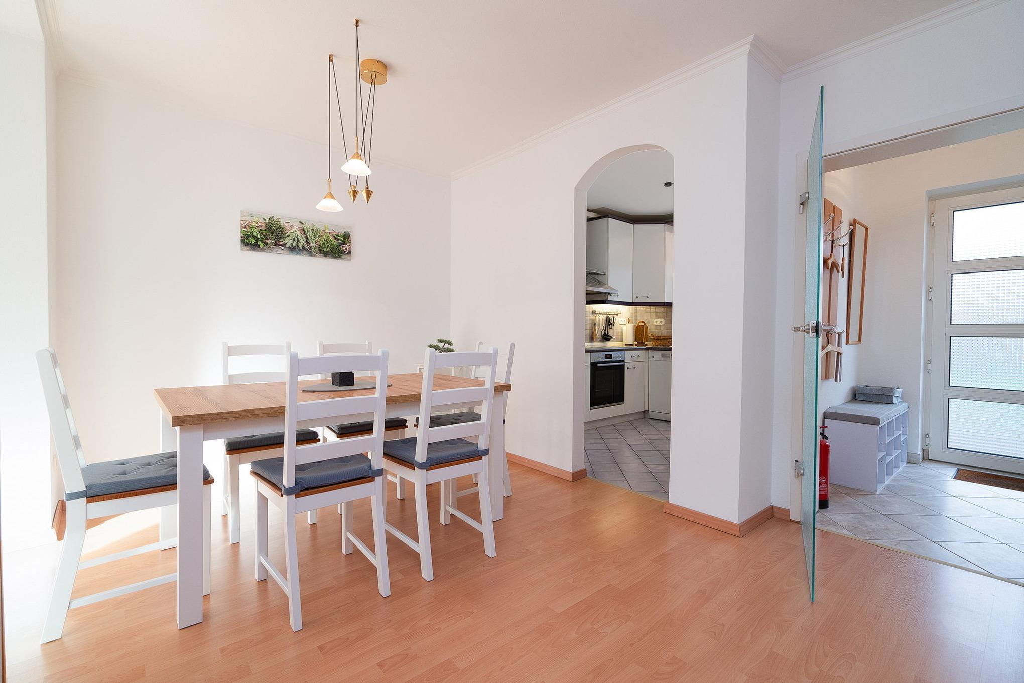 Das große Wohnzimmer (Laminatboden) ist mit Sat-TV ausgestattet. Es verfügt über 2 Sessel und eine Couch, sowie einen Esstisch mit 6 Stühlen. Es befindet sich im Erdgeschoss.