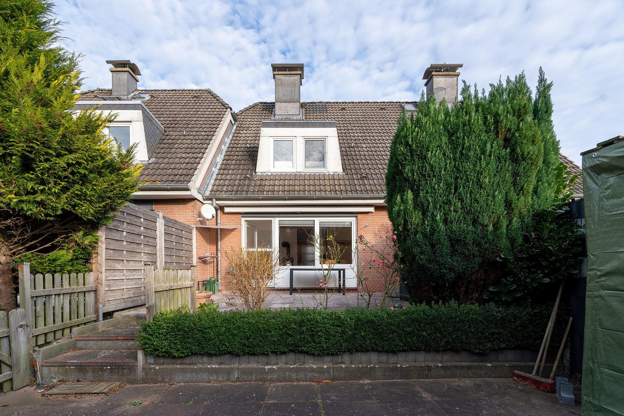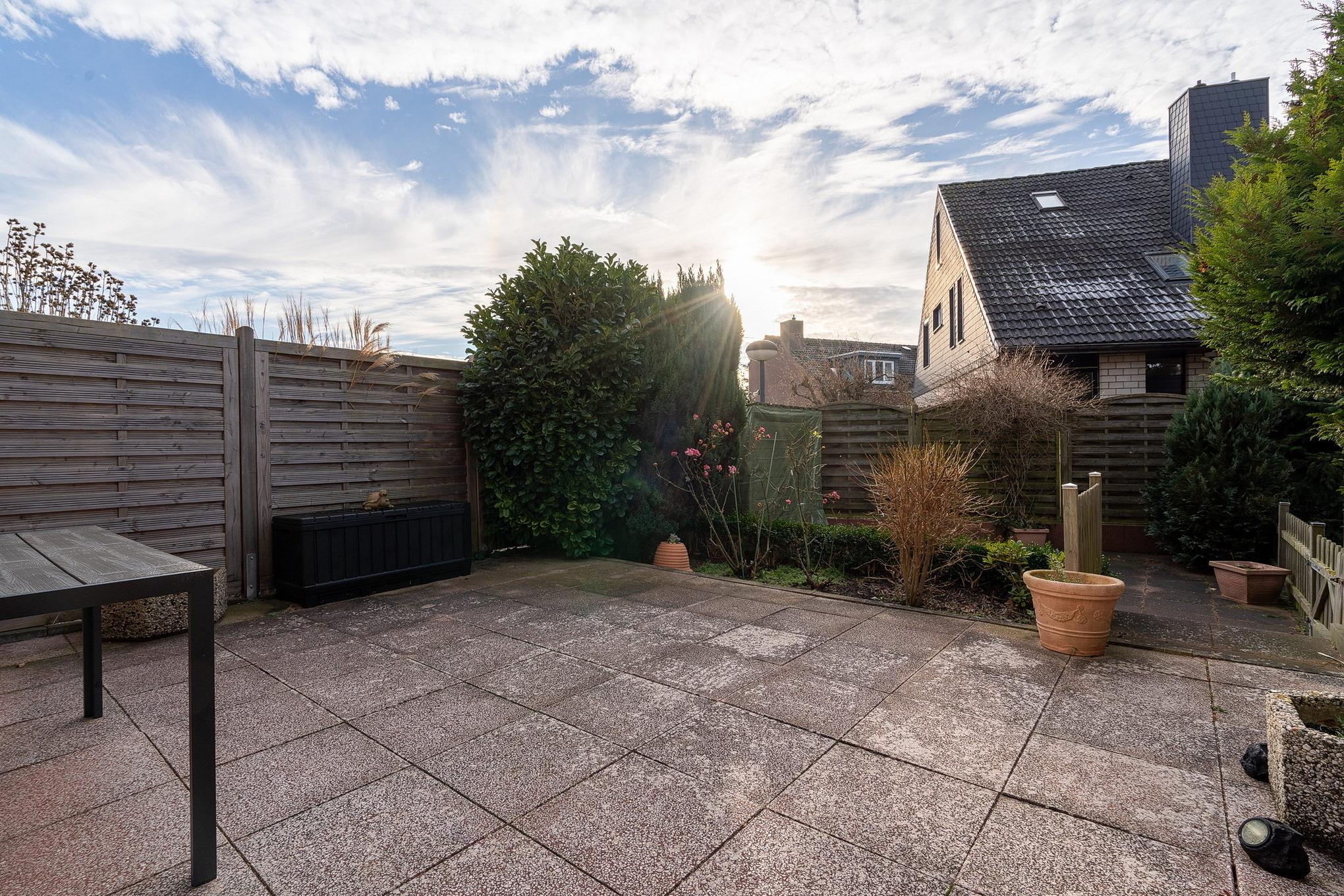 Das hübsche Reihenhaus liegt in einer absolut ruhigen Gegend. Es hat eine große Terrasse.
