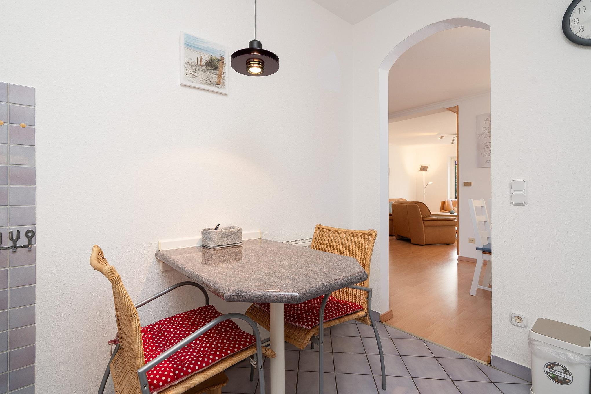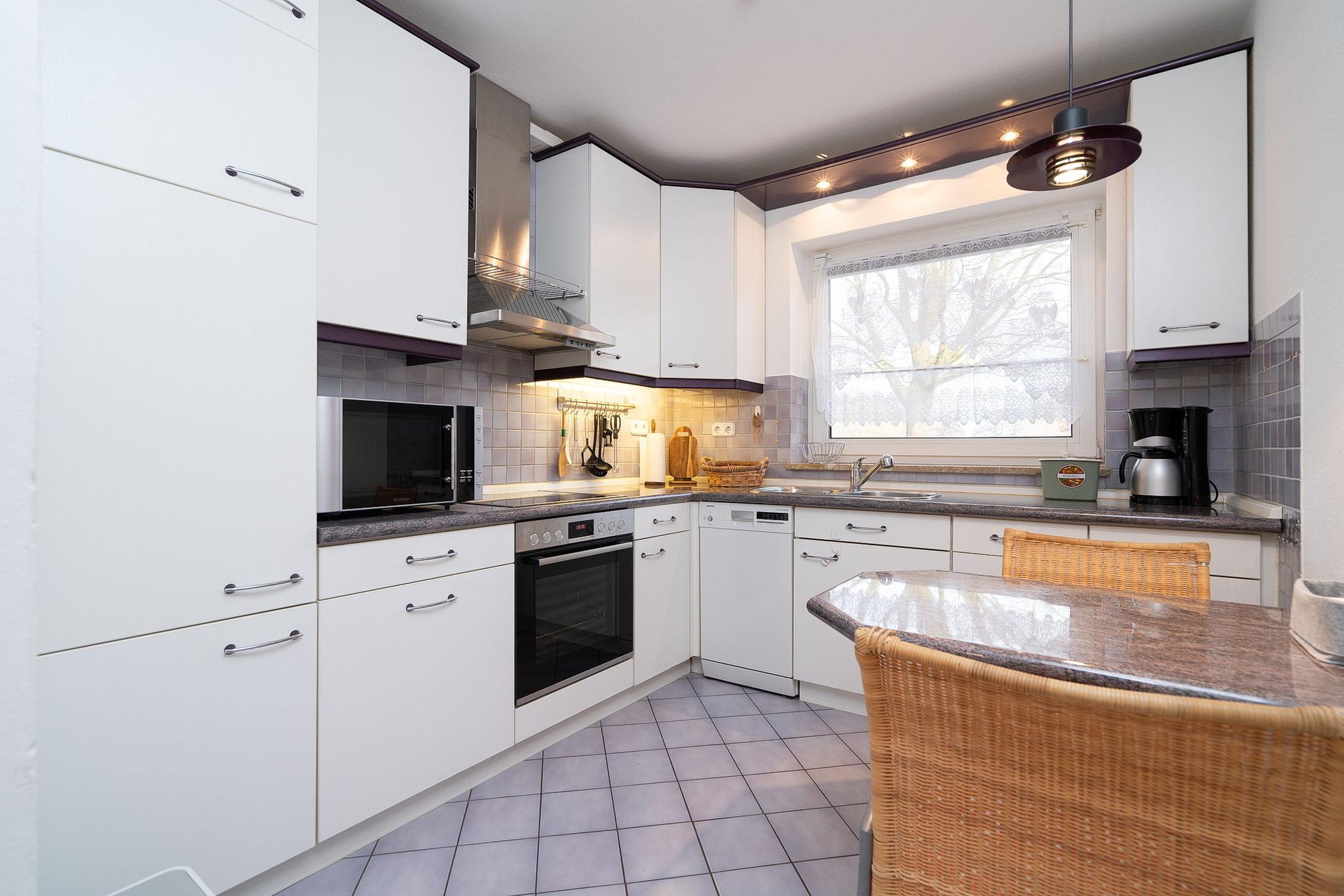 Eine abgeteilte, komplett ausgestattete Küche mit einem Tisch mit 2 Stühlen gefindet sich im Erdgeschoss. Es gibt eine Spülmaschine, Mikrowelle, Wasserkocher, Kaffeemaschine, Toaster sowie einen Backofen und 4 Platten Herd.