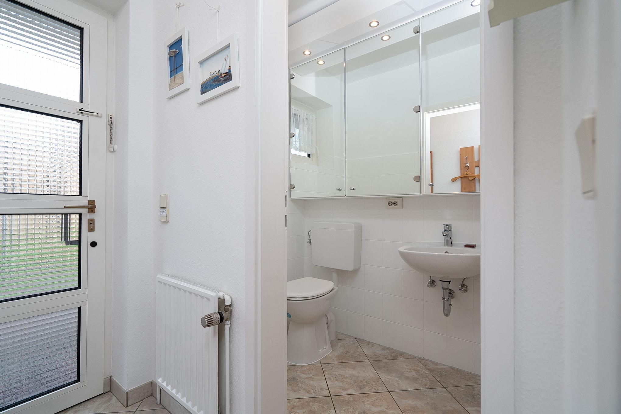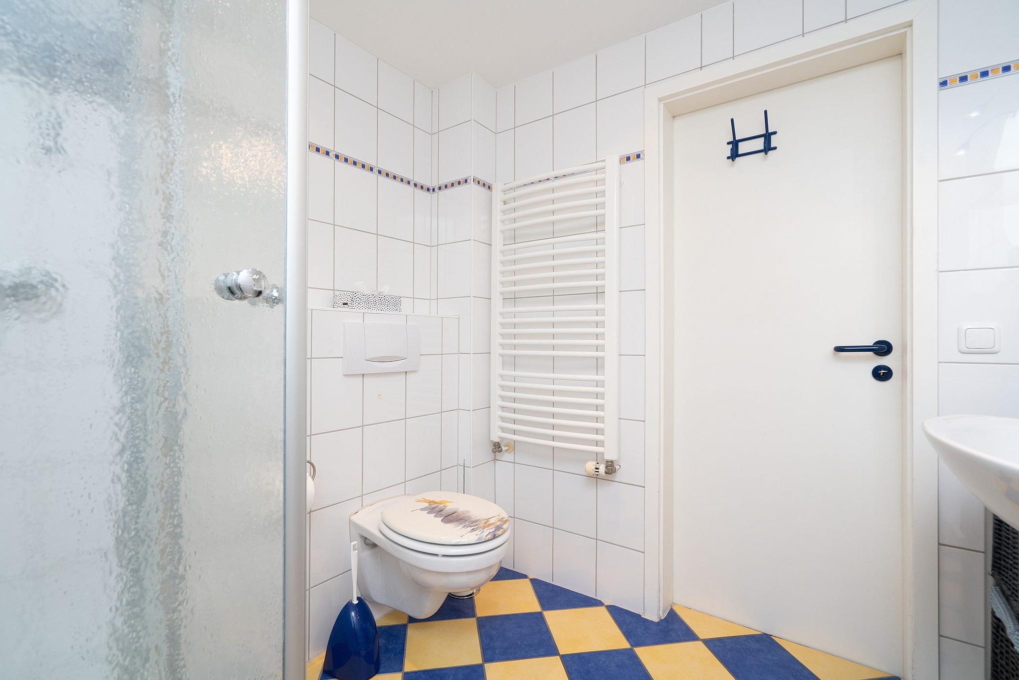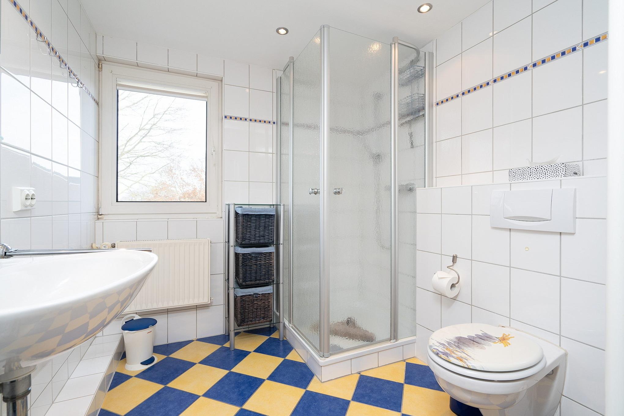 Modernes, hell gefliestes Tageslichtbad mit Dusche, WC und Waschbecken ist im Obergeschoss. Im Erdgeschoss befindet sich noch eine Gäste-Toilette mit Waschbecken.