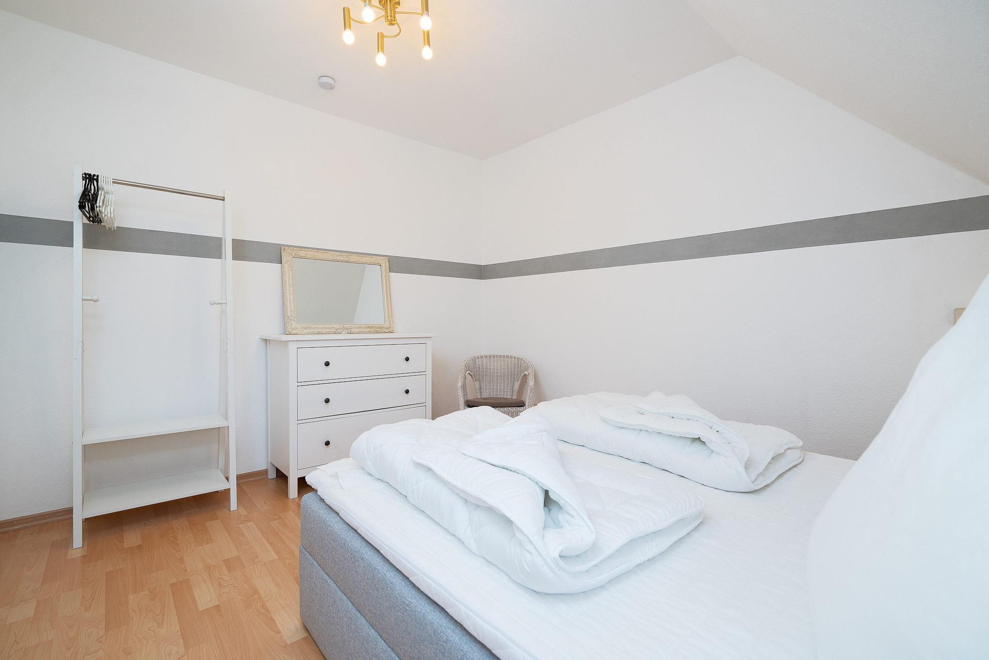Im Obergeschoss befindet sich ein Gästezimmer mit einem Doppelbett (160x200), einer Kommode und kleiner Garderobestange.