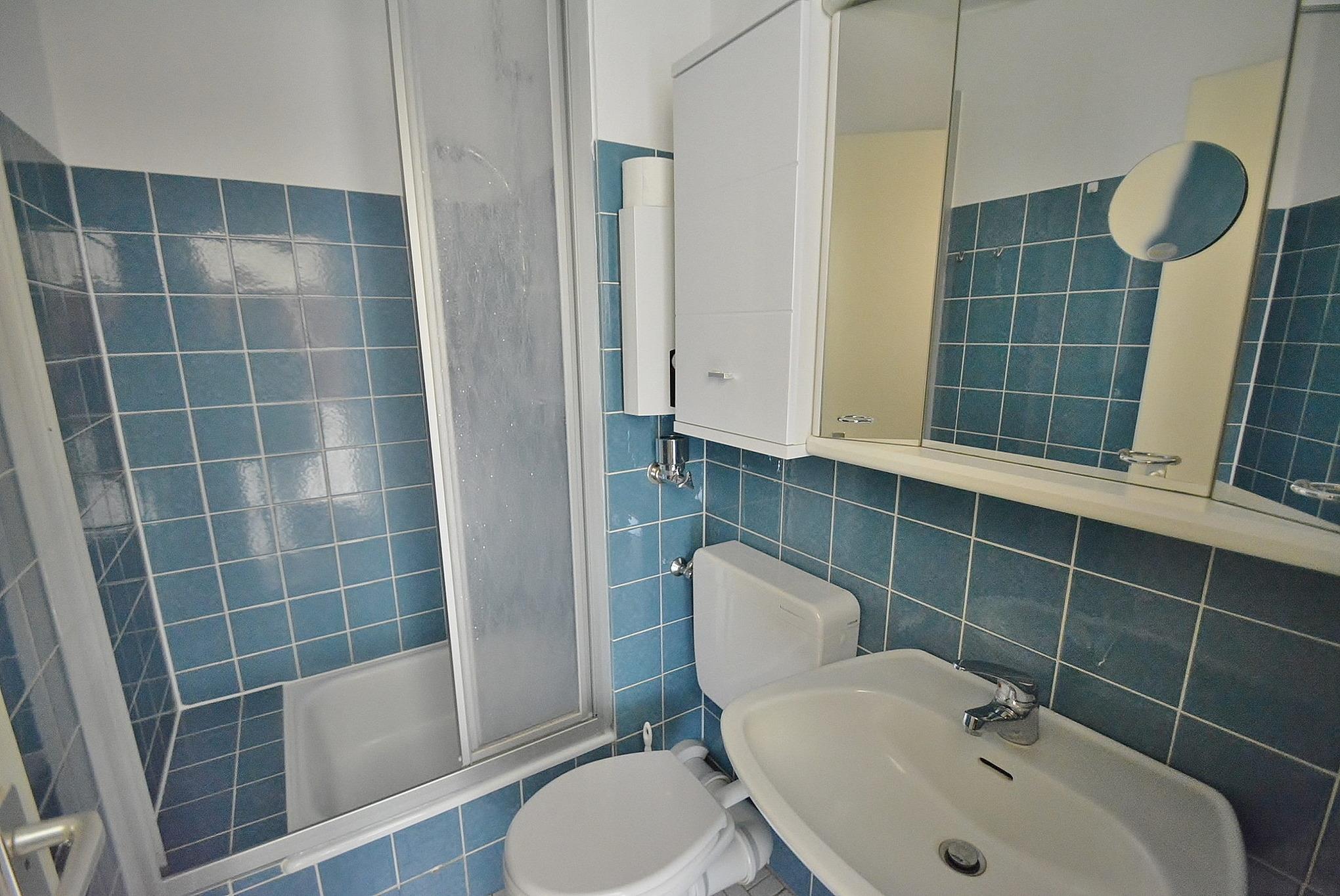 Kleines Badezimmer mit Dusche, WC und Waschbecken.