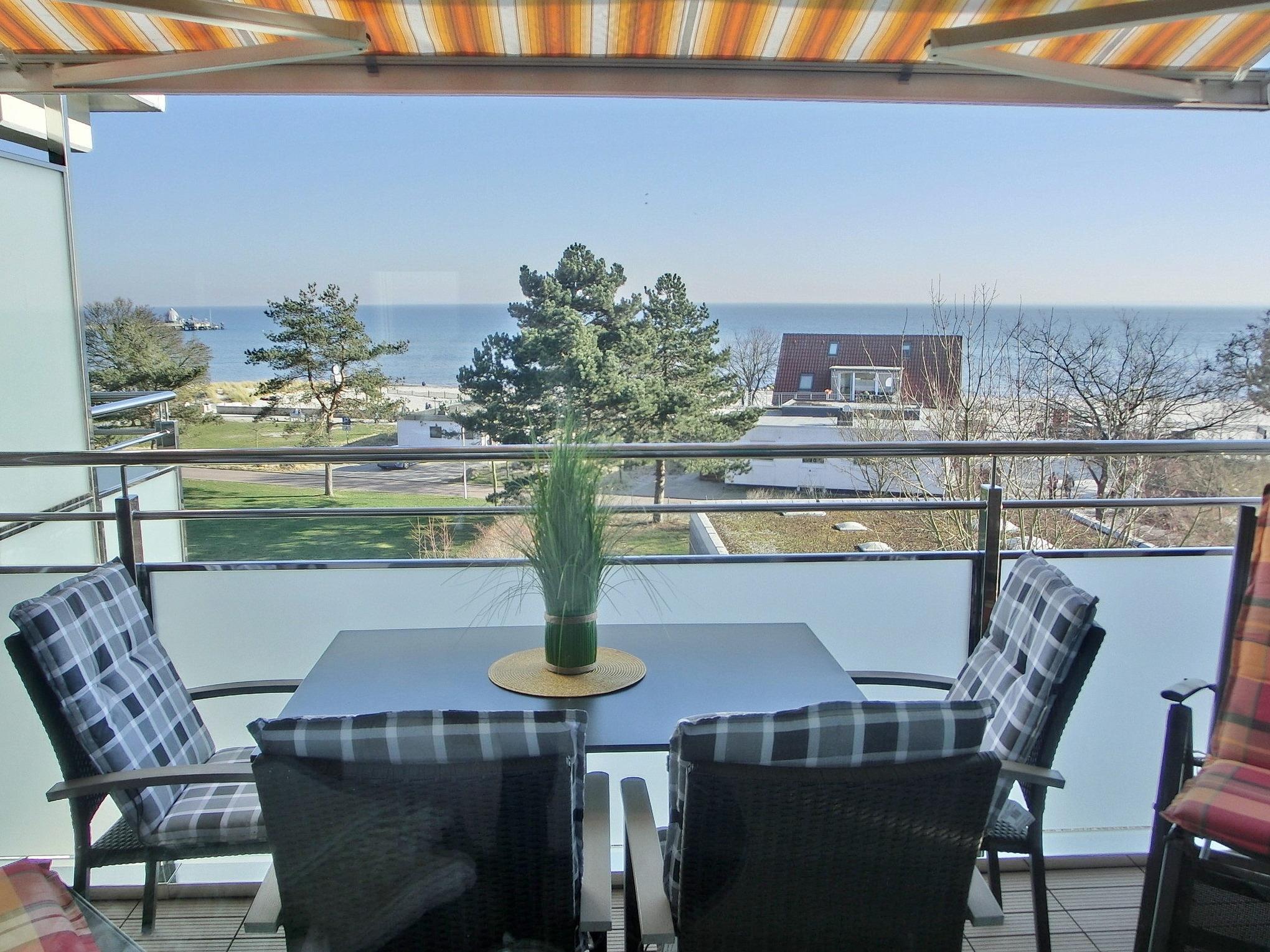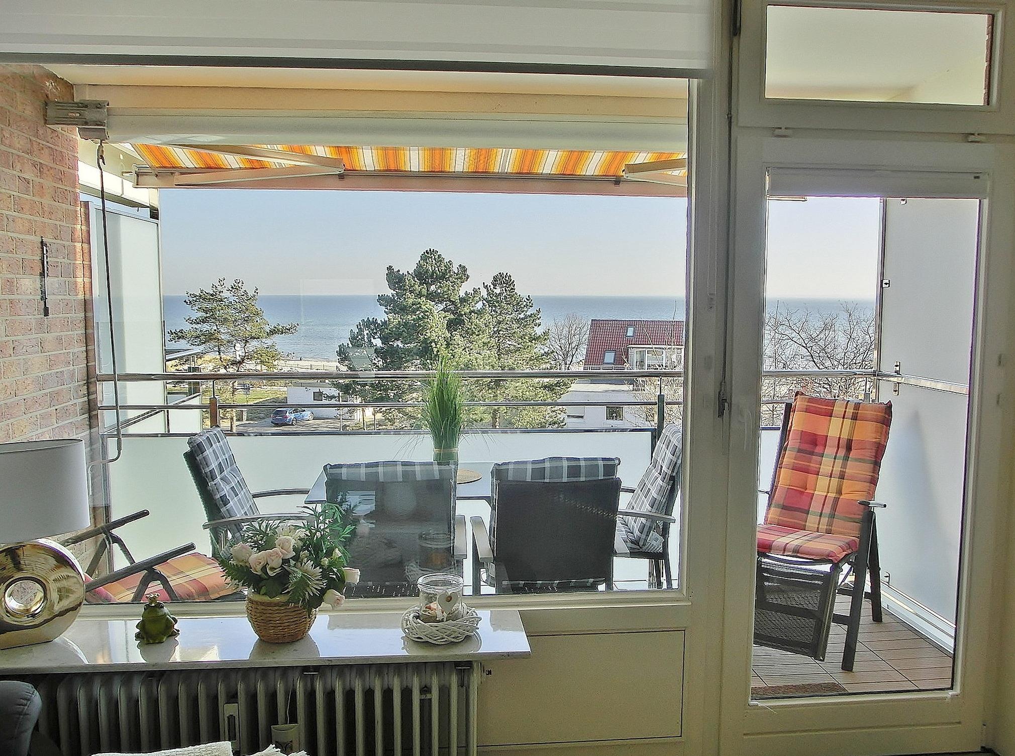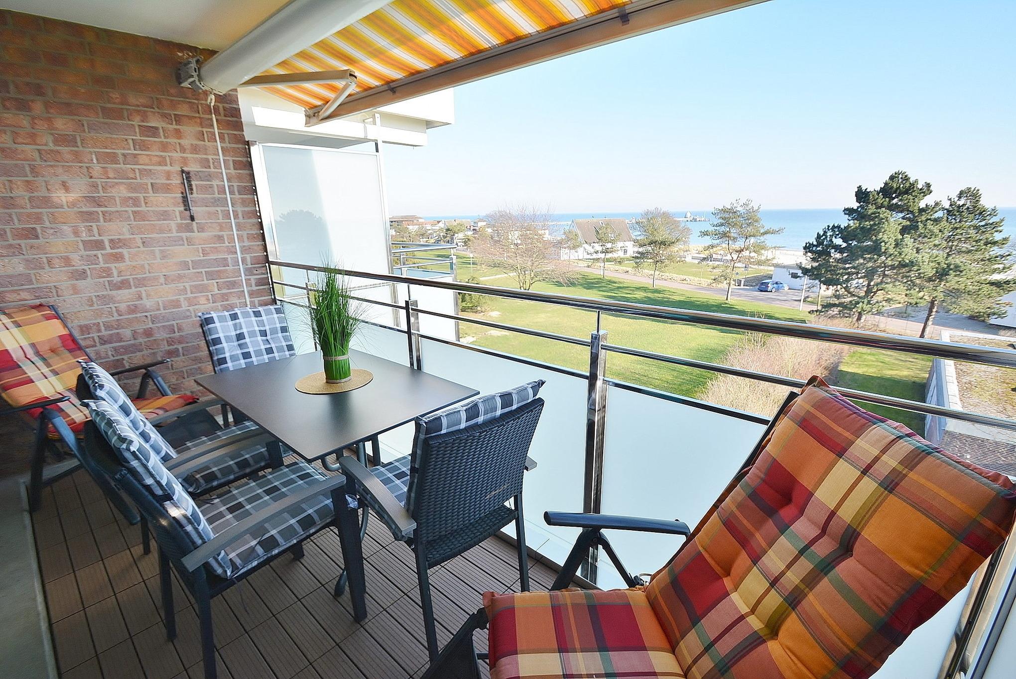 Balkon in süd-östliche Richtung mit Markise und schönem Meerblick, PKW-Stellplatz am Haus, Waschmaschine und Trockner befinden sich im Haus und können gegen Gebühr benutzt werden. Kostenloser WLAN-Anschluss.