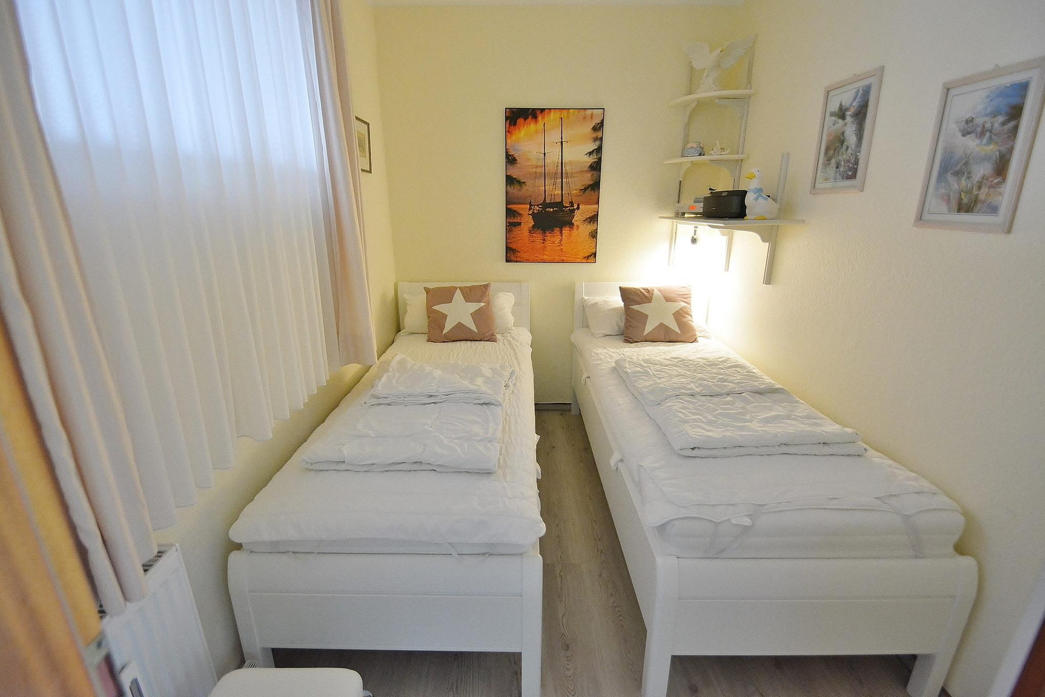 Kleines Schlafzimmer mit 2 Einzelbetten (je 80x190cm). Der Raum ist mit Vinylboden ausgelegt, das Fenster lässt sich durch einen Vorhang verdunkeln.