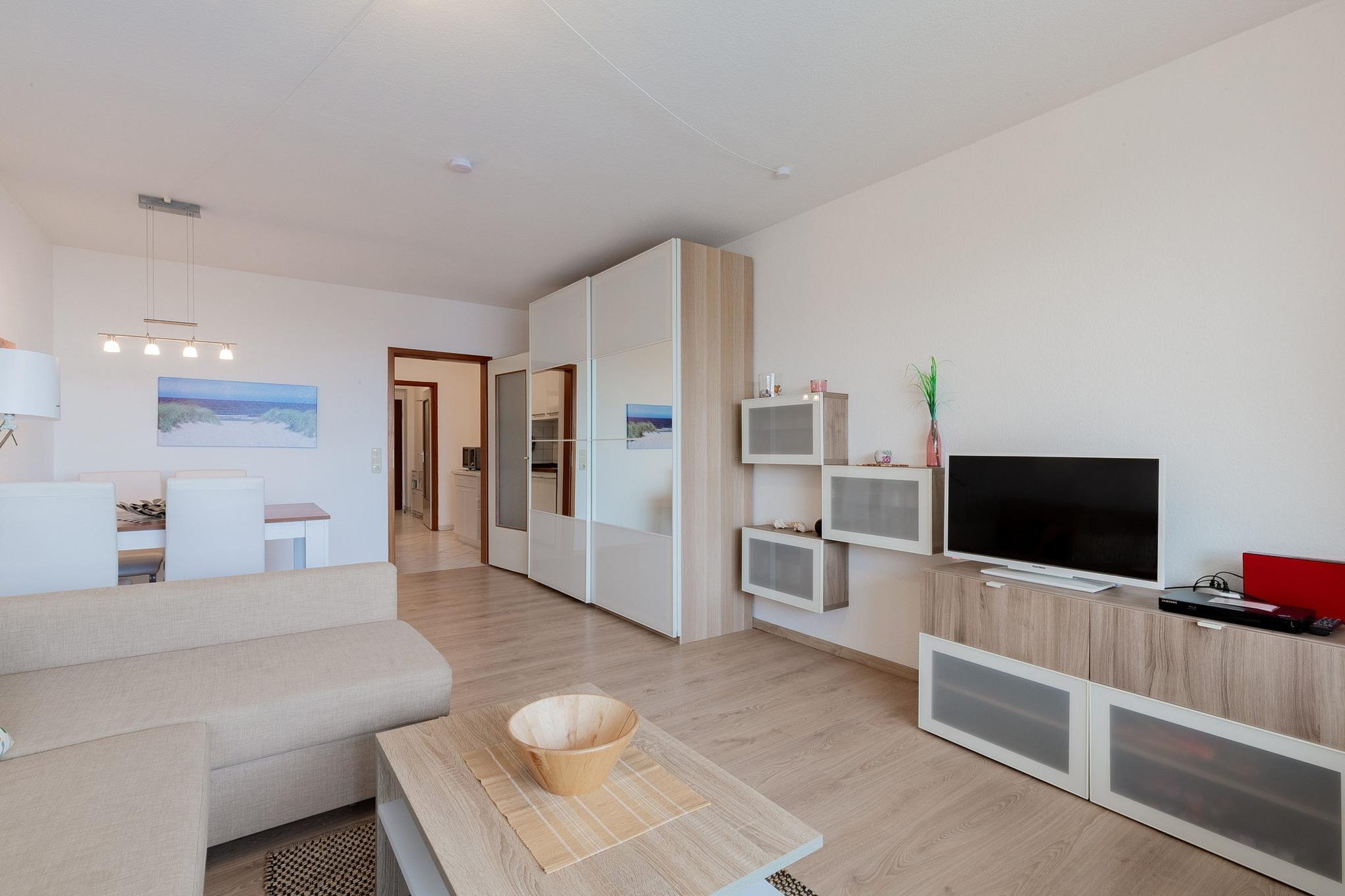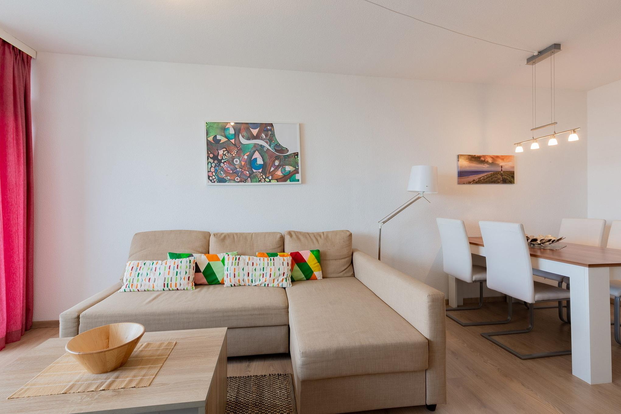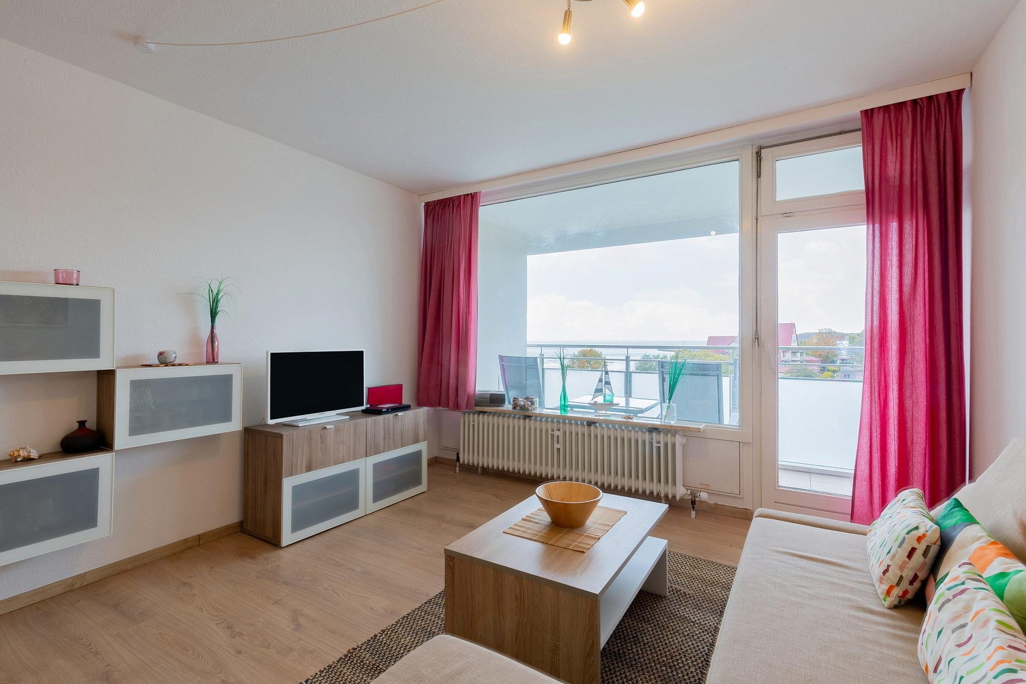 Modern ausgestattetes, helles Wohn- und Esszimmer mit direktem Zugang zum Balkon in süd-östliche Richtung mit Blick auf das Meer. Das Wohn- und Esszimmer ist mit einer Eckcouch (Schlafcouch: 140x200cm), einem Couchtisch, einem Essplatz für 4 Personen und einem großen Kleiderschrank ausgestattet. Zur Unterhaltung stehen ein Flachbildfernseher, ein Blue-Ray-Player und eine hochwertige Musikanlage mit CD-Player zur Verfügung. Das Wohn- und Esszimmer ist mit Laminatboden ausgelegt, das Fenster lässt sich durch einen Vorhang verdunkeln.