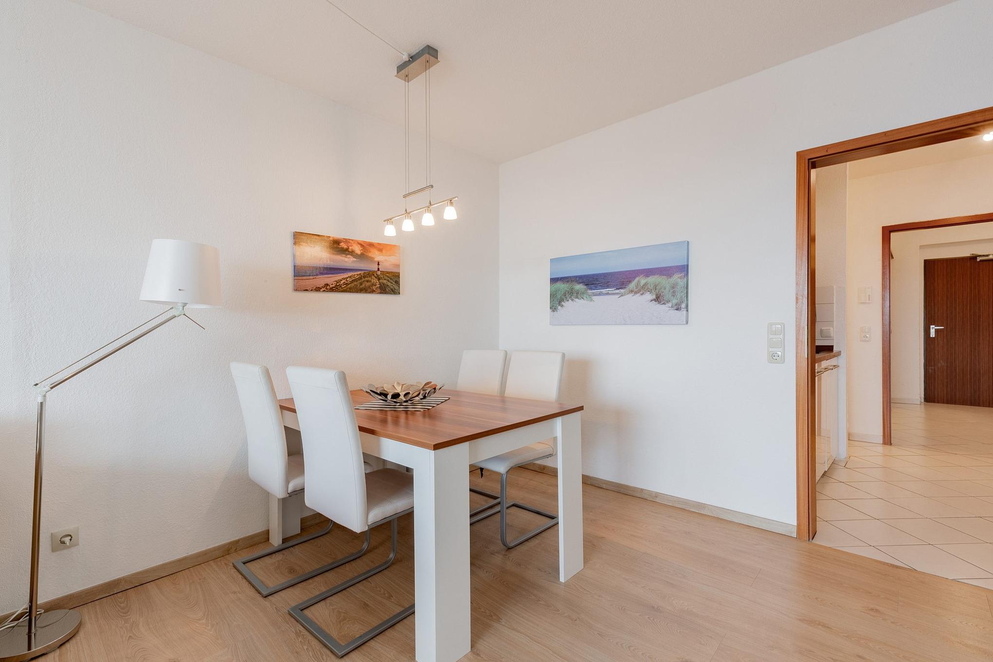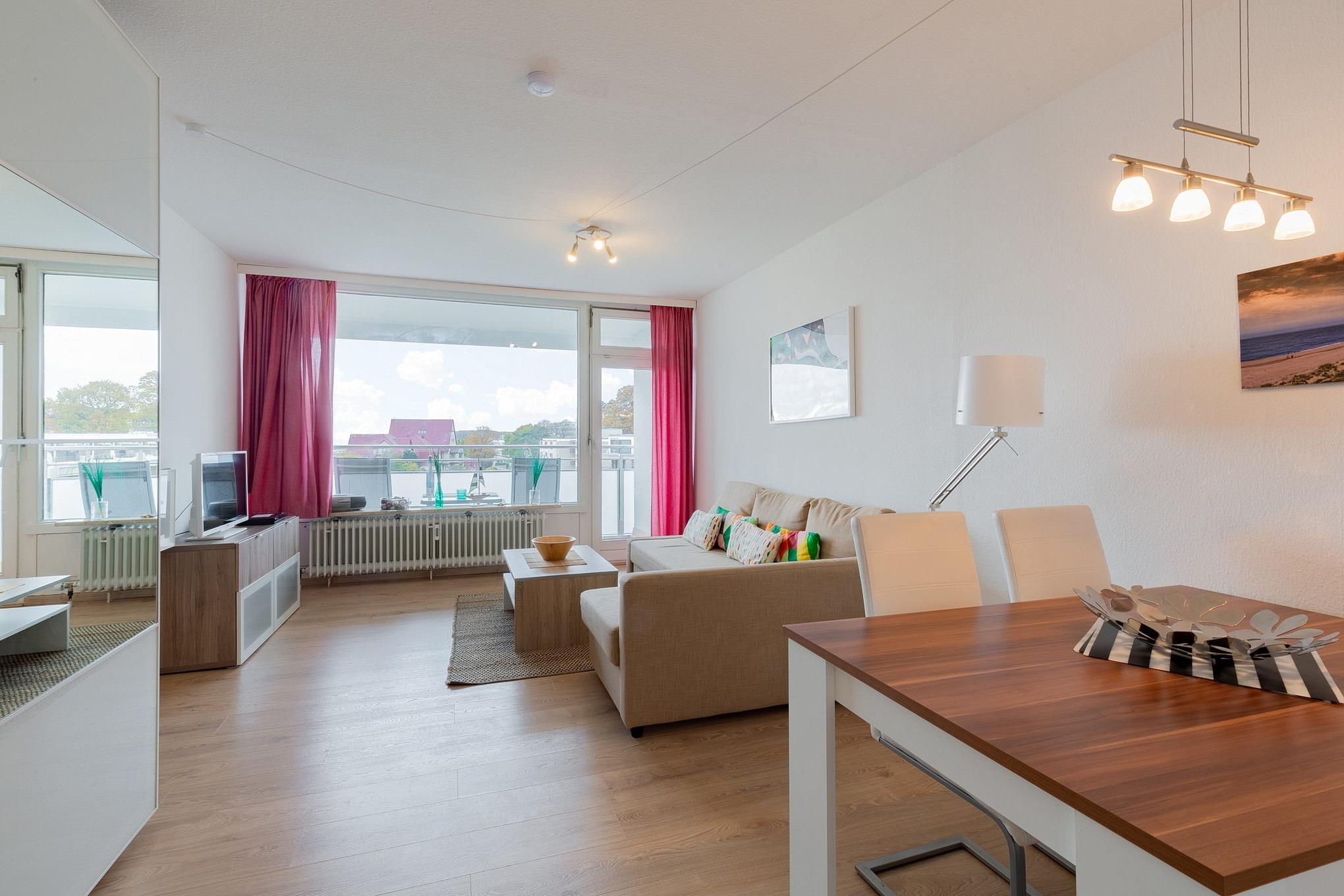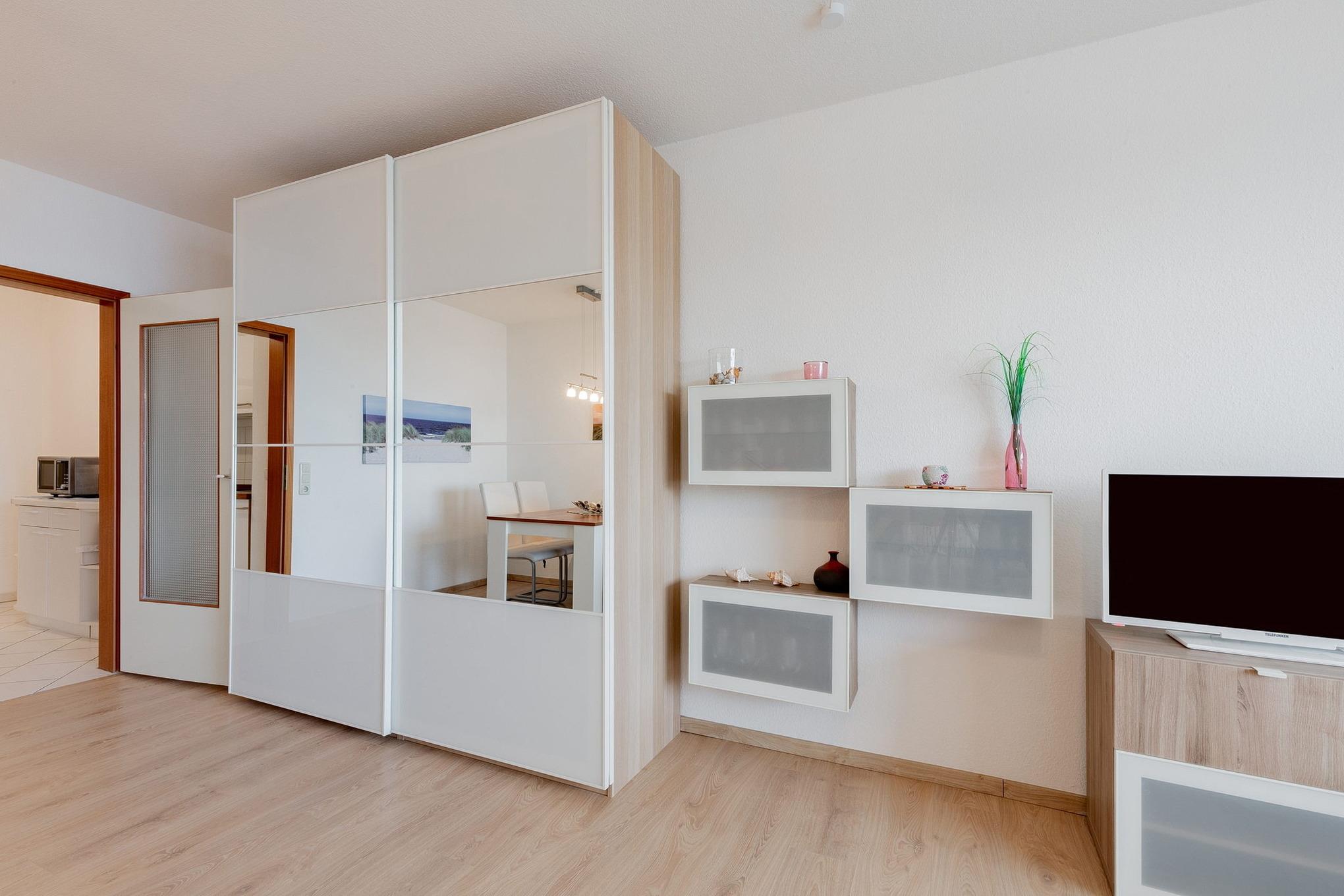 Modern ausgestattetes, helles Wohn- und Esszimmer mit direktem Zugang zum Balkon in süd-östliche Richtung mit Blick auf das Meer. Das Wohn- und Esszimmer ist mit einer Eckcouch (Schlafcouch: 140x200cm), einem Couchtisch, einem Essplatz für 4 Personen und einem großen Kleiderschrank ausgestattet. Zur Unterhaltung stehen ein Flachbildfernseher, ein Blue-Ray-Player und eine hochwertige Musikanlage mit CD-Player zur Verfügung. Das Wohn- und Esszimmer ist mit Laminatboden ausgelegt, das Fenster lässt sich durch einen Vorhang verdunkeln.