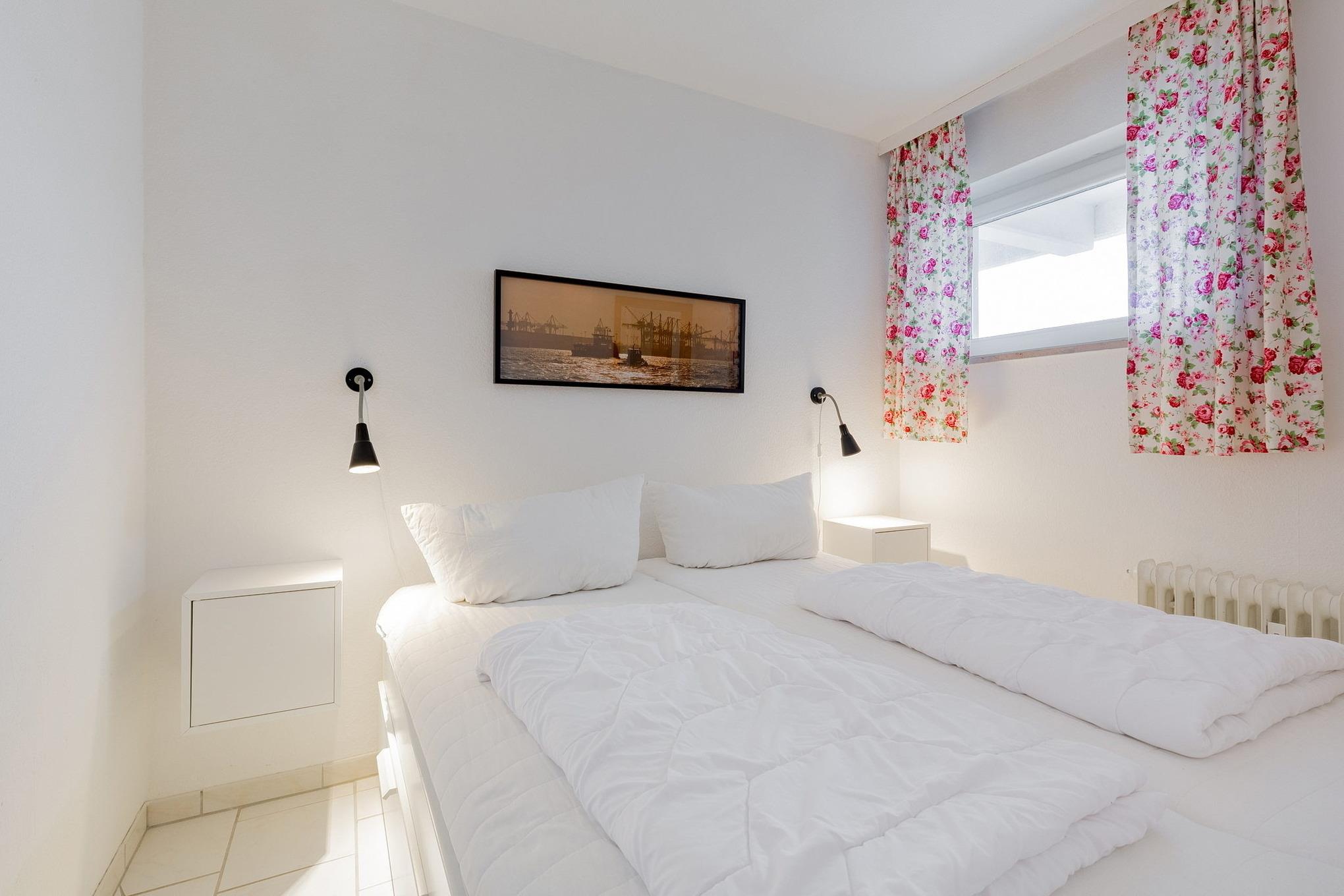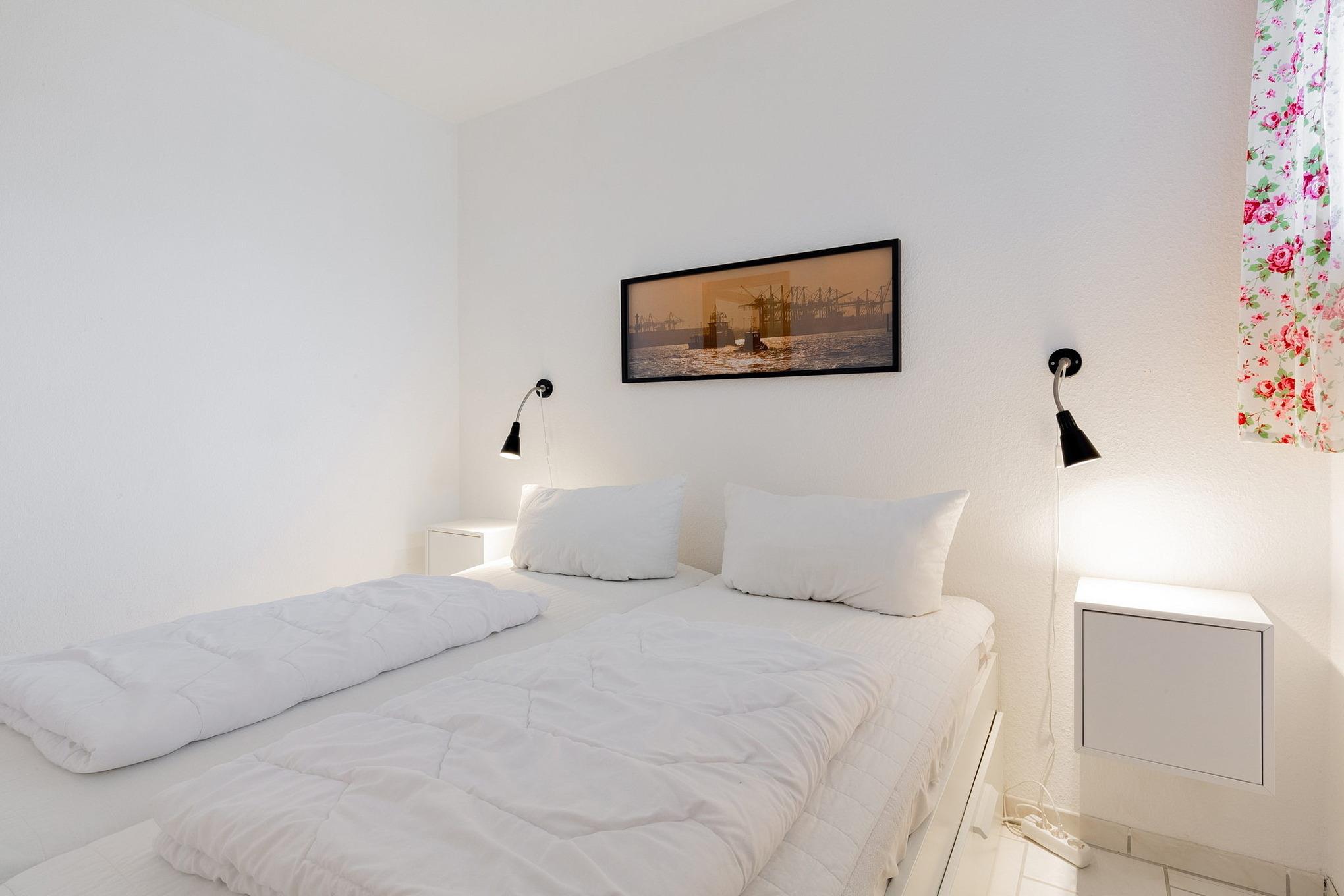 Kleines, separates Schlafzimmer mit Doppelbett(2x80x200cm). Das Zimmer ist gefliest, das Zimmer lässt sich durch Vorhänge verdunkeln.
