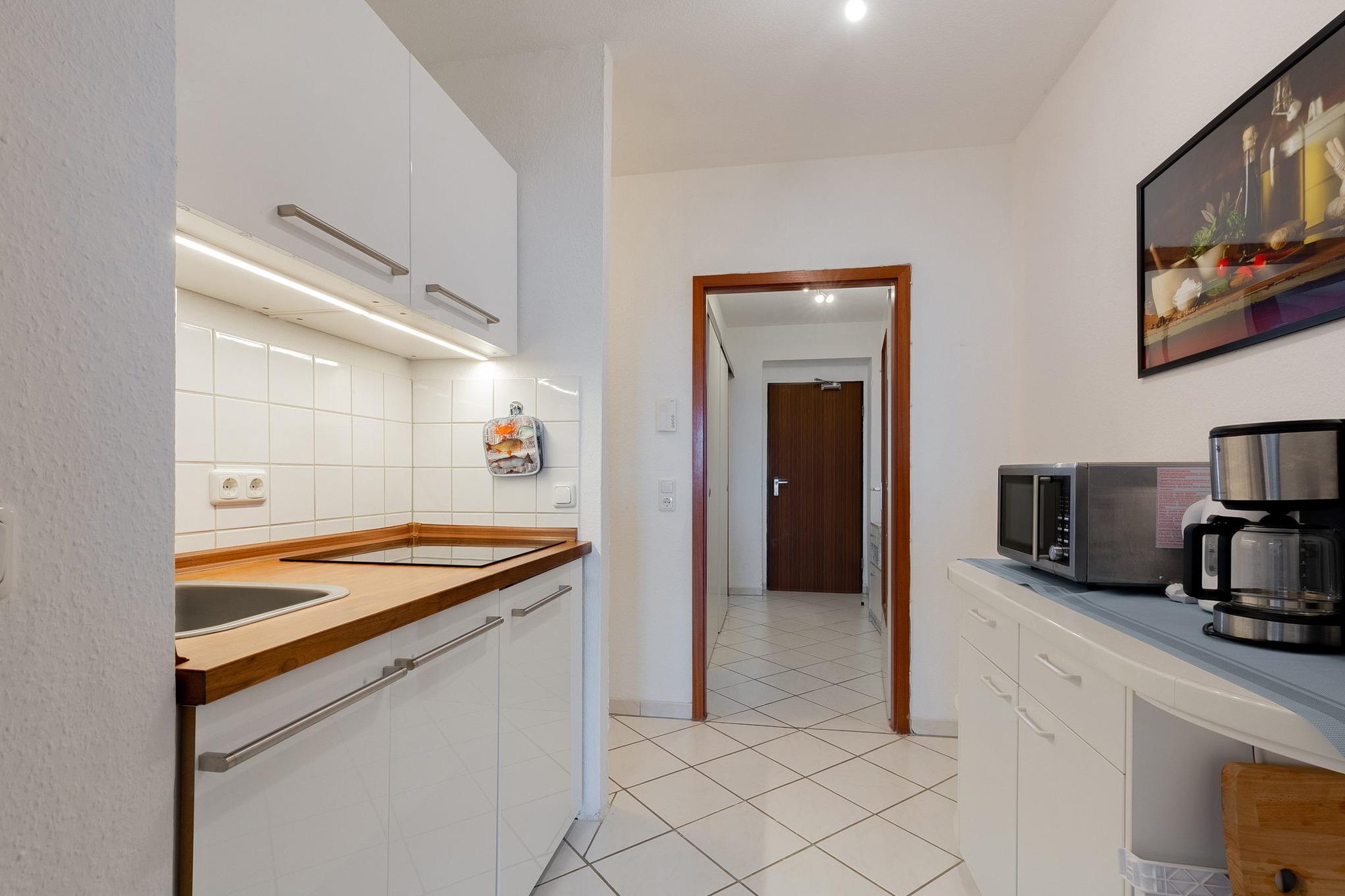 Kleine Küchenzeile mit 4-Platten-Cerankochfeld, Kühlschrank mit kleinem 3-Sterne Gefrierfach. Ein Toaster, eine Kaffeemaschine und ein Wasserkocher stehen ebenfalls zur Verfügung.