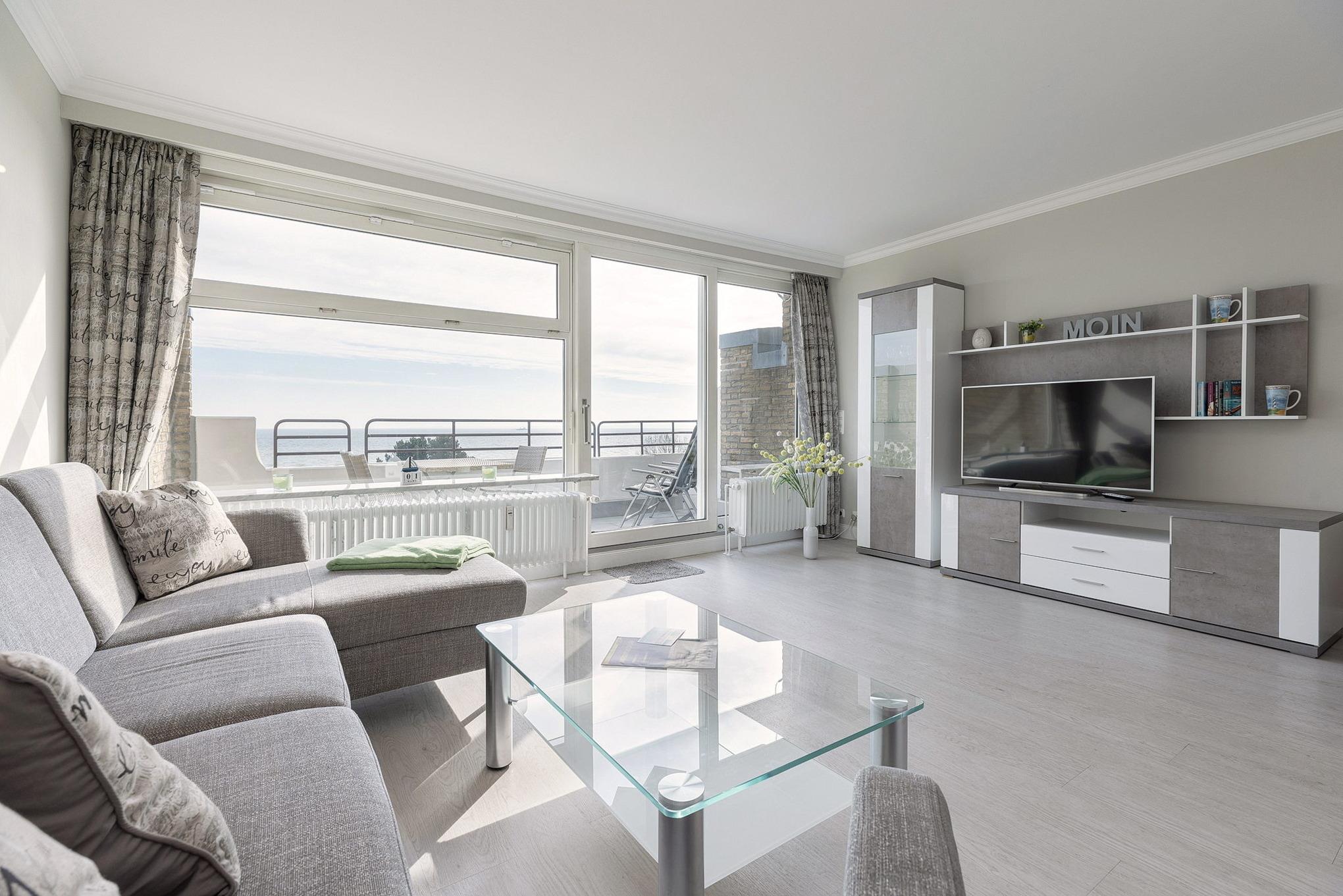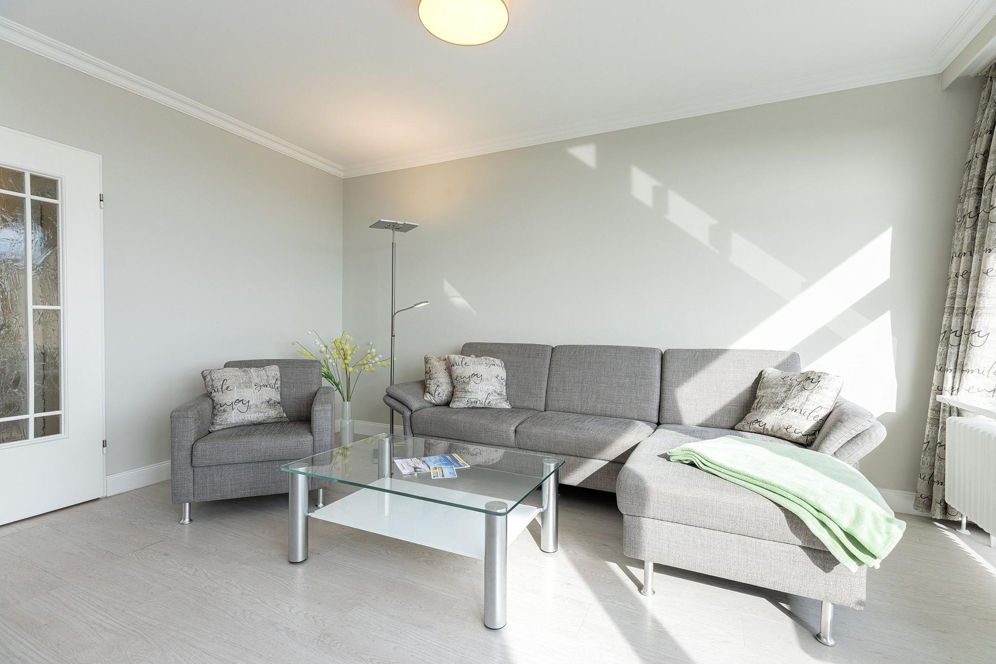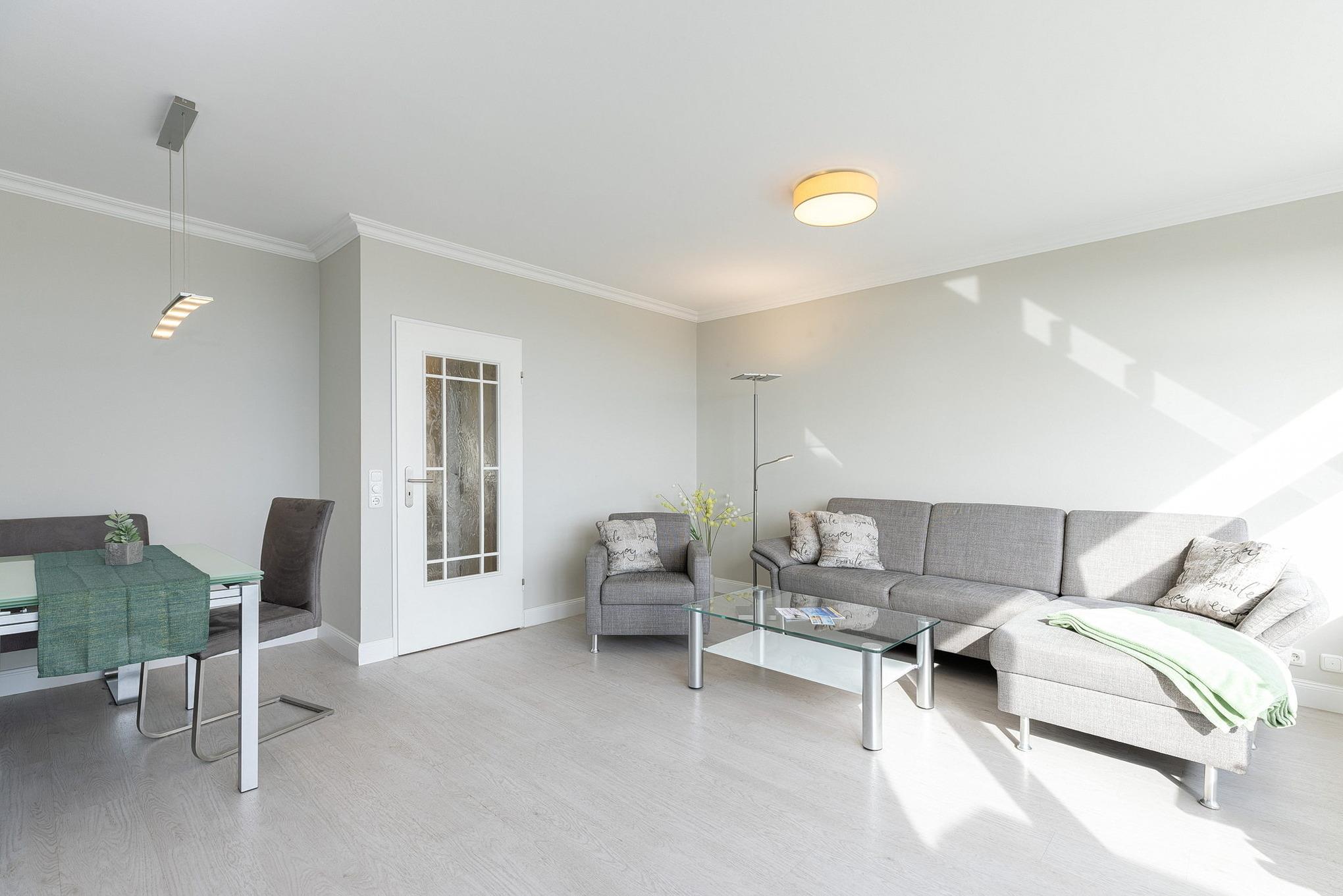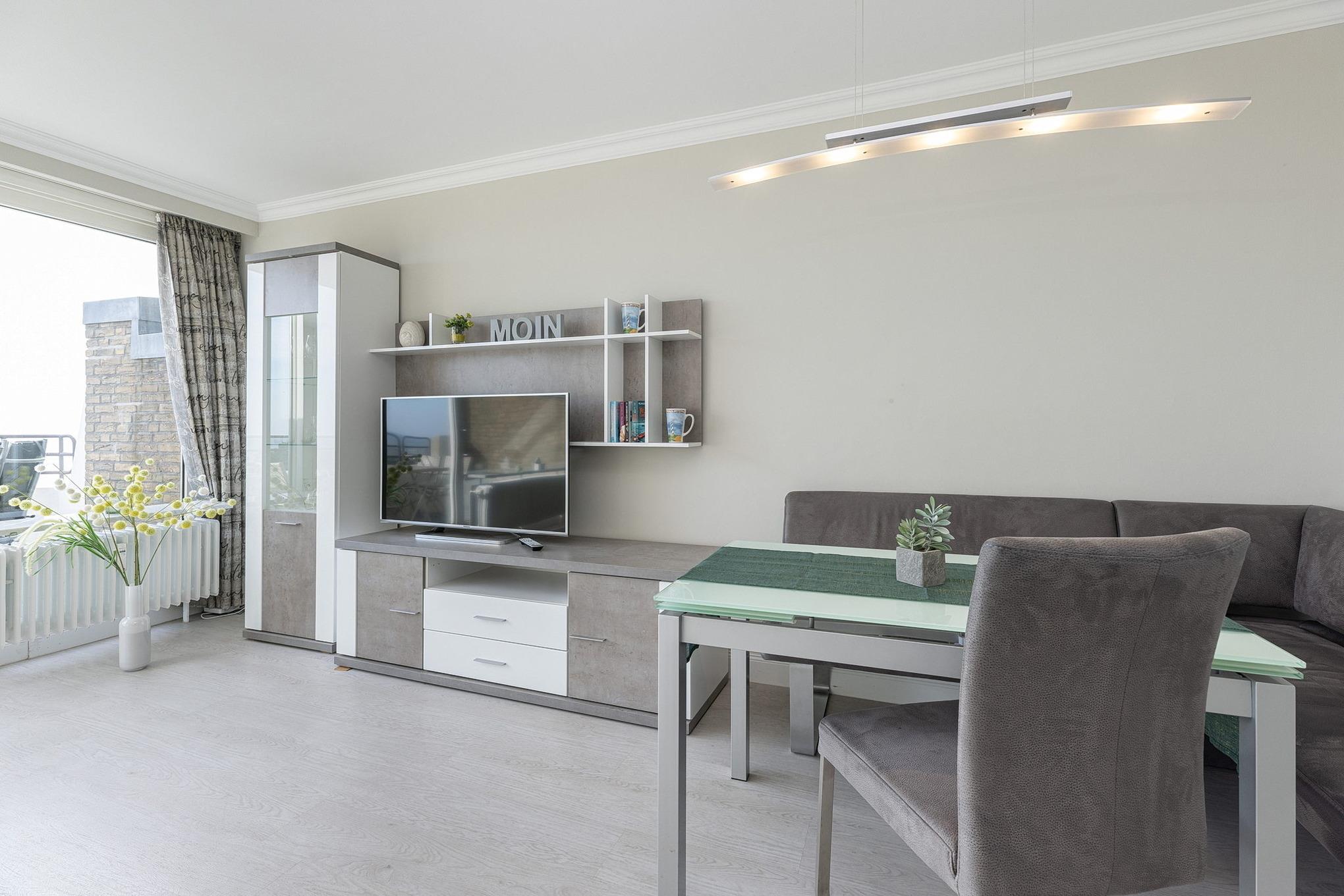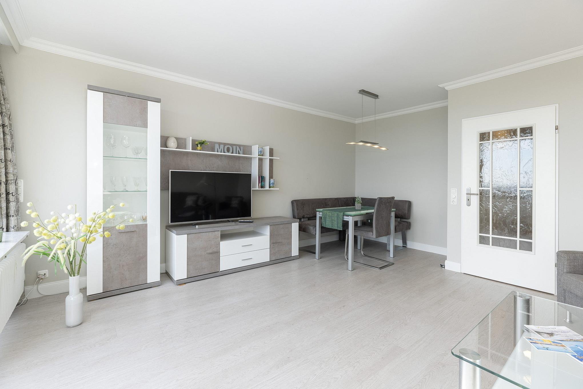 Das helle, freundliche und großzügige Wohn- und Esszimmer mit direktem Zugang zum Balkon mit Markise ist mit einer Eckcouch, einem Couchtisch und einem Essplatz für 4 Personen ausgestattet. Zur Unterhaltung steht ein Flachbildschirm zur Verfügung. Das Wohn- und Esszimmer ist mit Laminat ausgelegt.