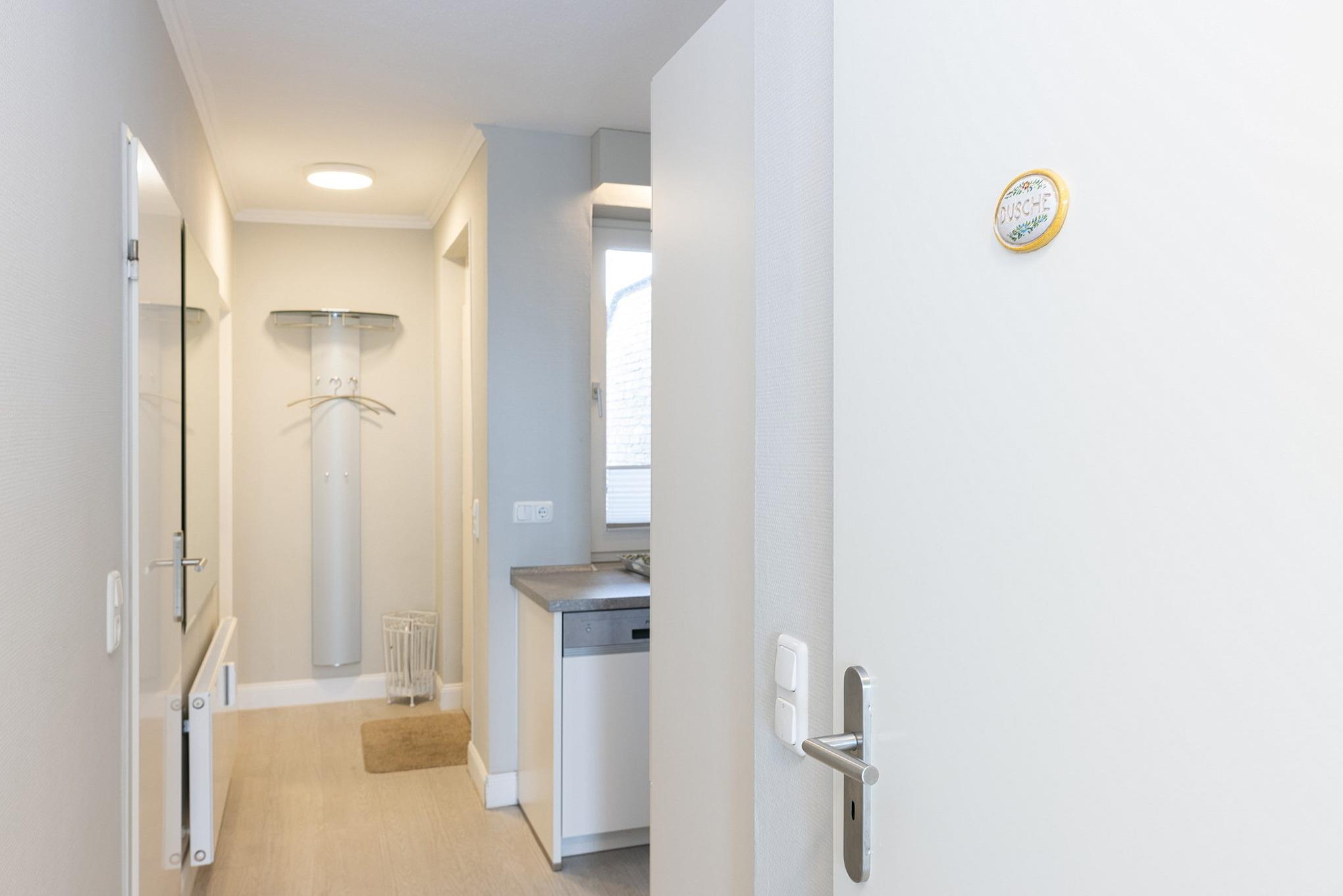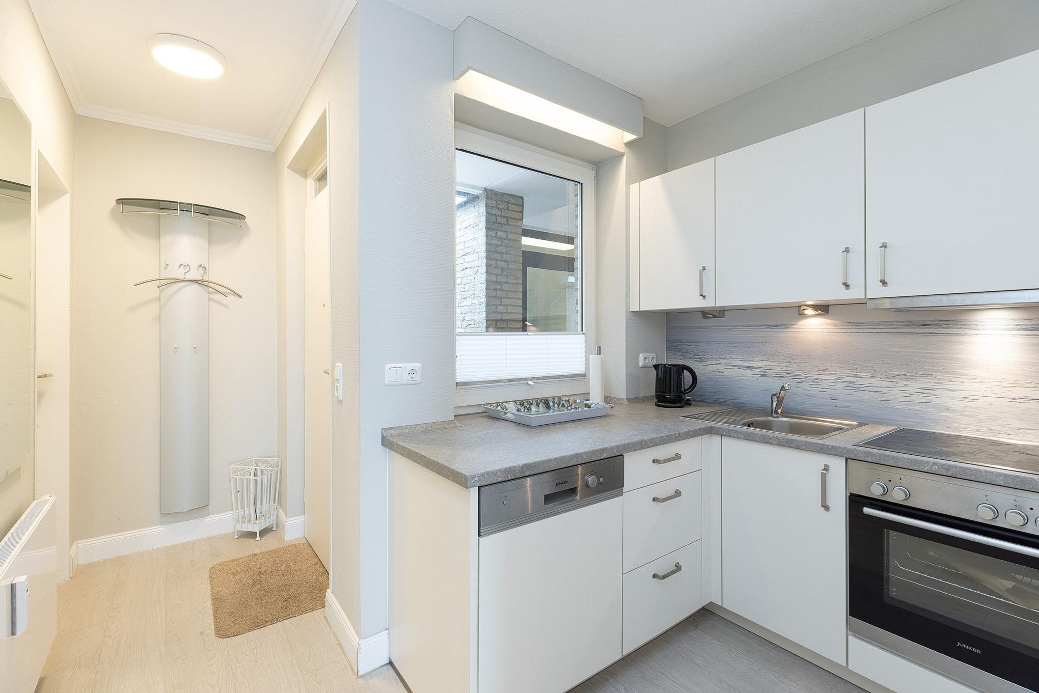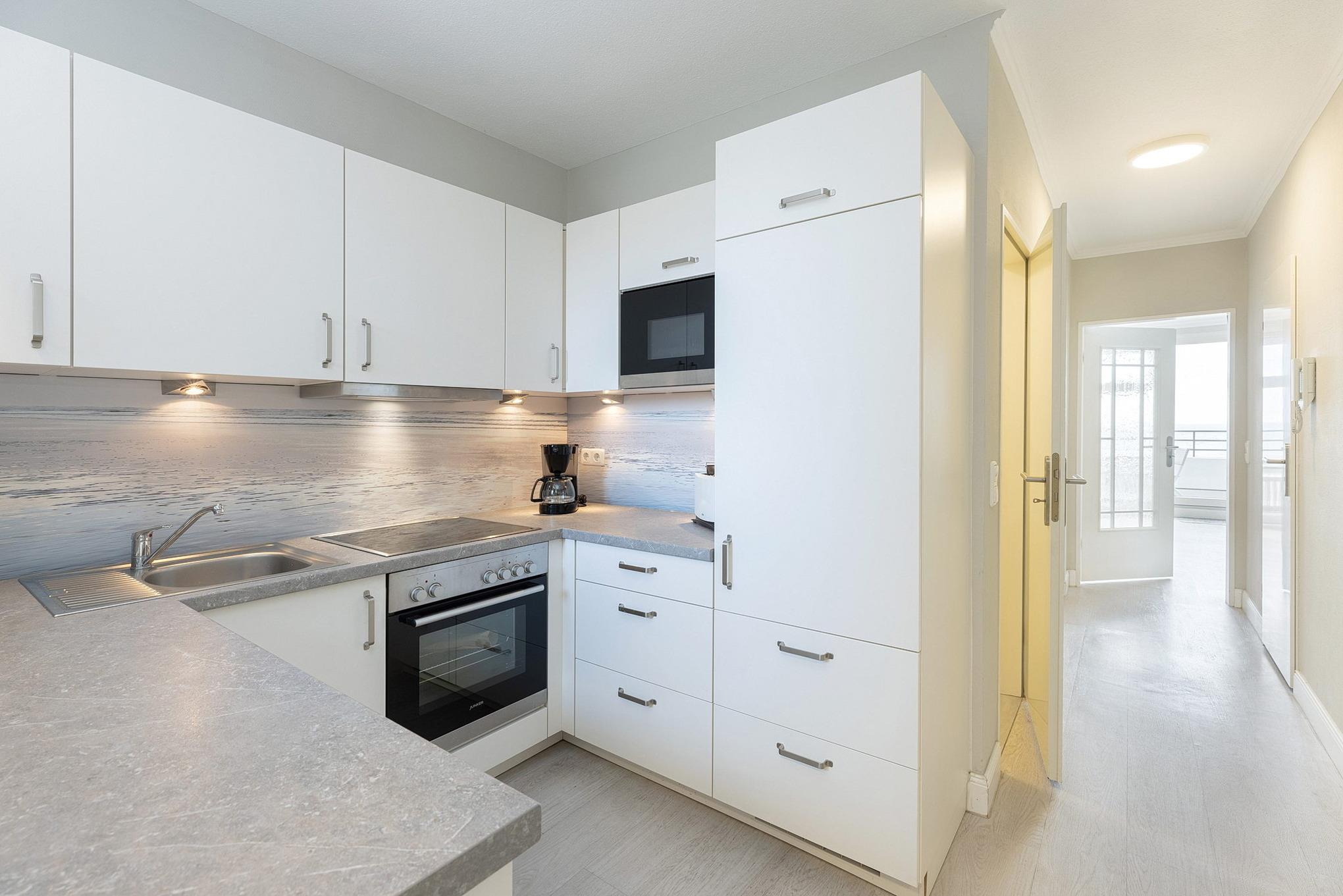 Separate, komplett ausgestattete Küche mit Fenster zum Laubengang. Die Küche ist mit einem 4-Platten E-Herd mit Backofen, Spülmaschine, Kühlschrank, einer Mikrowelle, Kaffeemaschine, Wasserkocher und Toaster ausgestattet.