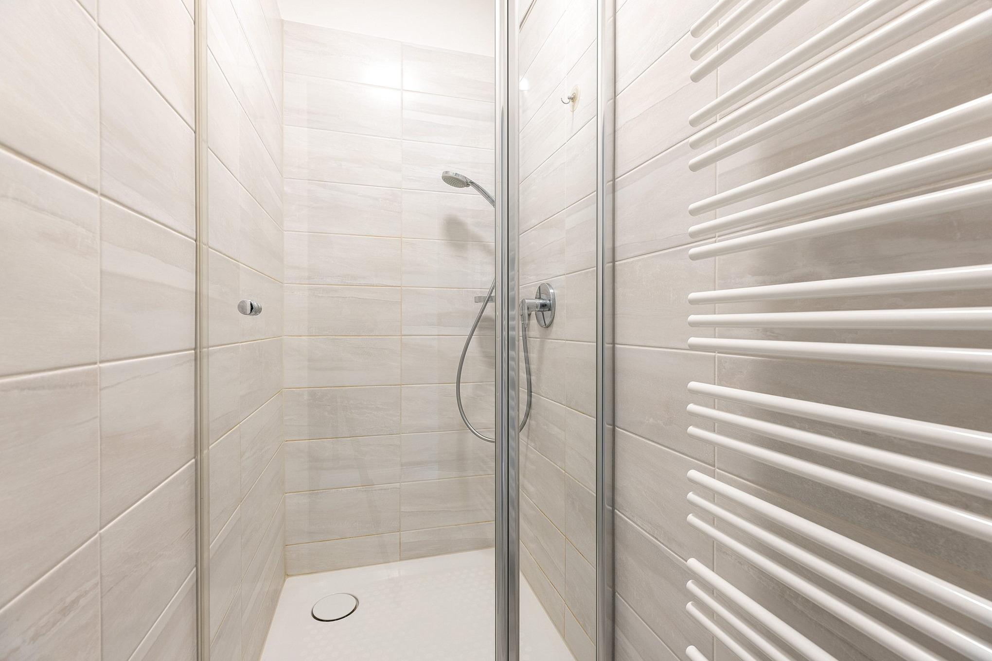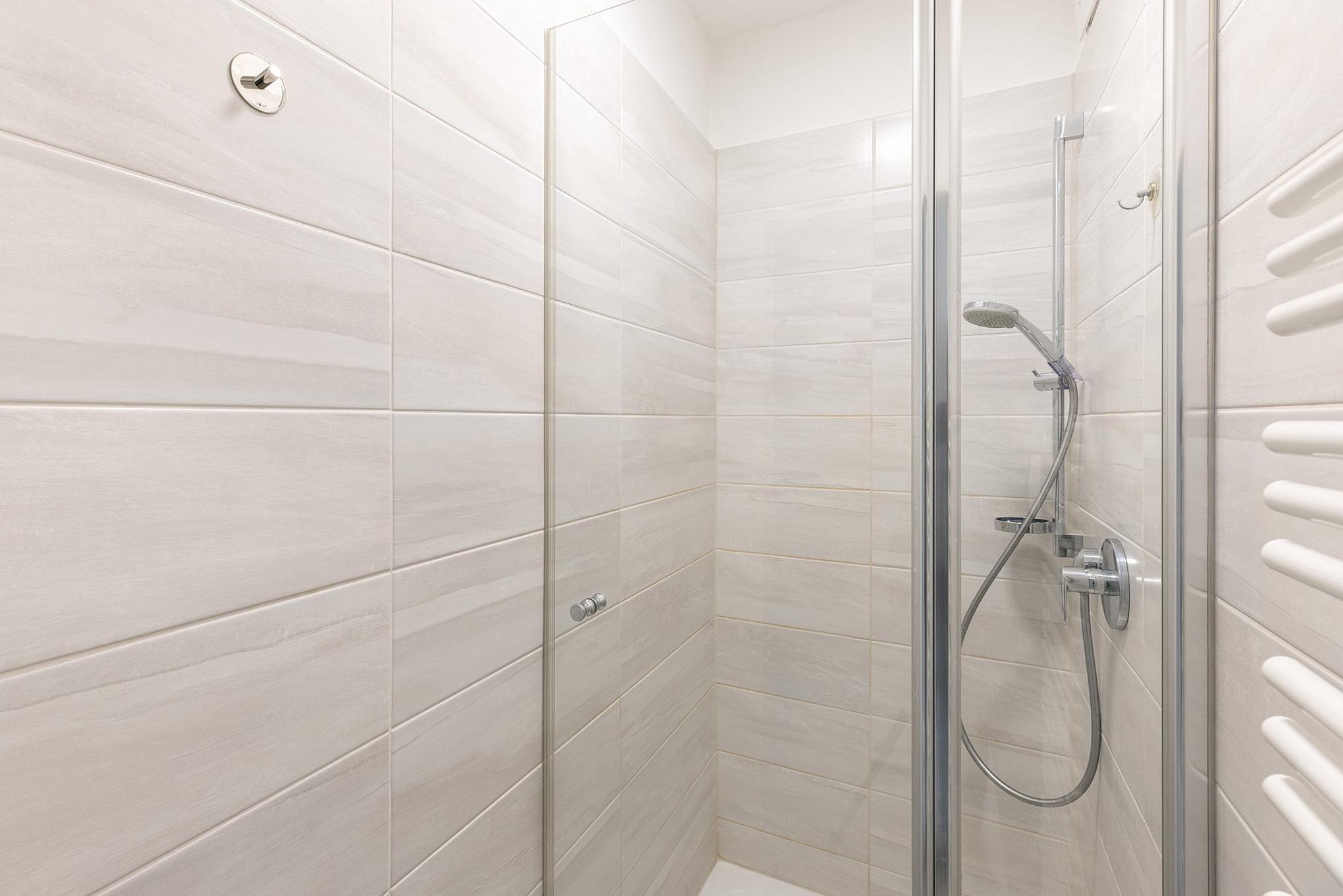 Gepflegtes, gefliestes Bad mit Dusche, WC und Waschbecken.