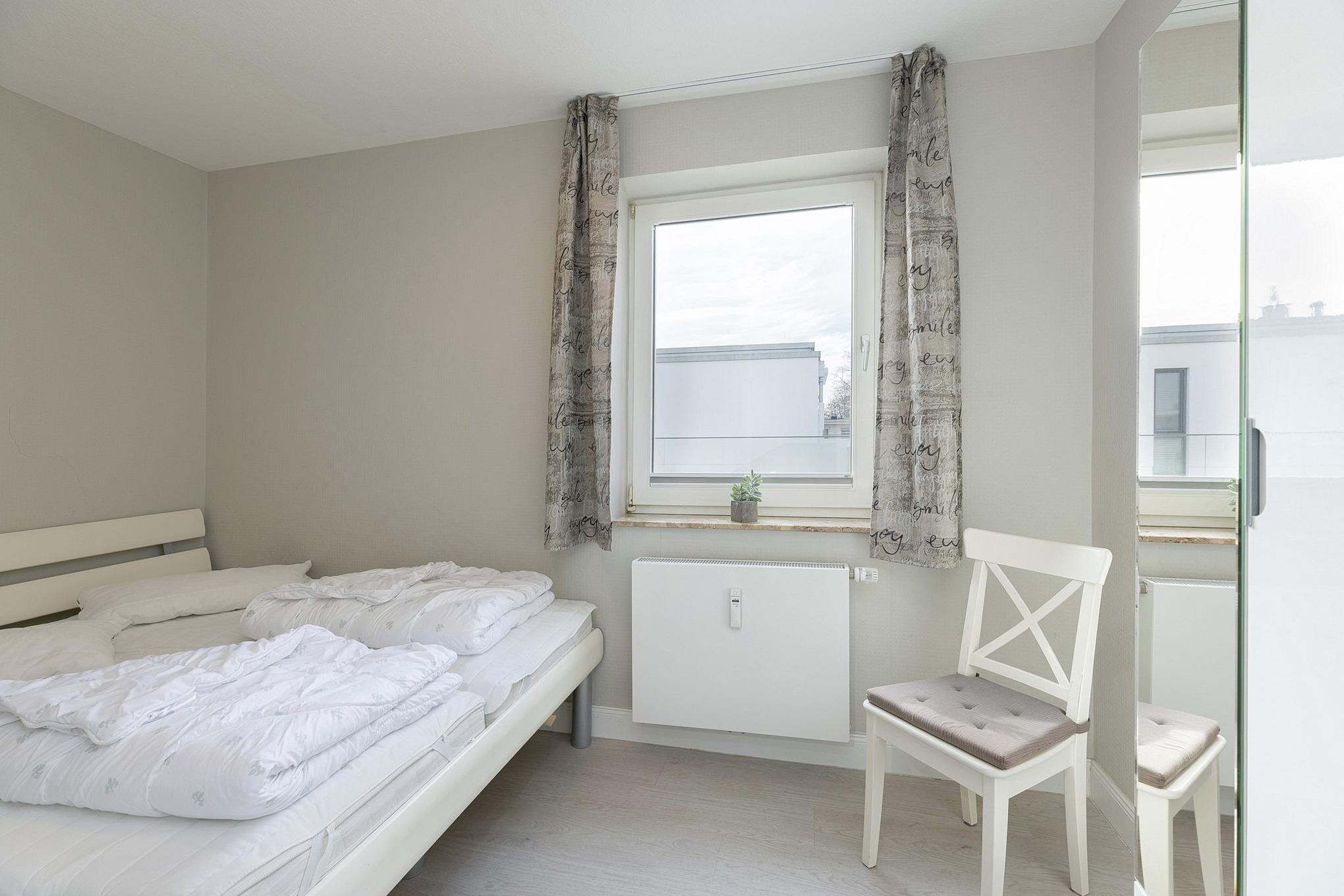 Das separate Kinderzimmer ist mit 2 Einzelbetten, einem großen Kleiderschrank sowie einem Nachttisch ausgestattet. Das Fenster lässt sich durch einen Vorhang und einem Plissee etwas verdunkeln. Das Kinderzimmer ist mit Laminat ausgelegt.