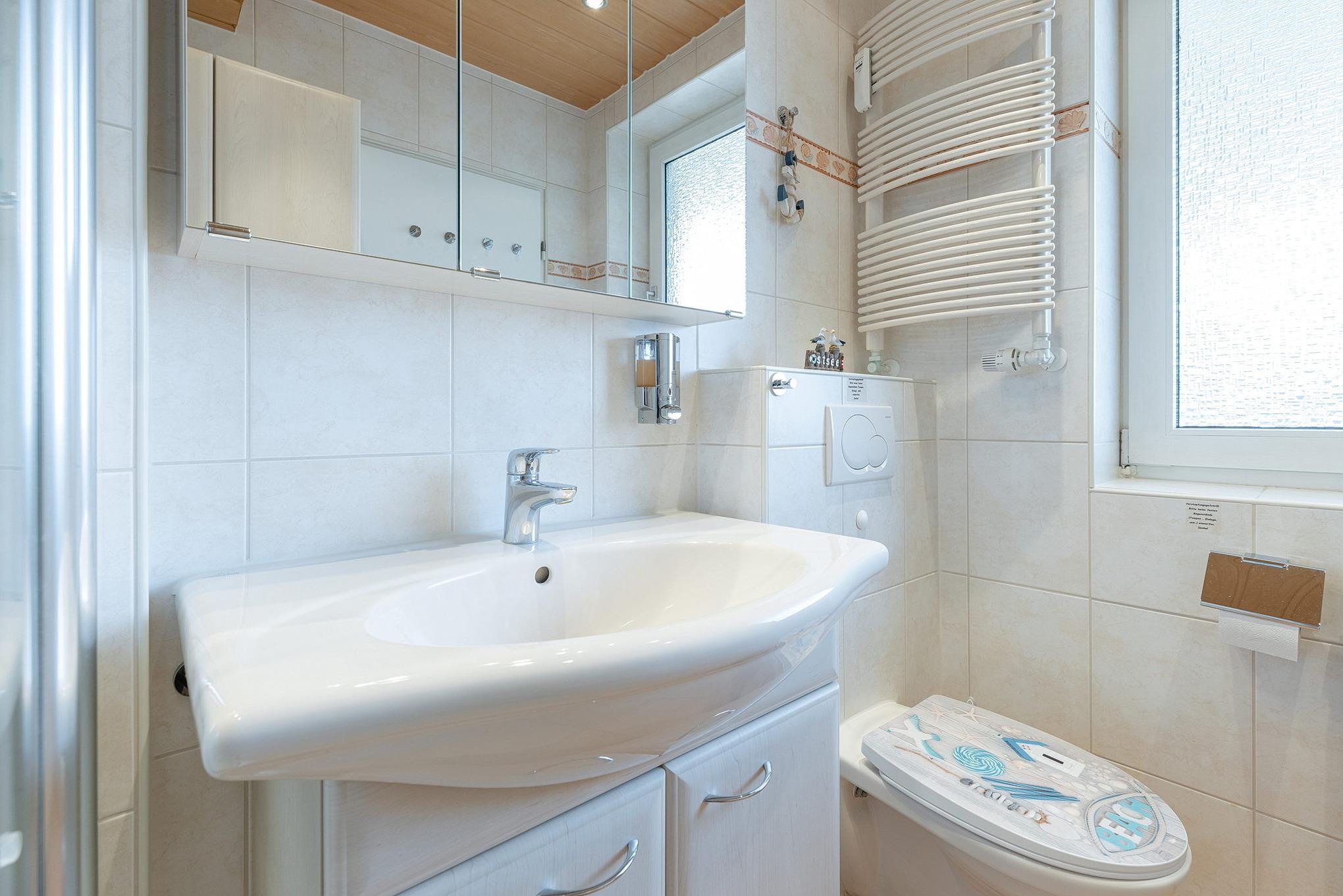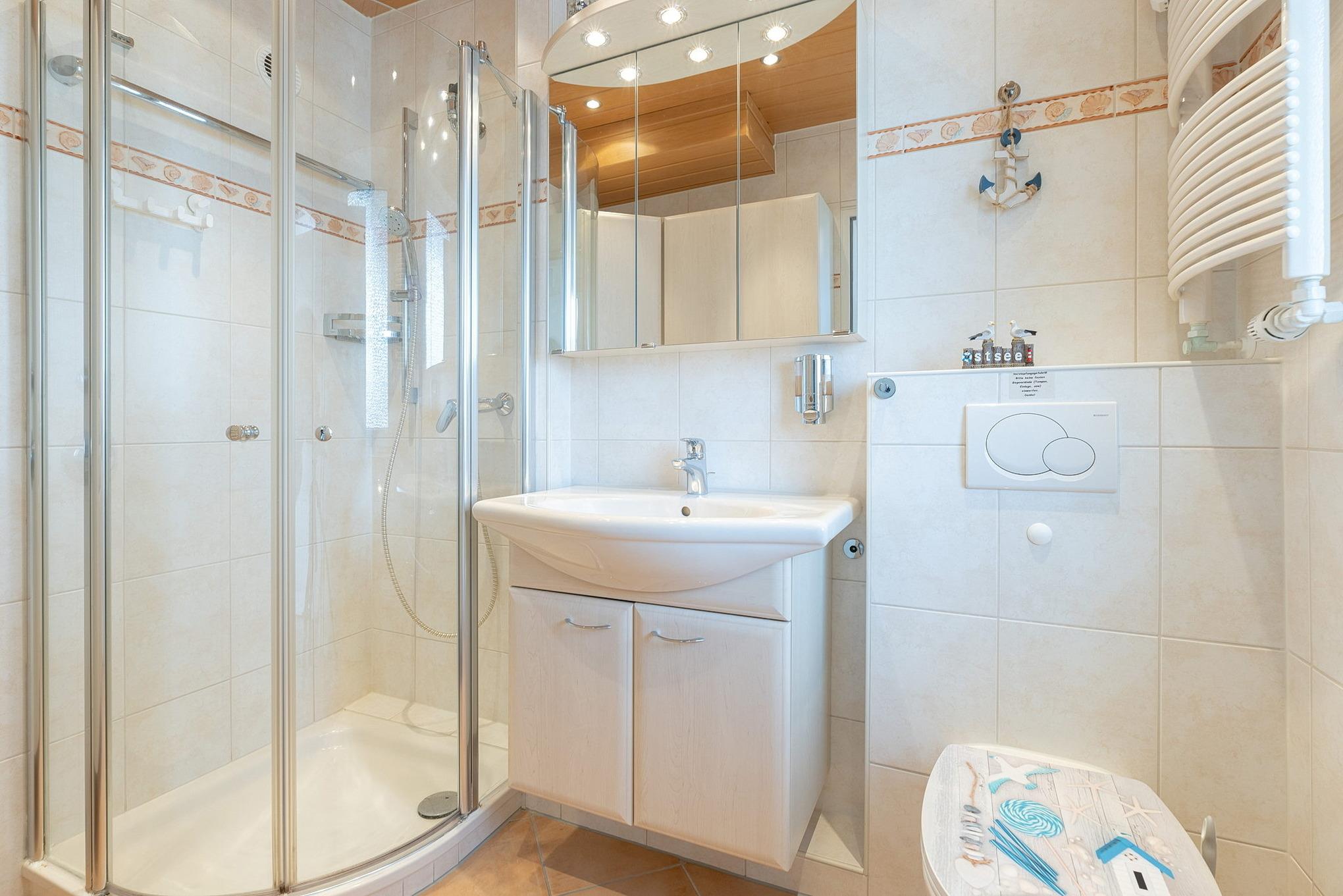 Freundlich helles Badezimmer mit Dusche, WC und Waschbecken.
