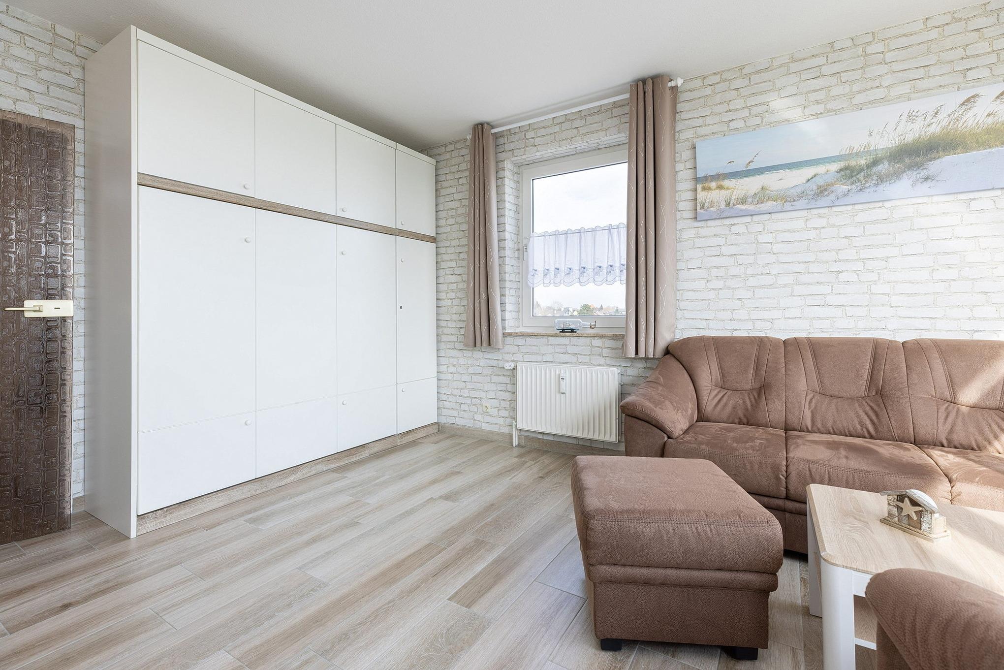 Gemütlicher Wohn- und Schlafbereich mit direktem Zugang zum schönen Balkon mit direktem Meerblick. Das Zimmer ist mit einem Schrankbett (2x80x200cm) sowie einem 3er Sofa, 1 Sessel und 1 Hocker ausgestattet. Zur Unterhaltung stehen ein Flachbild-LED-TV, ein DVD-Player und ein Radio zur Verfügung. Das Wohnzimmer ist gefliest und lässt sich durch Vorhänge verdunkeln.