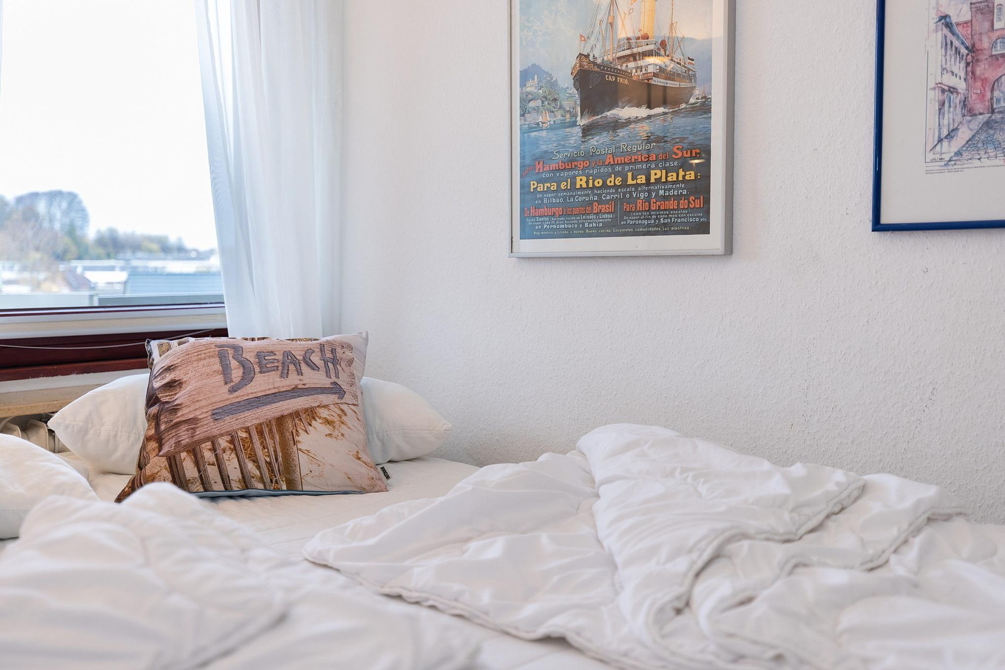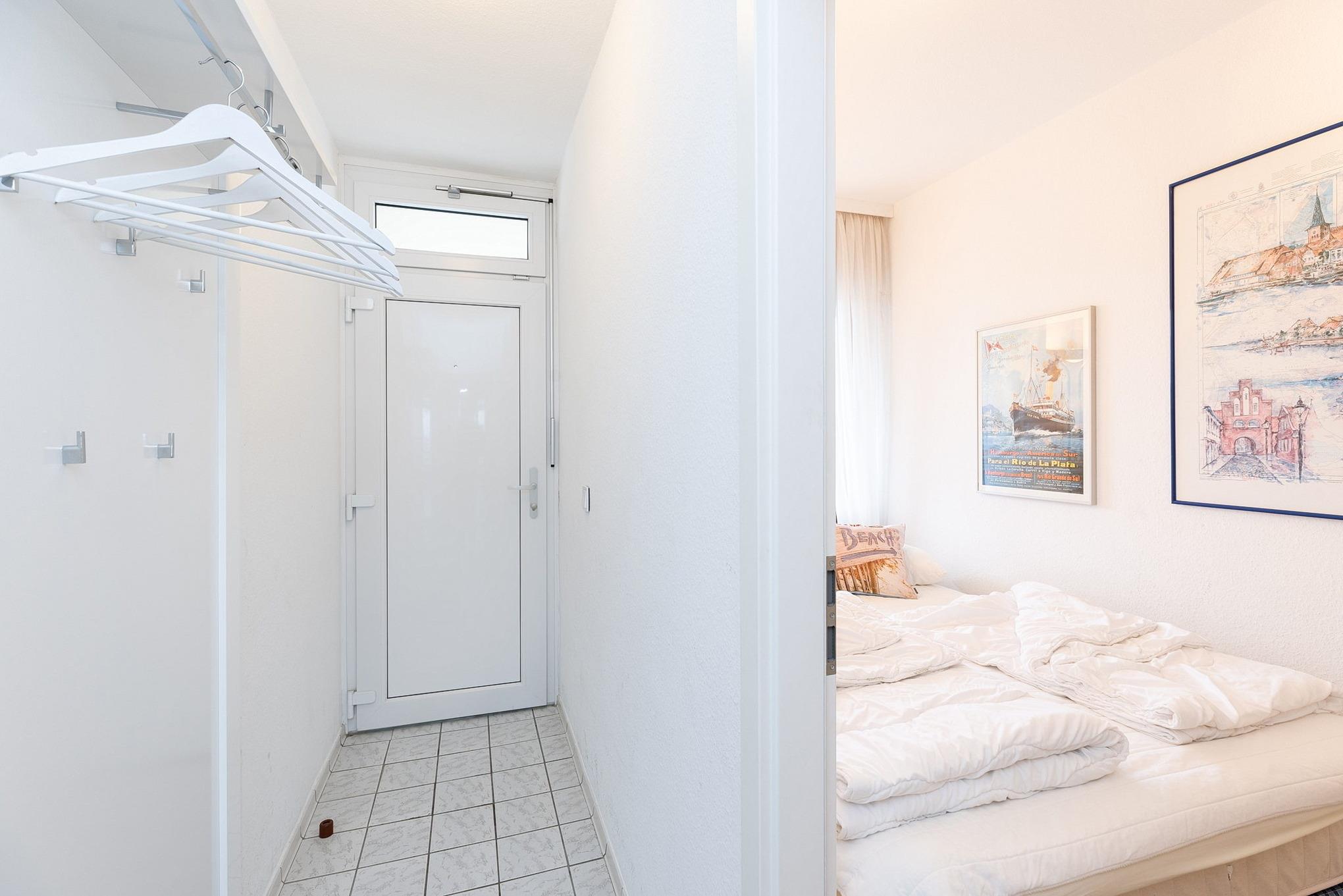 Kleines separates Zimmer mit Doppelbett (140 x 200 cm), kleiner Schrank, Laminatfußboden und Fenster zum Laubengang.
