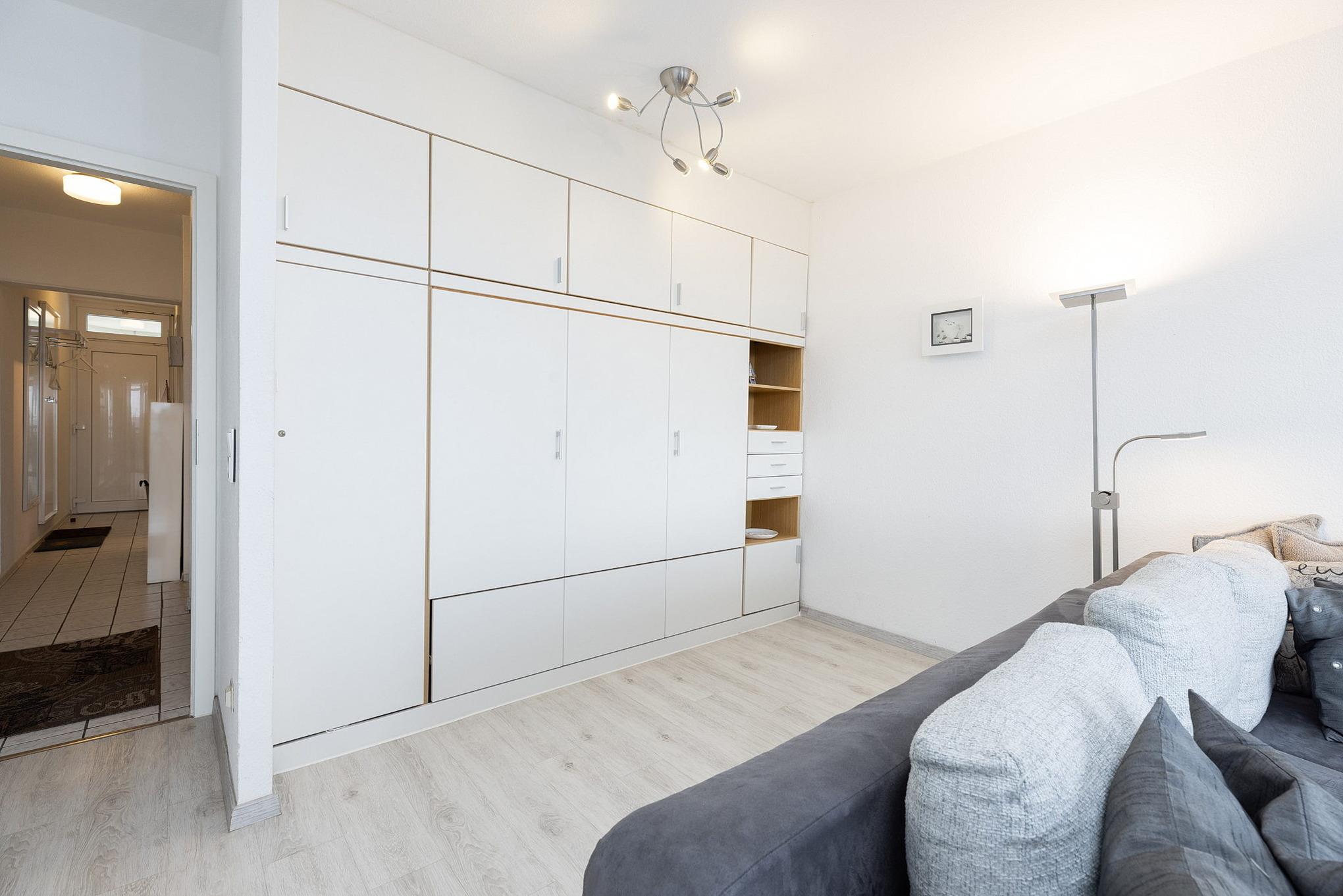Freundliches, helles Wohn- und Schlafzimmer mit Laminatboden. Im Wohn-/Schlafzimmer befinden sich eine Eck-Couch, ein Couch-Tisch, ein Essplatz für 3 Personen, ein Schrankbett (2x 80x200 cm) sowie ein SAT-TV (Flachbildschirm) und ein Radio. Das Zimmer lässt sich mit elektrischen Rollladen verdunkeln. Direkter Zugang vom Wohn- und Schlafzimmer zum Balkon mit Aussicht auf das Meer.