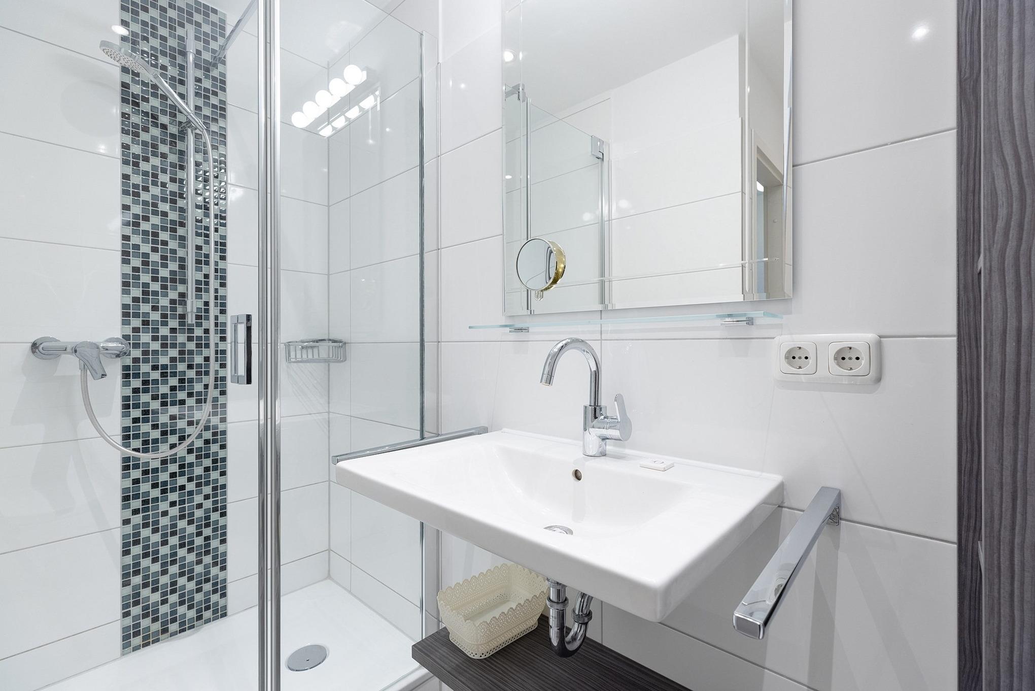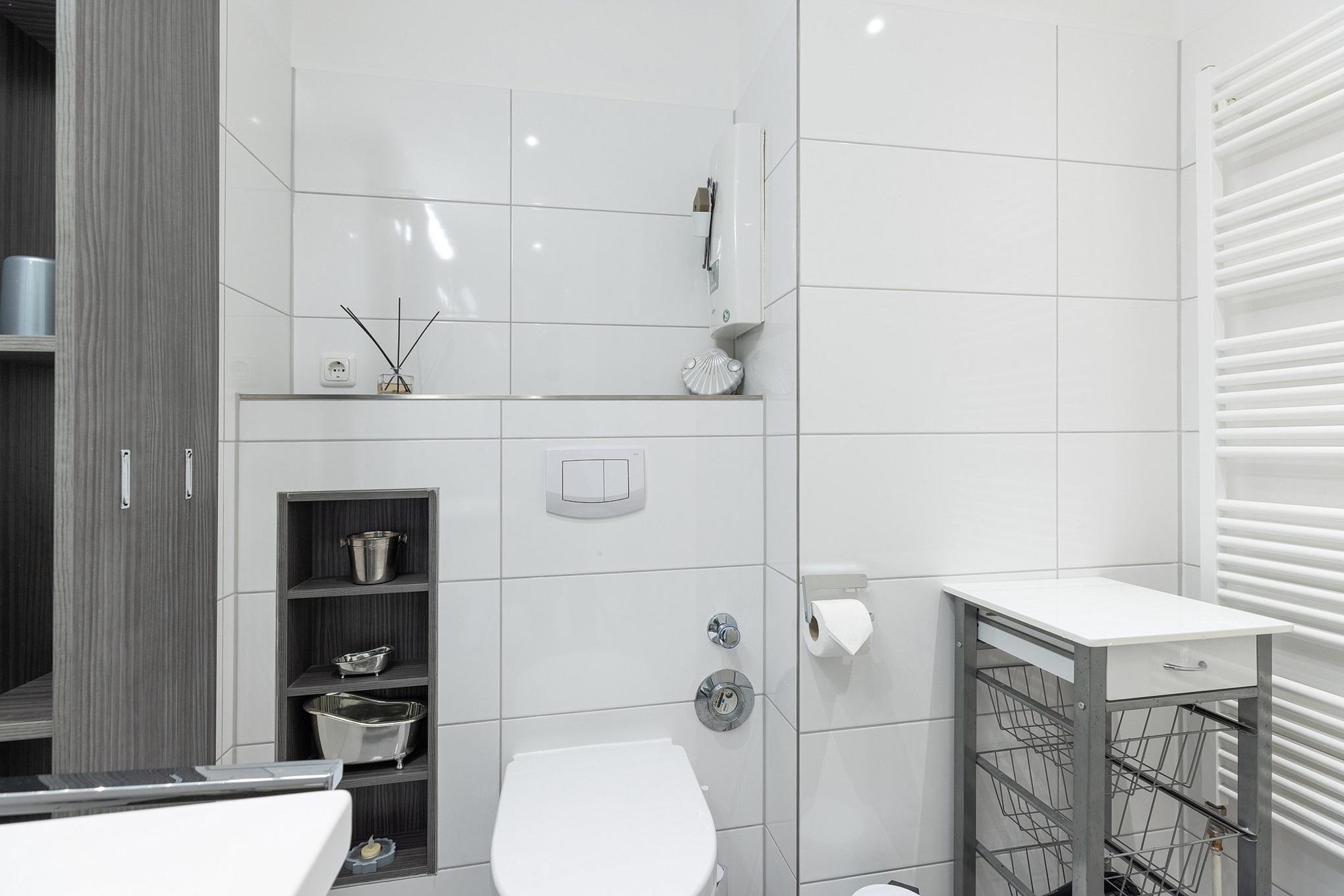 Modernes, hell gefliestes Bad mit Dusche, WC und Waschbecken.