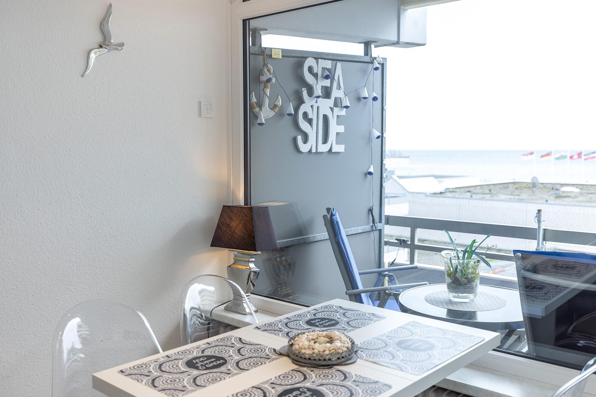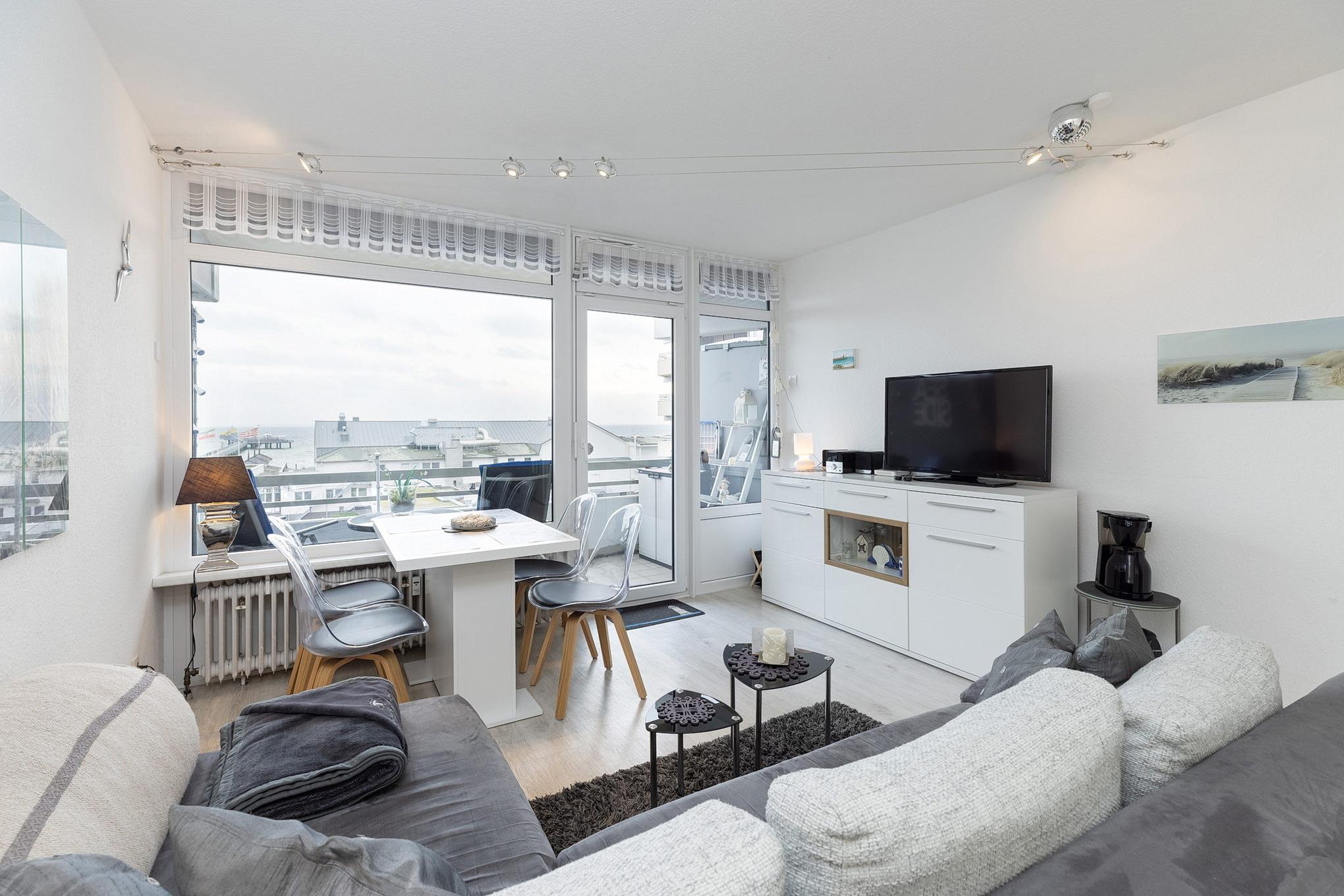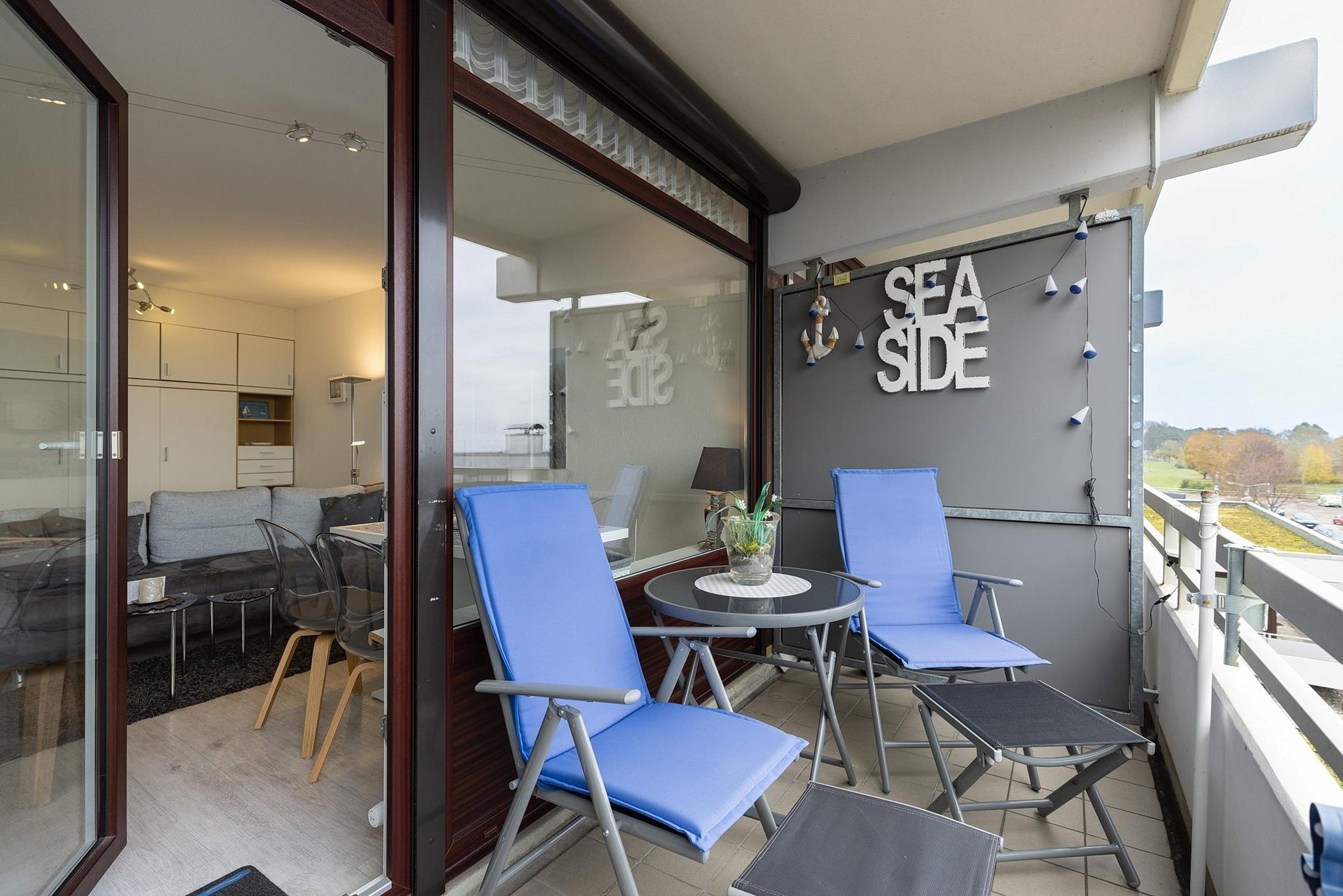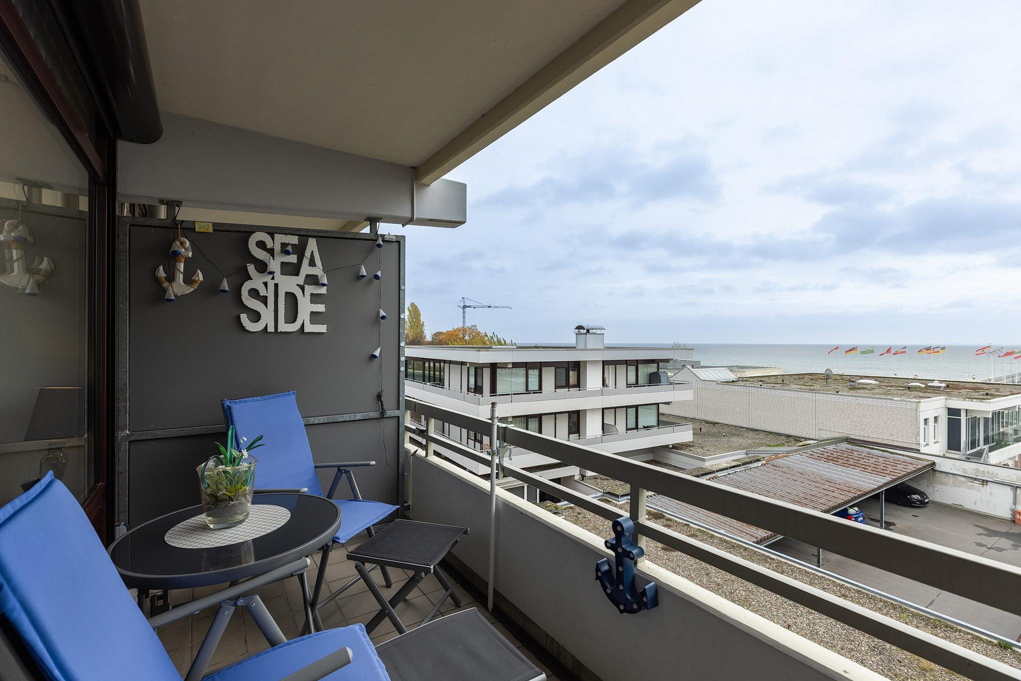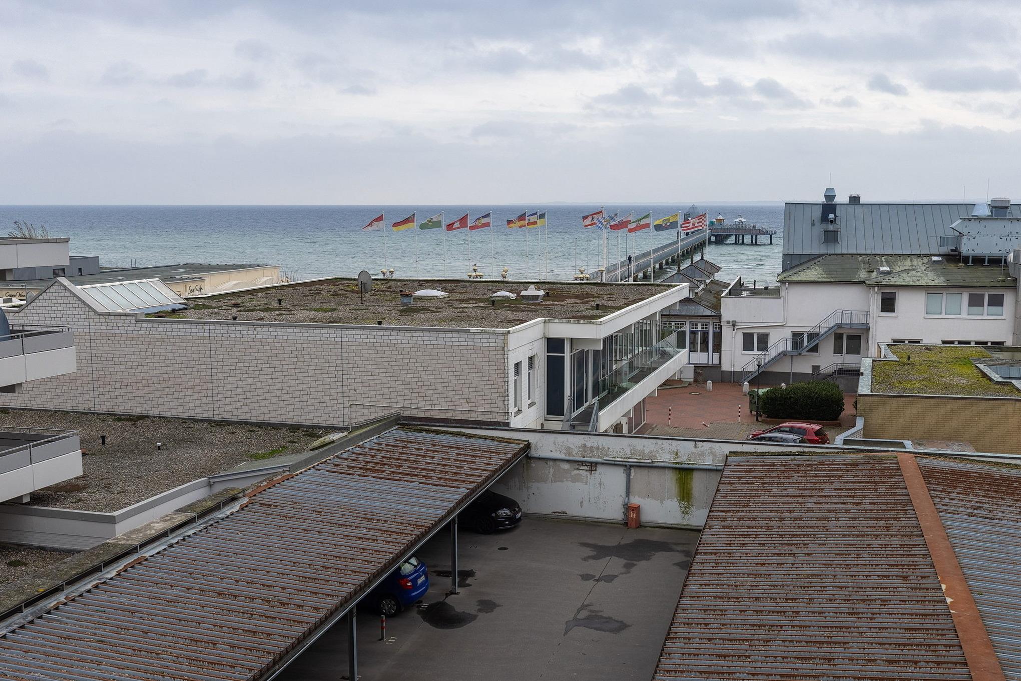 Balkon in südliche Richtung mit Seeblick und Blick auf die Ostsee. Eigener PKW-Stellplatz (max. Höhe 2,00 m), Waschmaschine und Trockner gegen Gebühr.