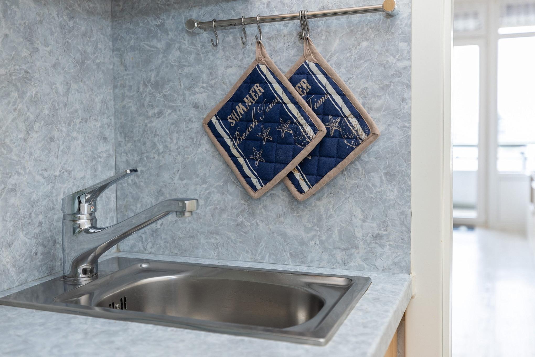 Moderne, Pantry-Küche im Flur. Die Küche ist mit einem 2-Platten Cerankochfeld, einer Spülmaschine, einem Kühlschrank mit kleinem 3-Sterne Gefrierfach, Microwelle, einer Kaffeemaschine, einem Toaster und einem Wasserkocher ausgestattet.