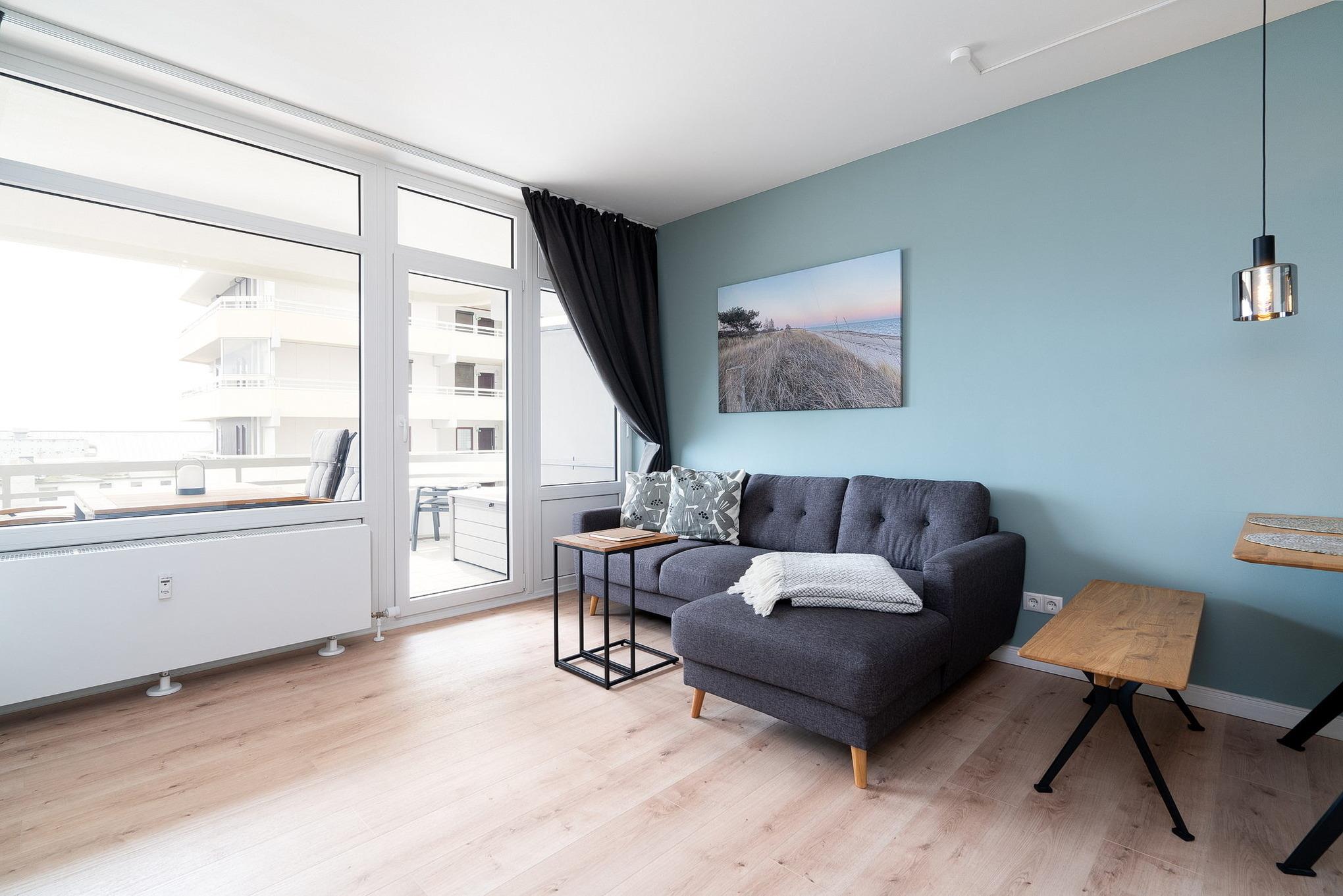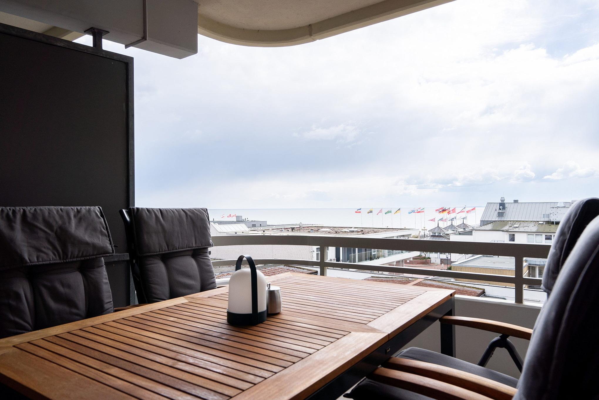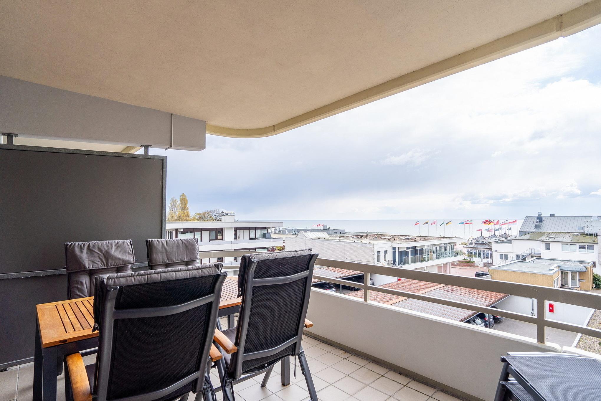 Balkon in südliche Richtung mit Blick auf die Ostsee. Eigener, schmaler PKW-Stellplatz (max. Höhe 1,90 m), Waschmaschine und Trockner gegen Gebühr.